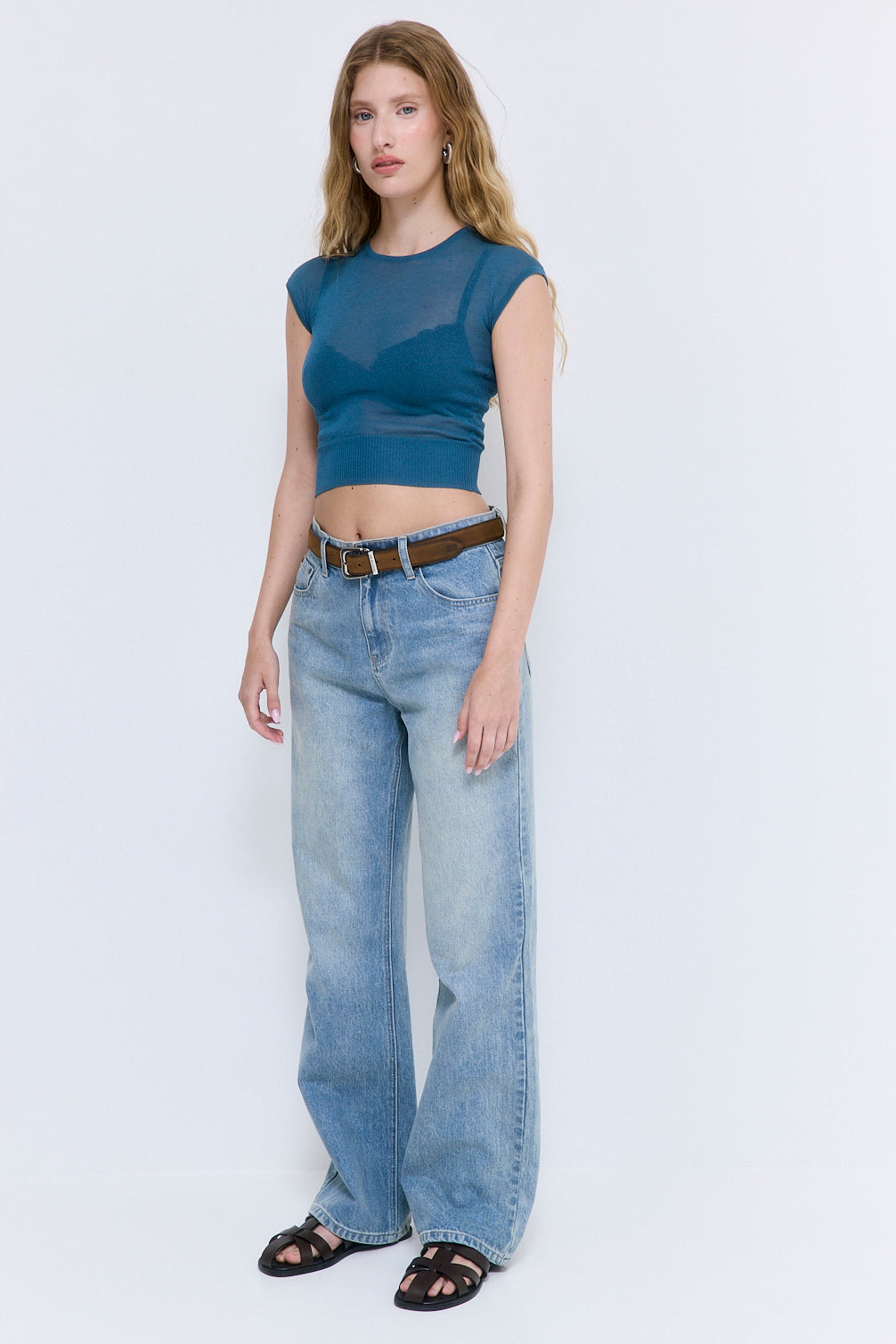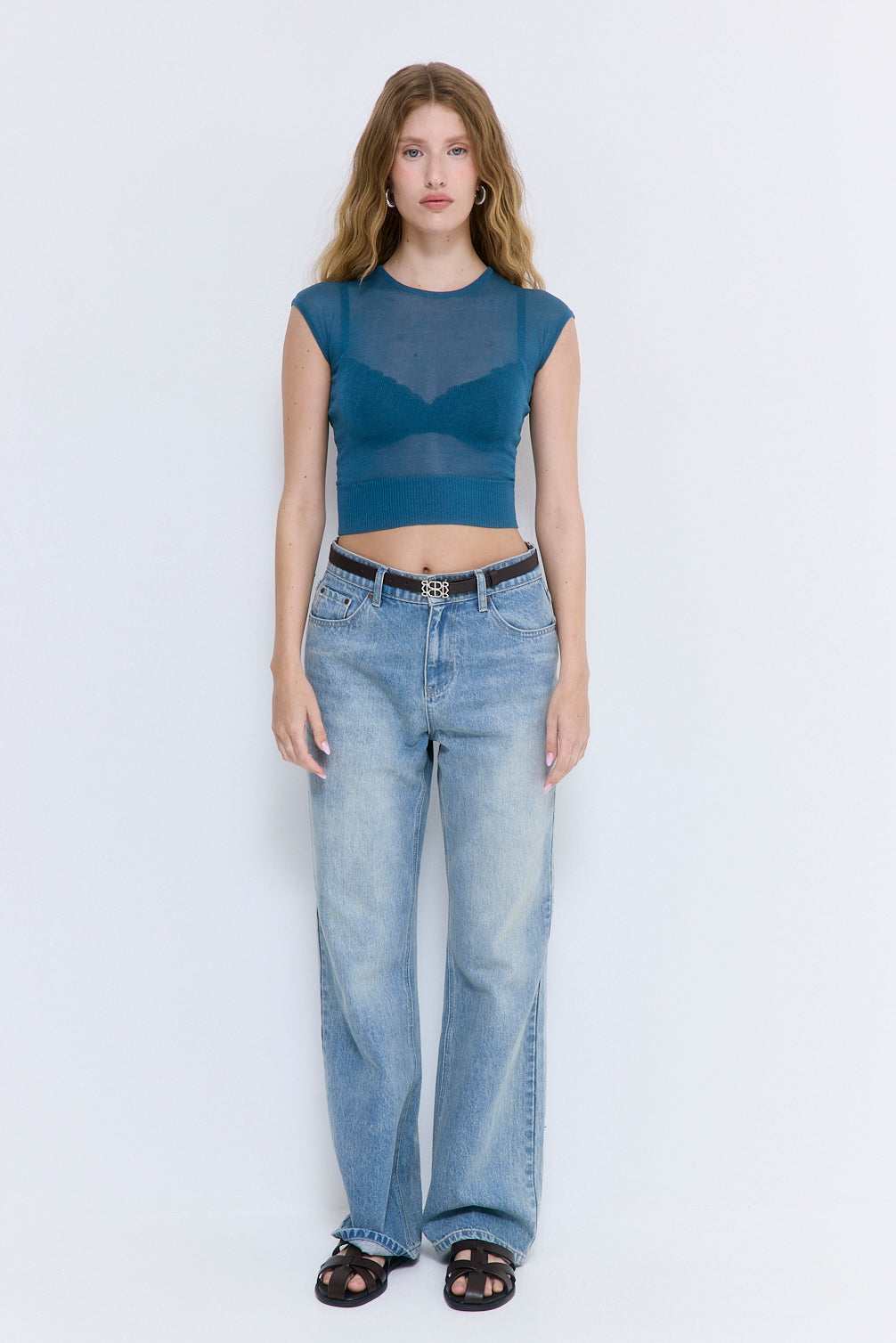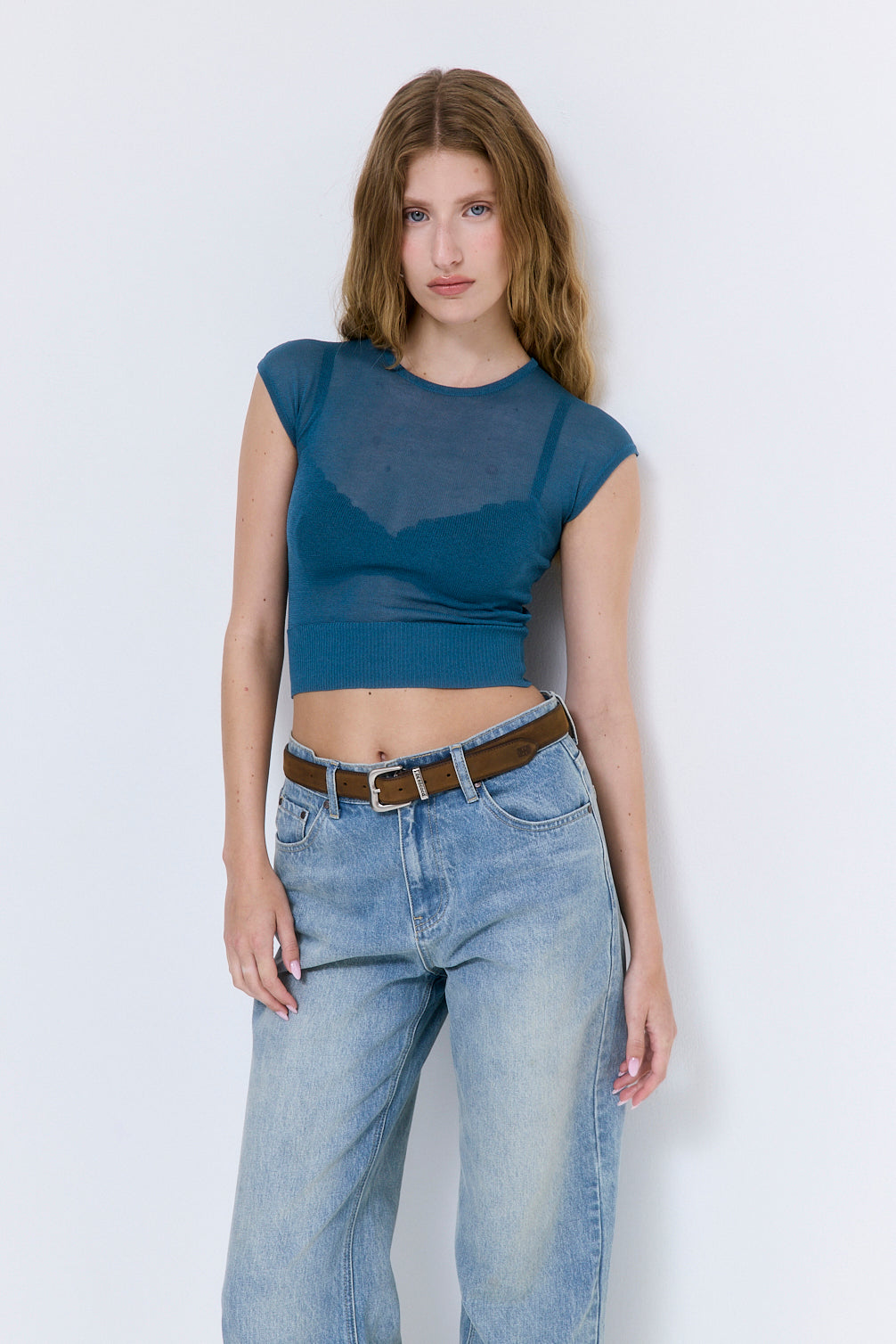 Our new Sheer Baby Tee is the ultimate day-to-night staple. Made from delicate sheer fabric for a light, airy feel. Cropped silhouette. Wide ribbed hem at the waist. Round neckline. Fully fashioned. Cap sleeves with ribbed cuffs. Style it with our capsule High Rise Relaxed Cotton Pants and chic Yvon Shoulder Bag for an effortlessly head-turning look.