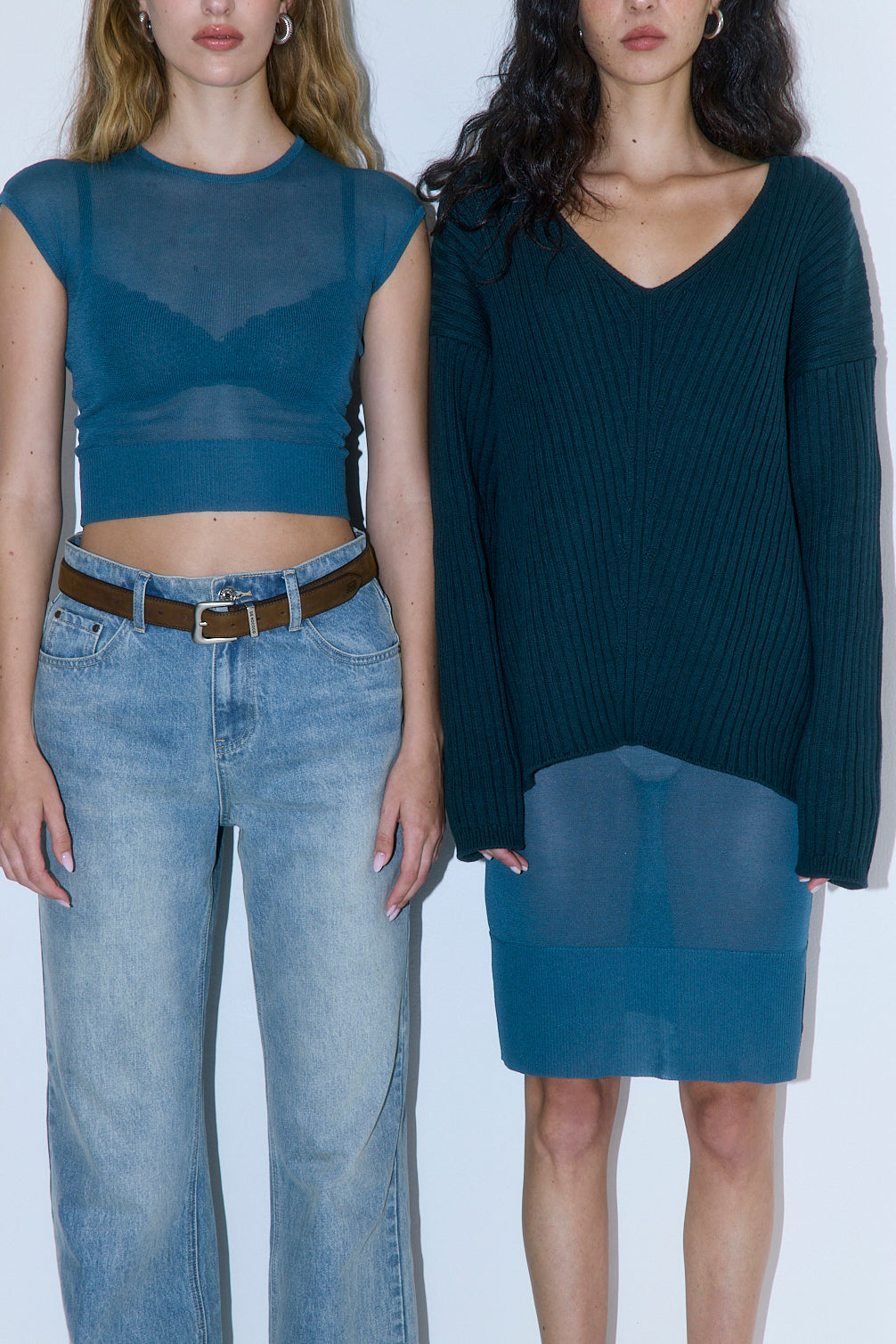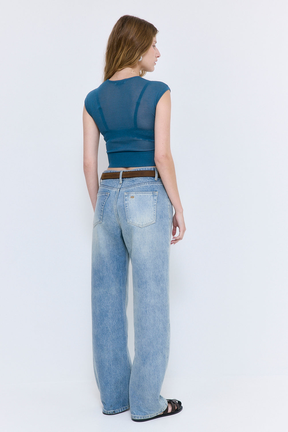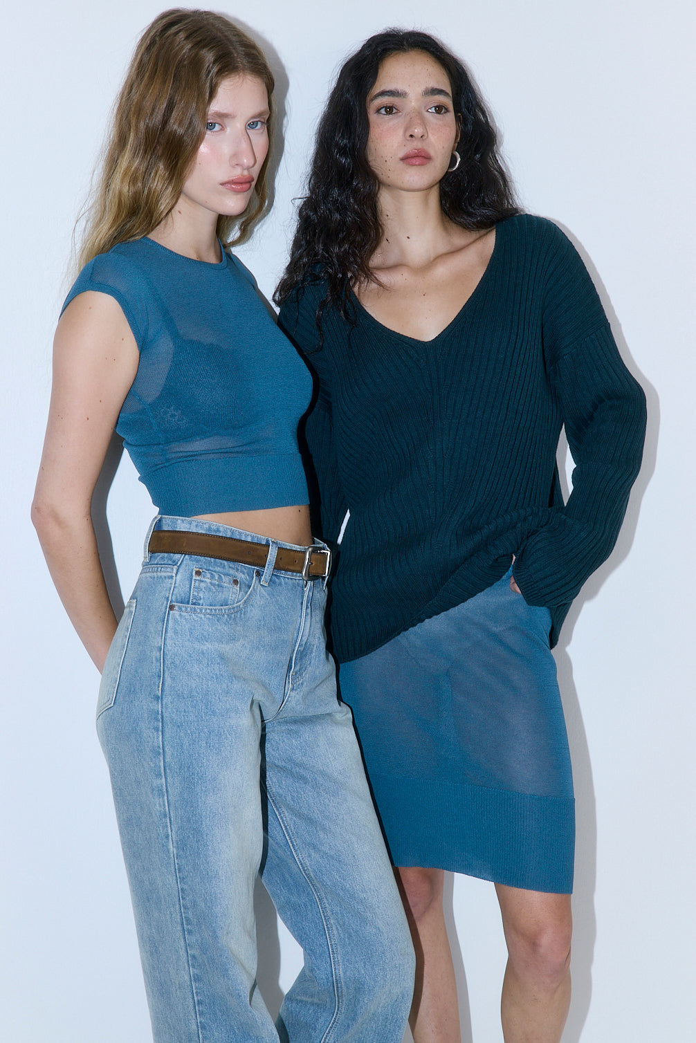 Our new Sheer Baby Tee is the ultimate day-to-night staple. Made from delicate sheer fabric for a light, airy feel. Cropped silhouette. Wide ribbed hem at the waist. Round neckline. Fully fashioned. Cap sleeves with ribbed cuffs. Style it with our capsule High Rise Relaxed Cotton Pants and chic Yvon Shoulder Bag for an effortlessly head-turning look.