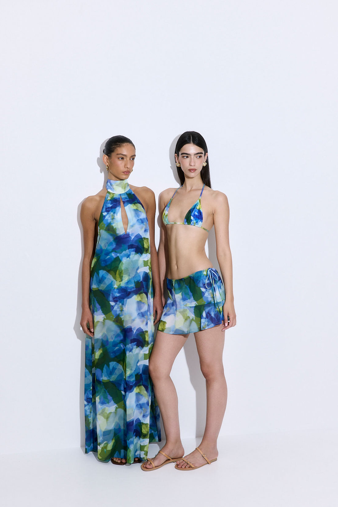 Our chiffon mini skirt is a dreamy statement piece for the season. Made from lightweight, airy chiffon fabric, it flows beautifully with every step, creating an ethereal silhouette. Mini length, perfect for summer in our iconic lagoon print. Adjustable drawstring sides for a customizable fit. Semi-sheer finish. Style it our Lenai top, our beautiful Lotus bottom and finish the look with our signature claw clip for the coolest beach look.
