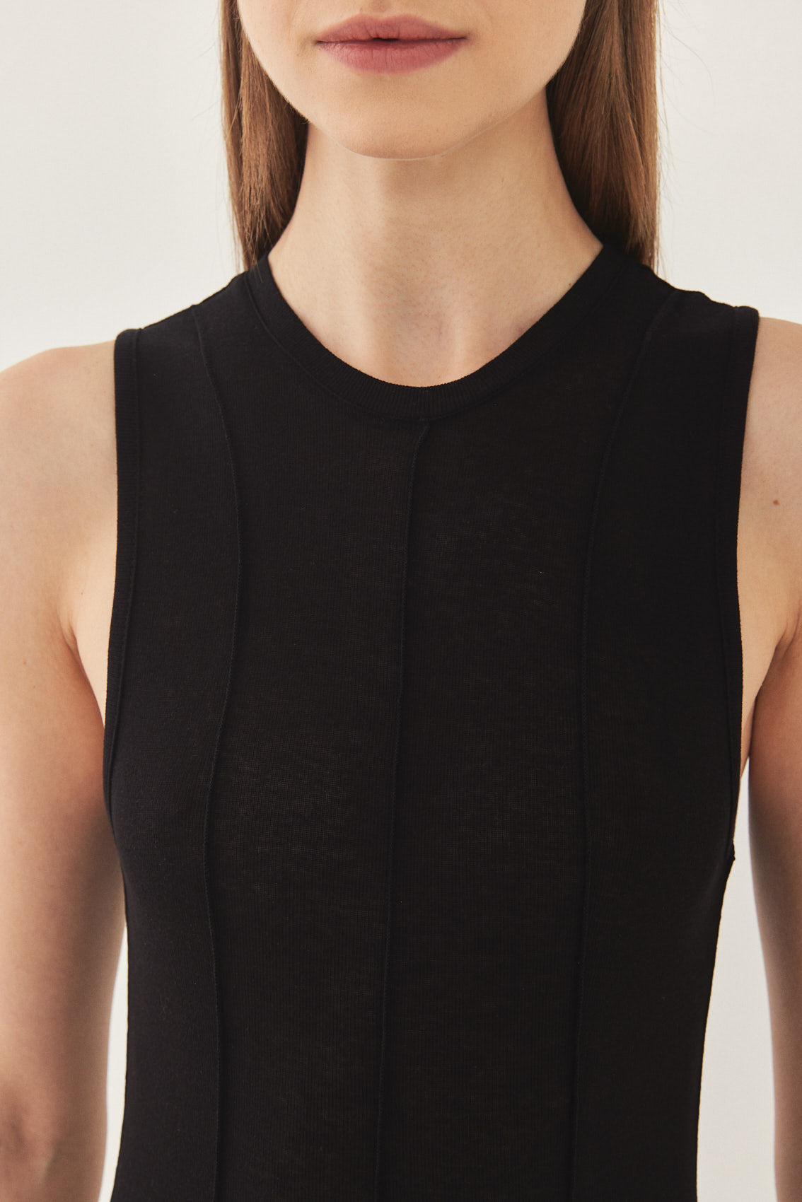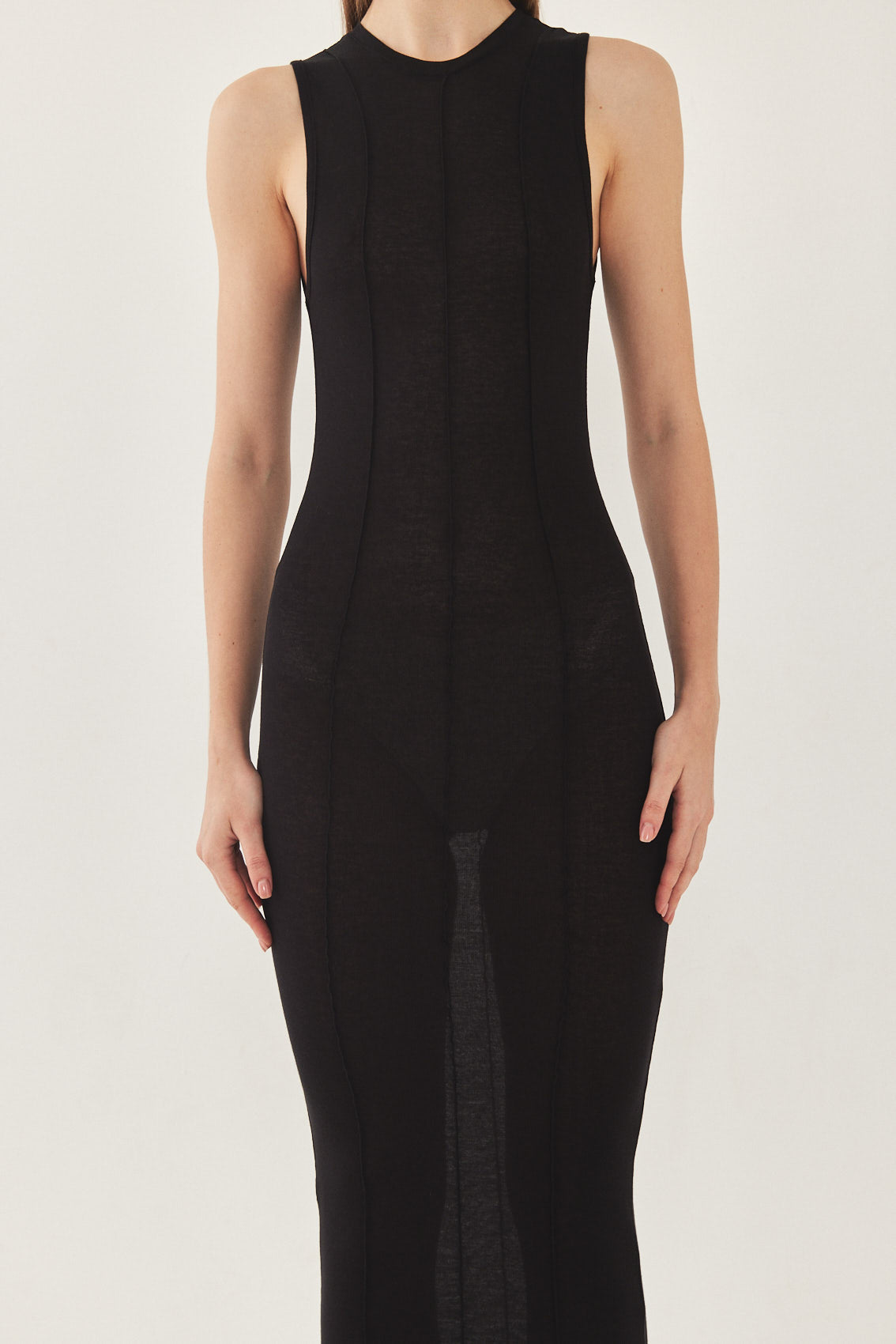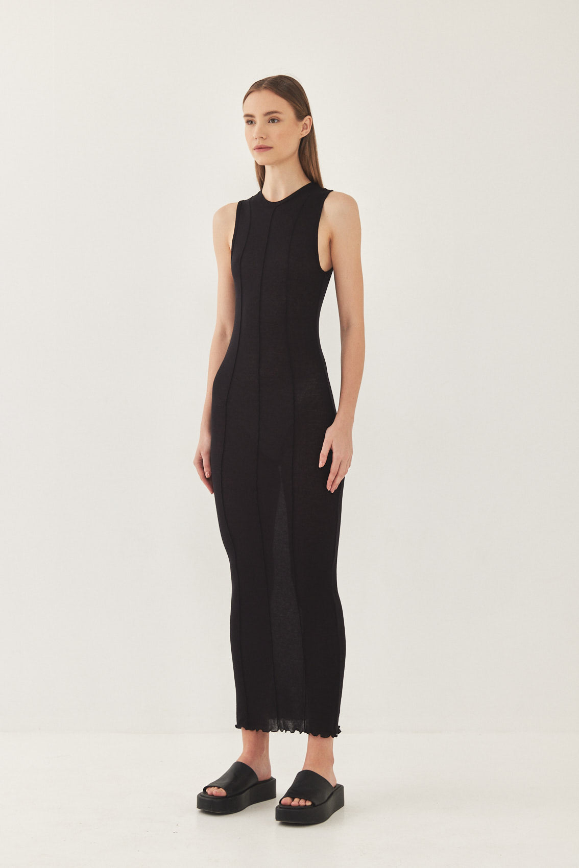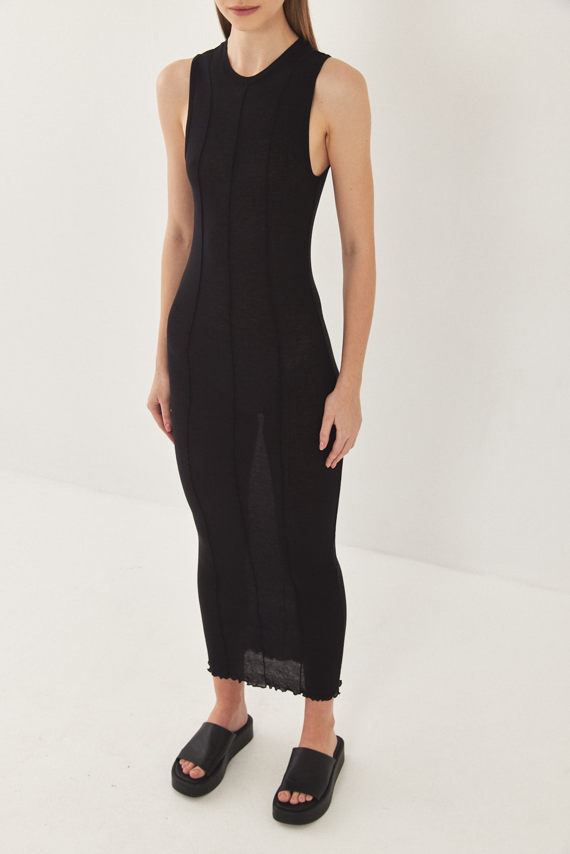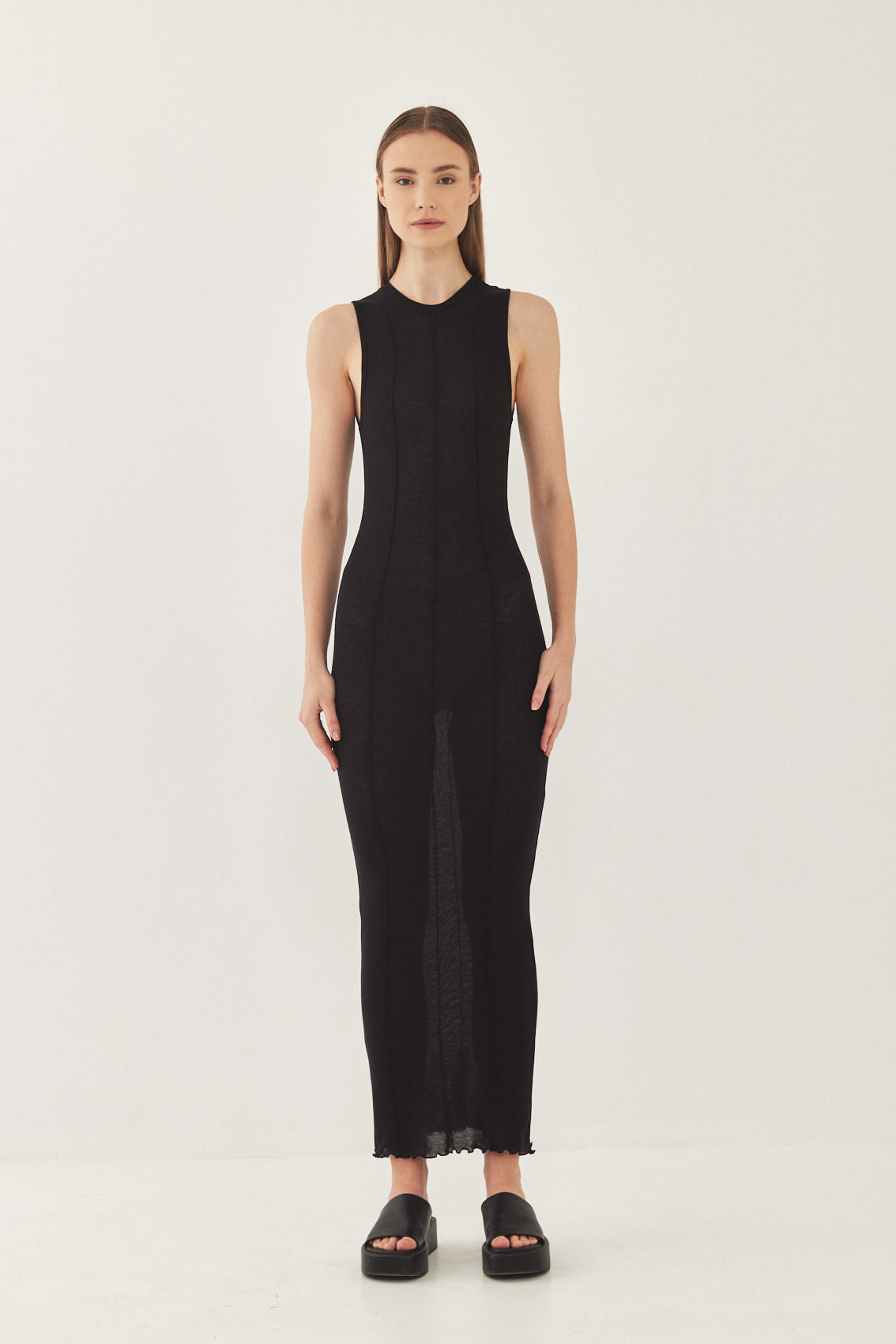Sleeveless maxi dress made from the softest sheer ribbed material. Body hugging. Features frilled hems and delicate line detailing. Style it with a pair of sandals and some sunnies for an effortlessly chic look.
