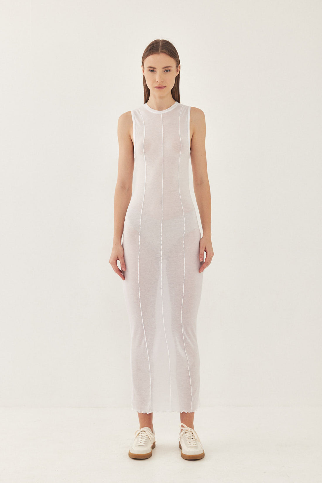 Sleeveless maxi dress made from the softest sheer ribbed material. Body hugging. Features frilled hems and delicate line detailing. Style it with a pair of sandals and some sunnies for an effortlessly chic look.