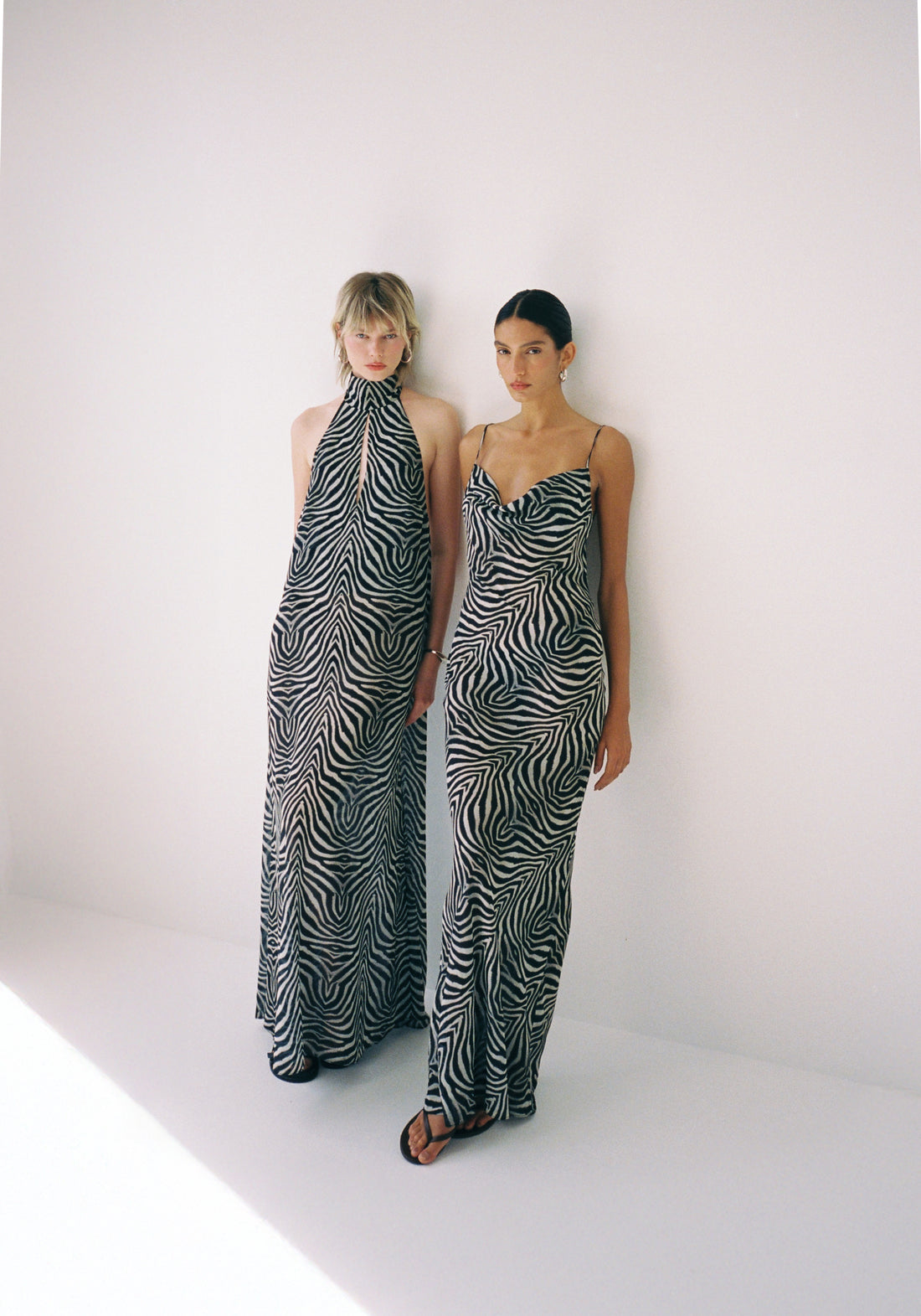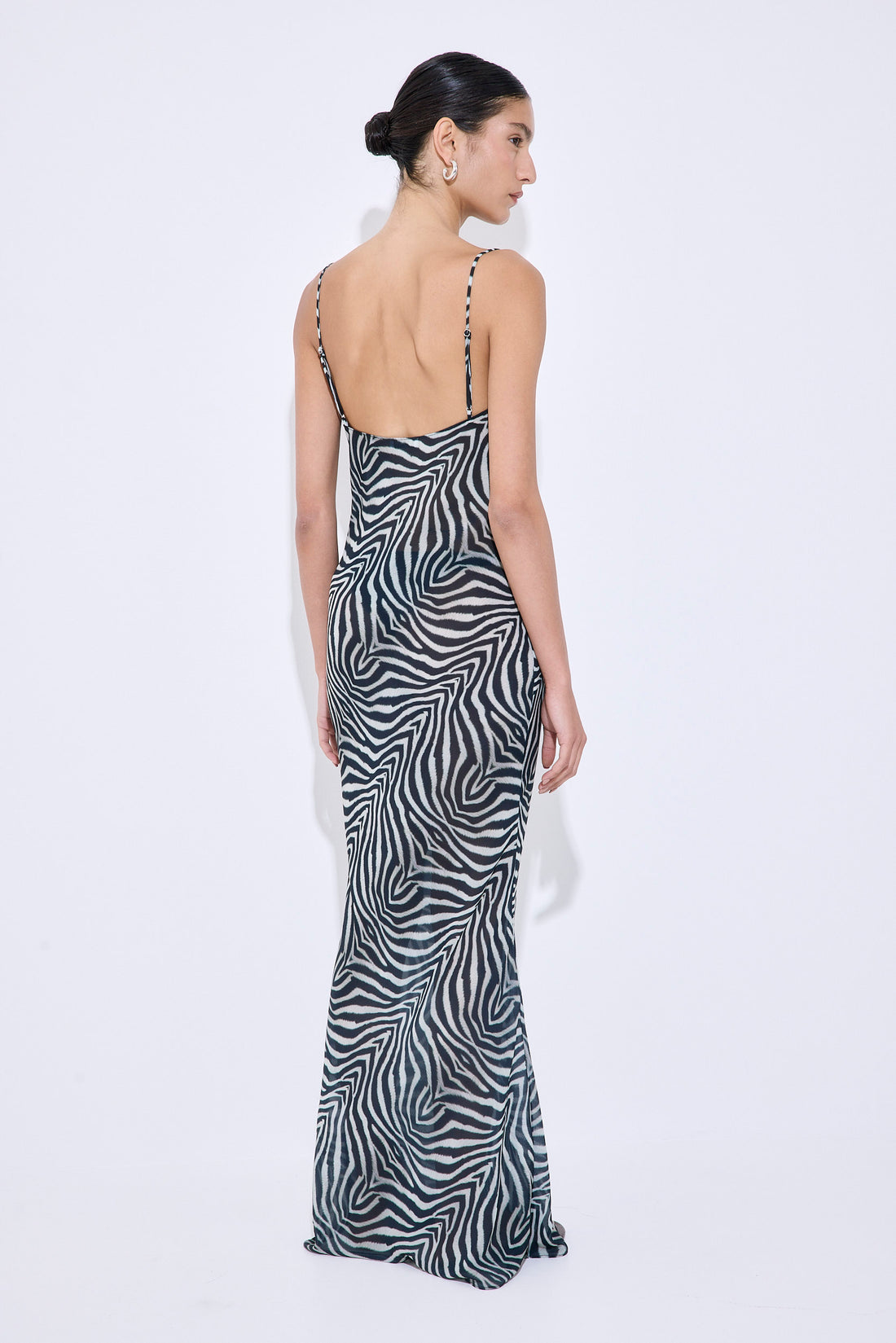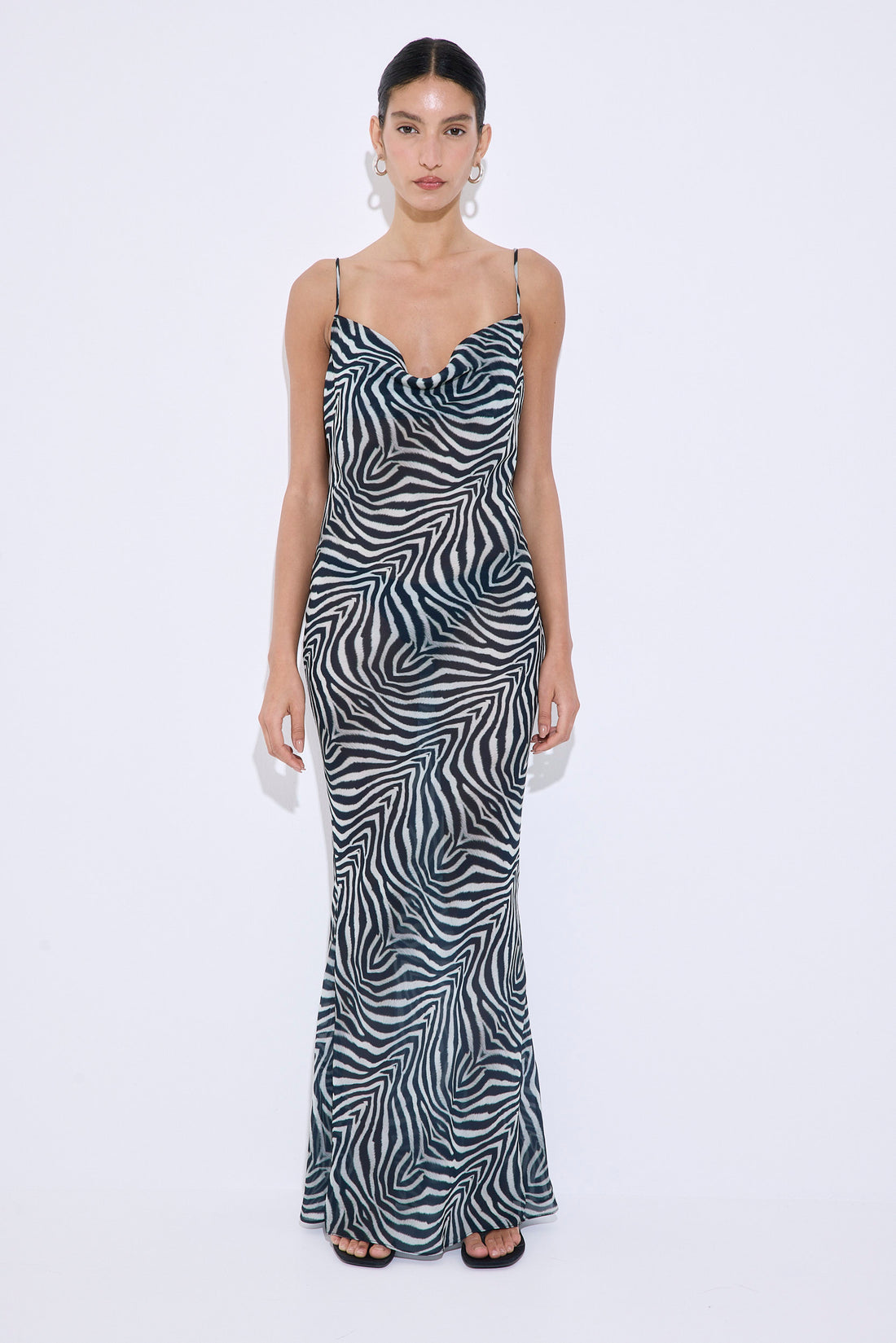 Our new semi sheer draped maxi dress is your go-to statement piece for bold summer nights. Maxi length. Lightweight chiffon fabric with a fluid, semi-sheer finish. Draped cowl neckline. Extra coverage on the chest area. Adjustable skinny straps. Open back with a clean, minimal finish. Designed to contour the body and move effortlessly. The ultimate summer dress. Style it with minimal heels and slicked-back hair for an unforgettable evening look.