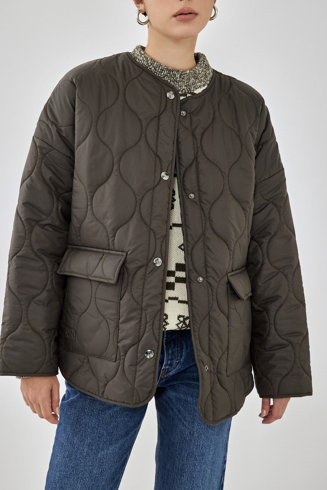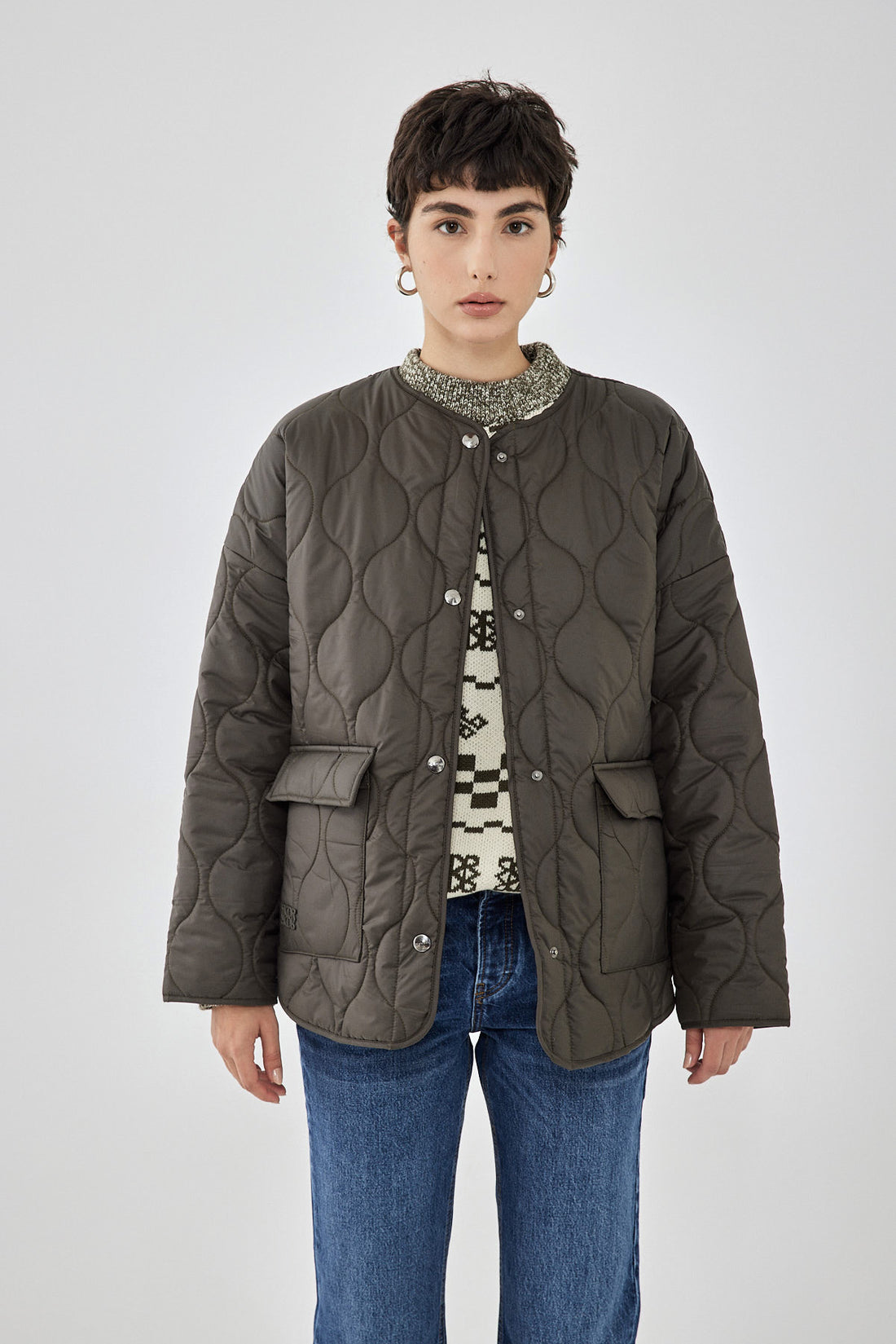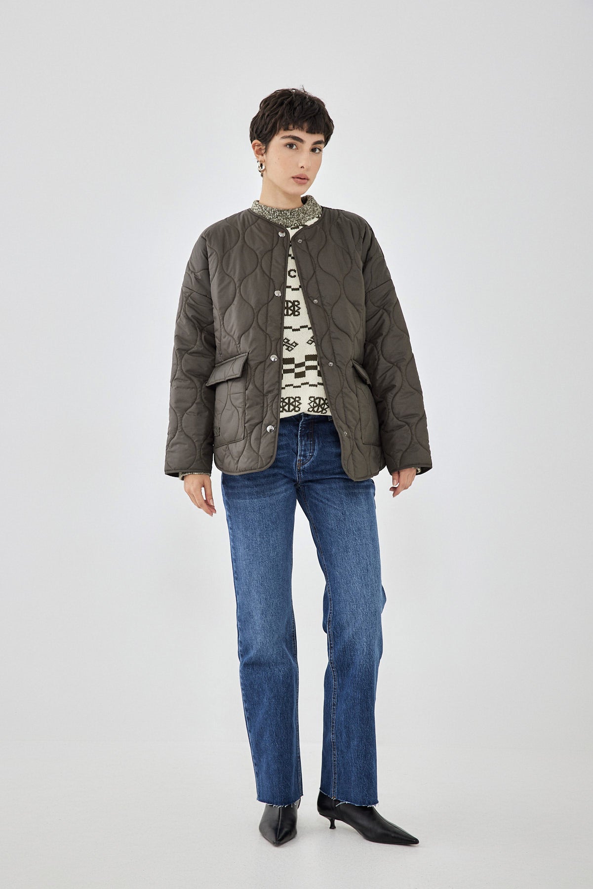 The ultimate addition to your winter wardrobe. Quilted lightweight coat, perfect for the season. Onion quilt pattern. Unlined. Features snap button closure. Two front pockets with a snap button closure. Style it with a chunky knit, your favorite pair of denim and add a kitten heel to finish the look.