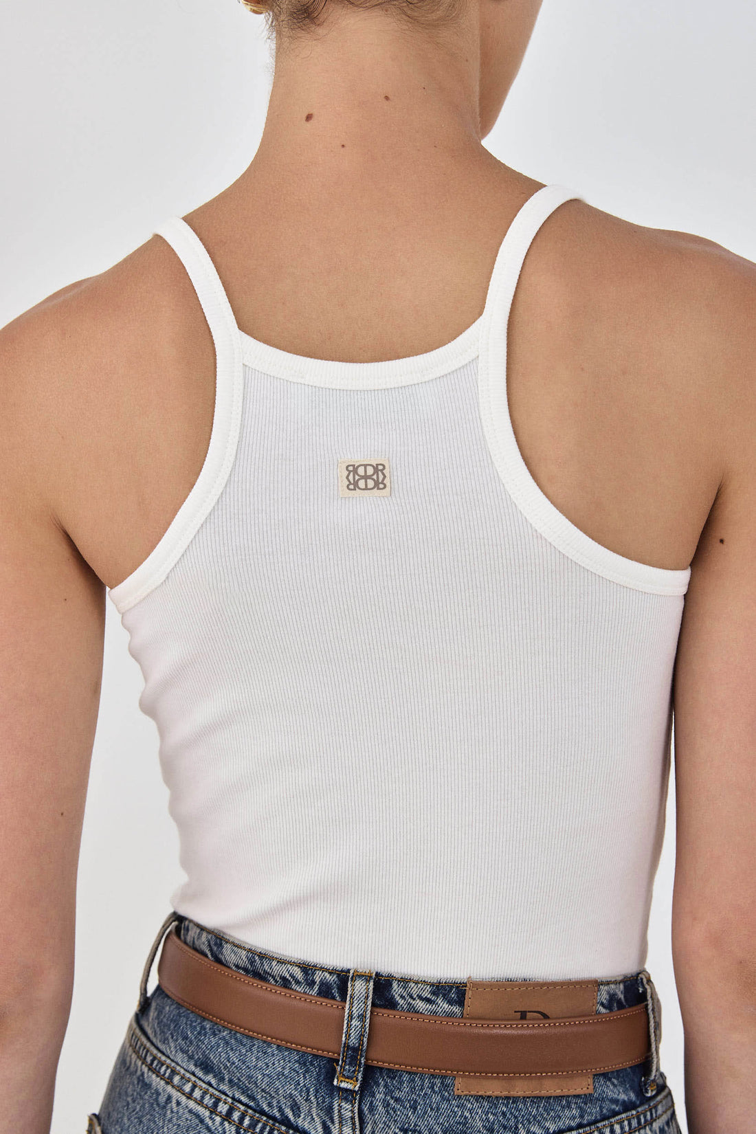 Round neckline cami tank top. Ribbed. Ribbed finish. Delicate halter back. Round neckline. Ultra soft fabric you won't want to take off. Delicate sheer. Cotton woven label with logo detailing at the back. Style it with your favorite denim, large rattan tote bag and neutral colored accessories for a stunning daily look.