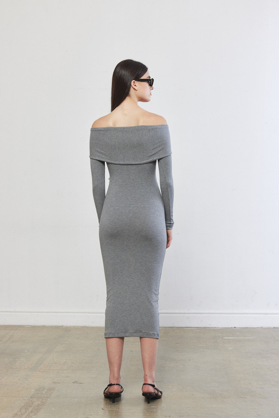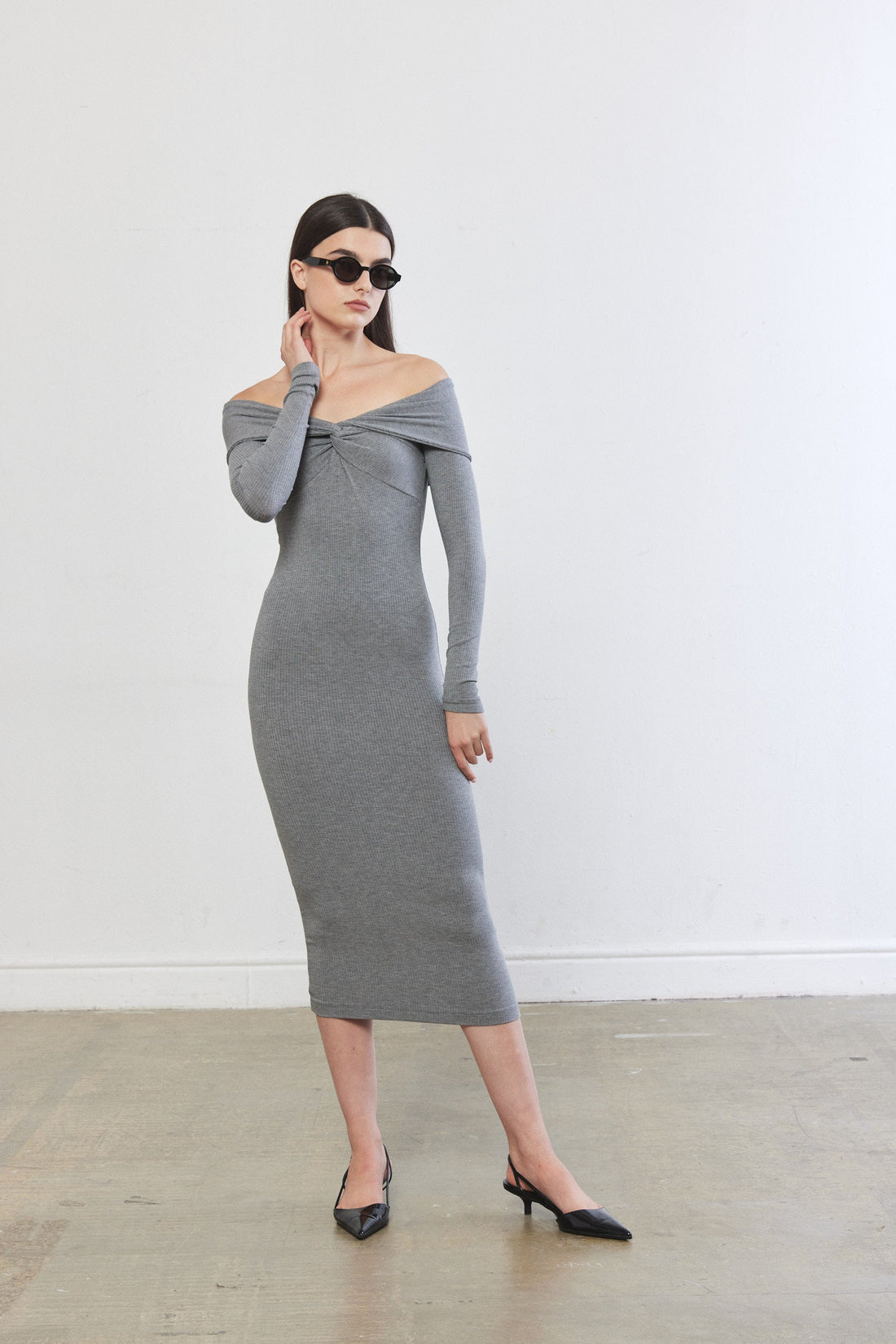 Bodycon midi dress. Features off shoulder, front twist details and long sleeves. Made from a thin ribbed stretchy fabric. Complete the look heels or sneakers for a more casual look.