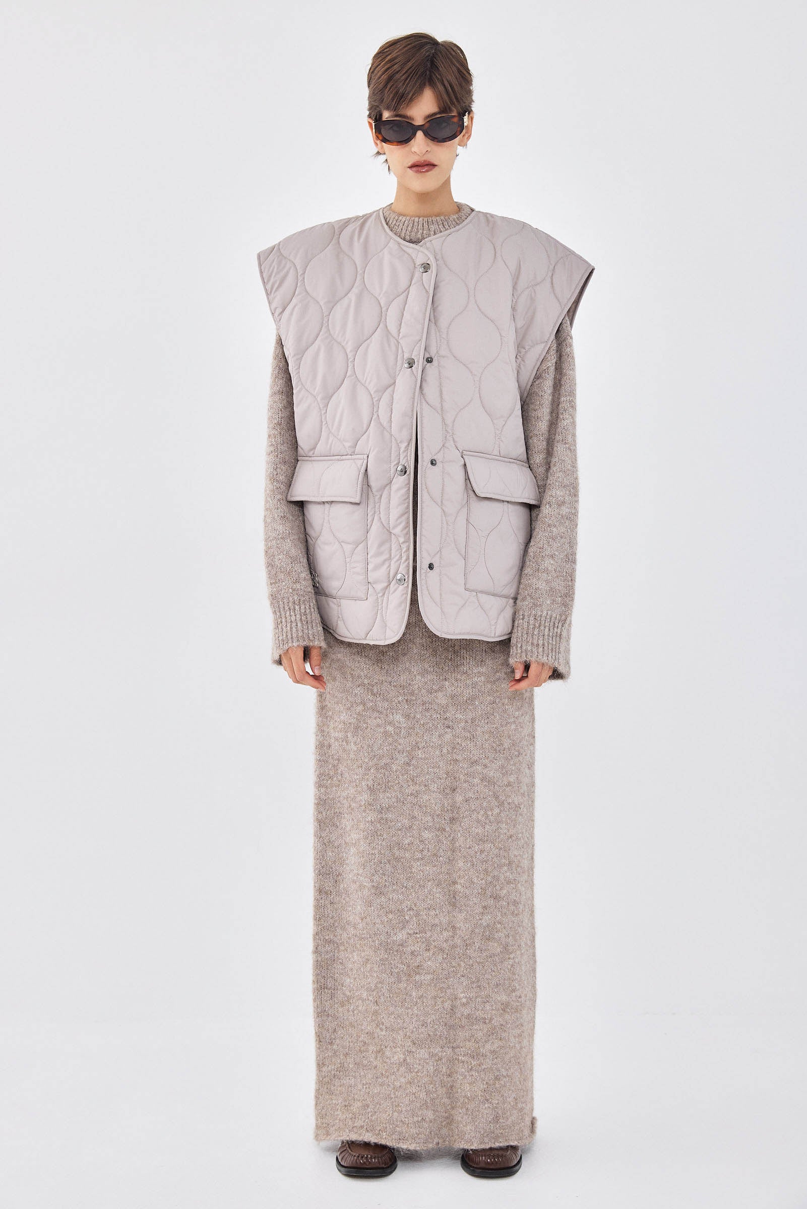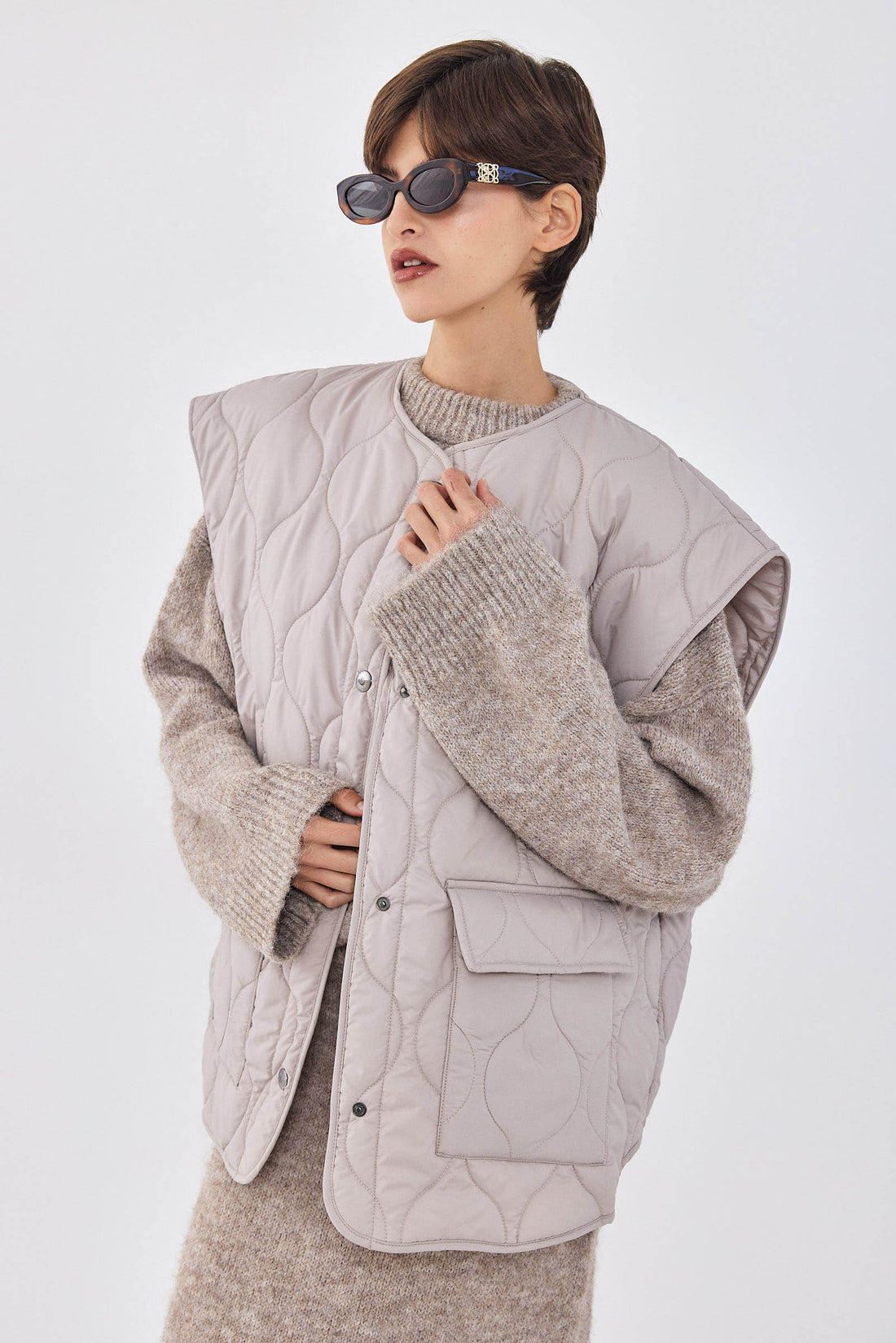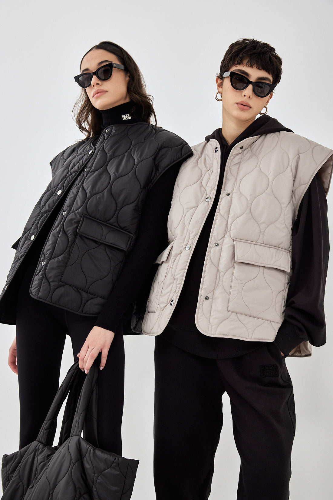 An ultra-chic addition to your winter wardrobe. Quilted lightweight vest. Onion quilt pattern. Unlined. Features a snap button closure. Two front pockets with a snap button closure. Style it over your favorite tracksuit set, add a pair of sunnies and hoop earrings for the coolest look.