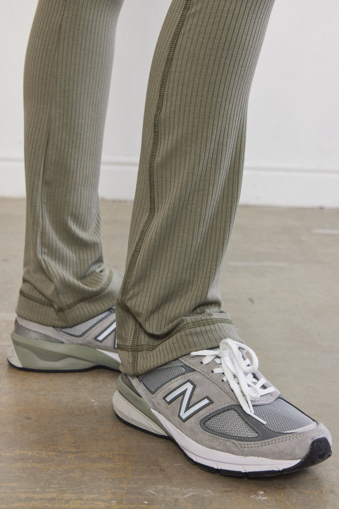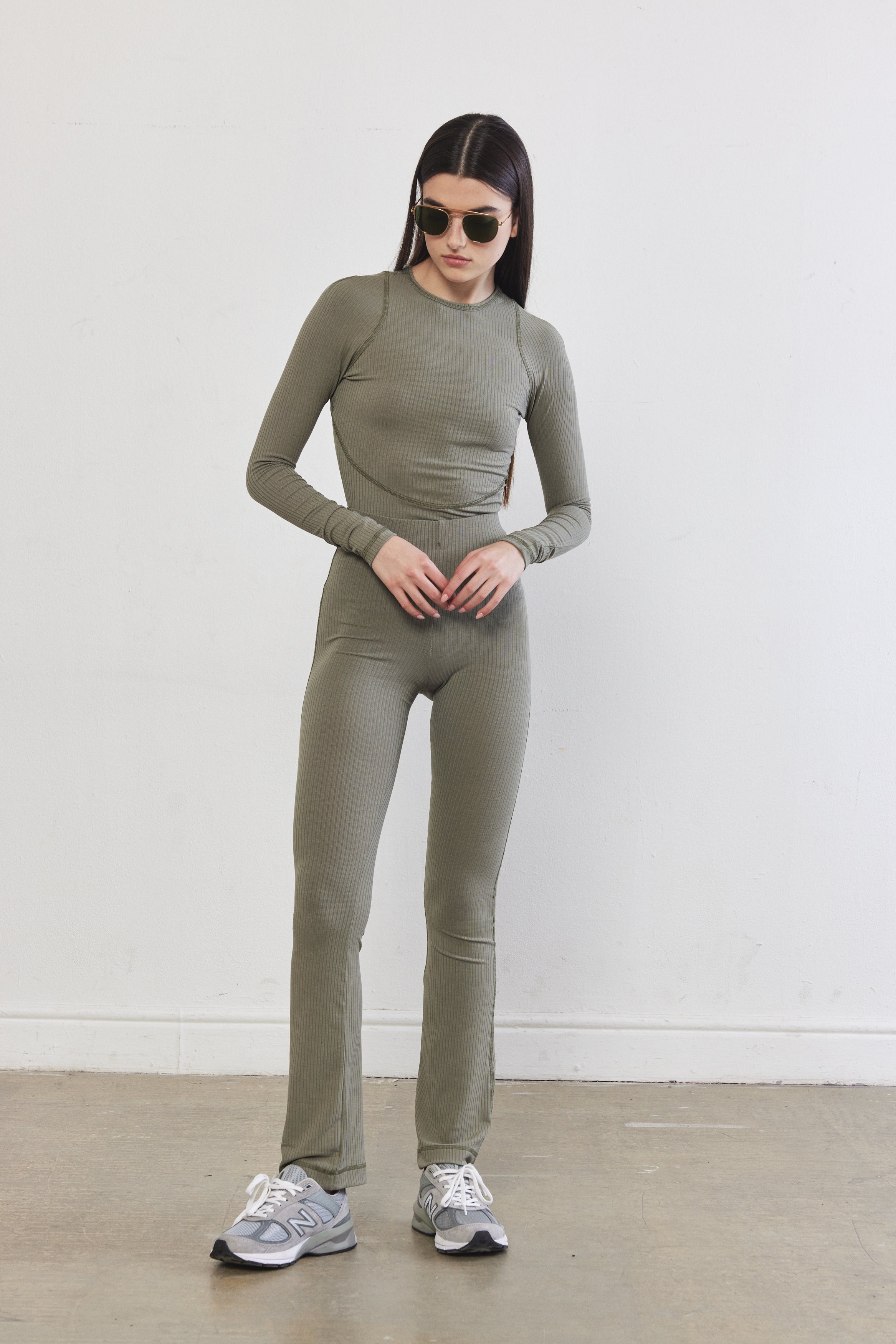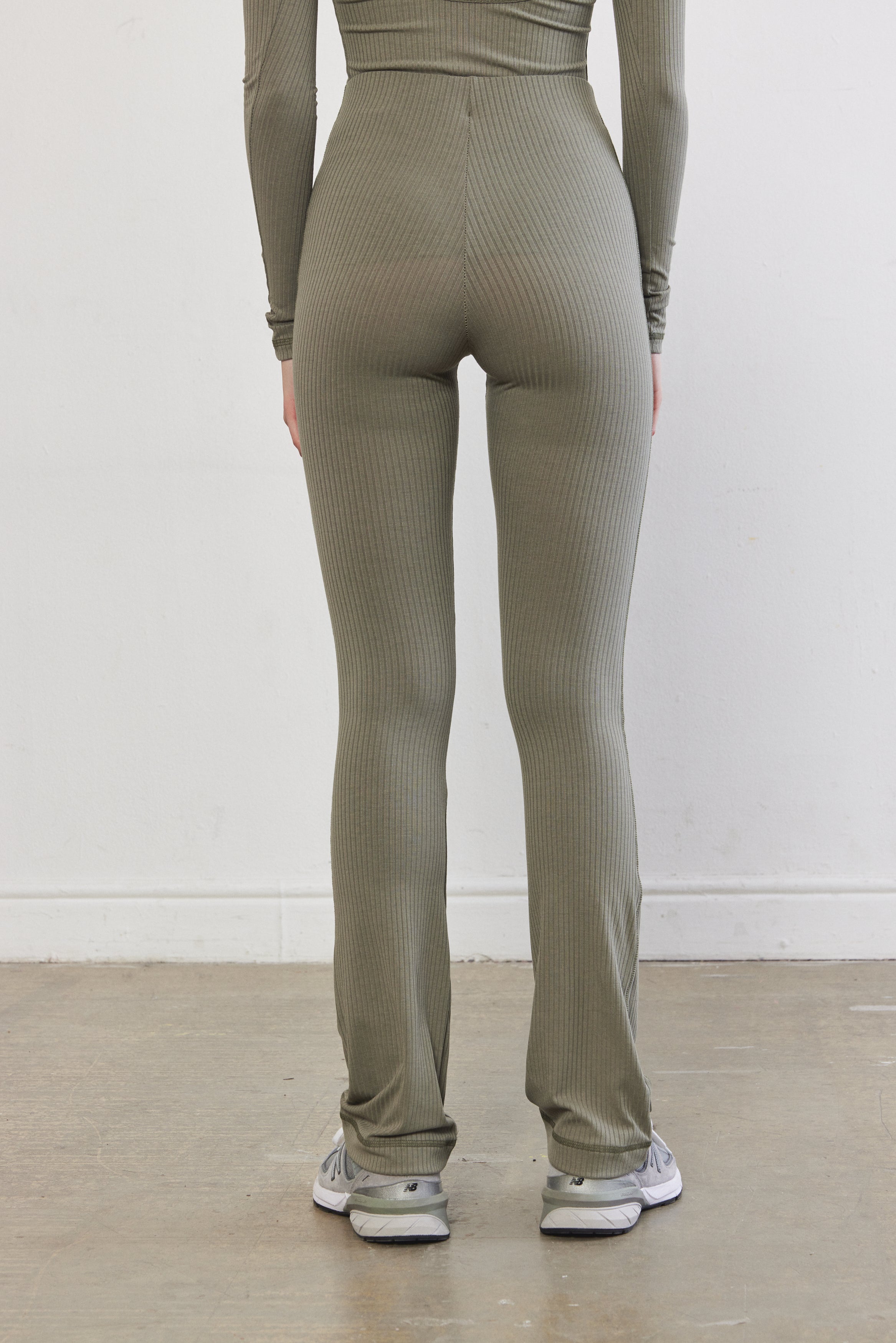 Ribbed long leggings with an elastic waistband. A close fit at the top and slightly flared at the bottom. Features flat lock stitch detailes. Made from a thin ribbed stretchy fabric. Complete the look with a matching color ribbed top and an oversize coat.