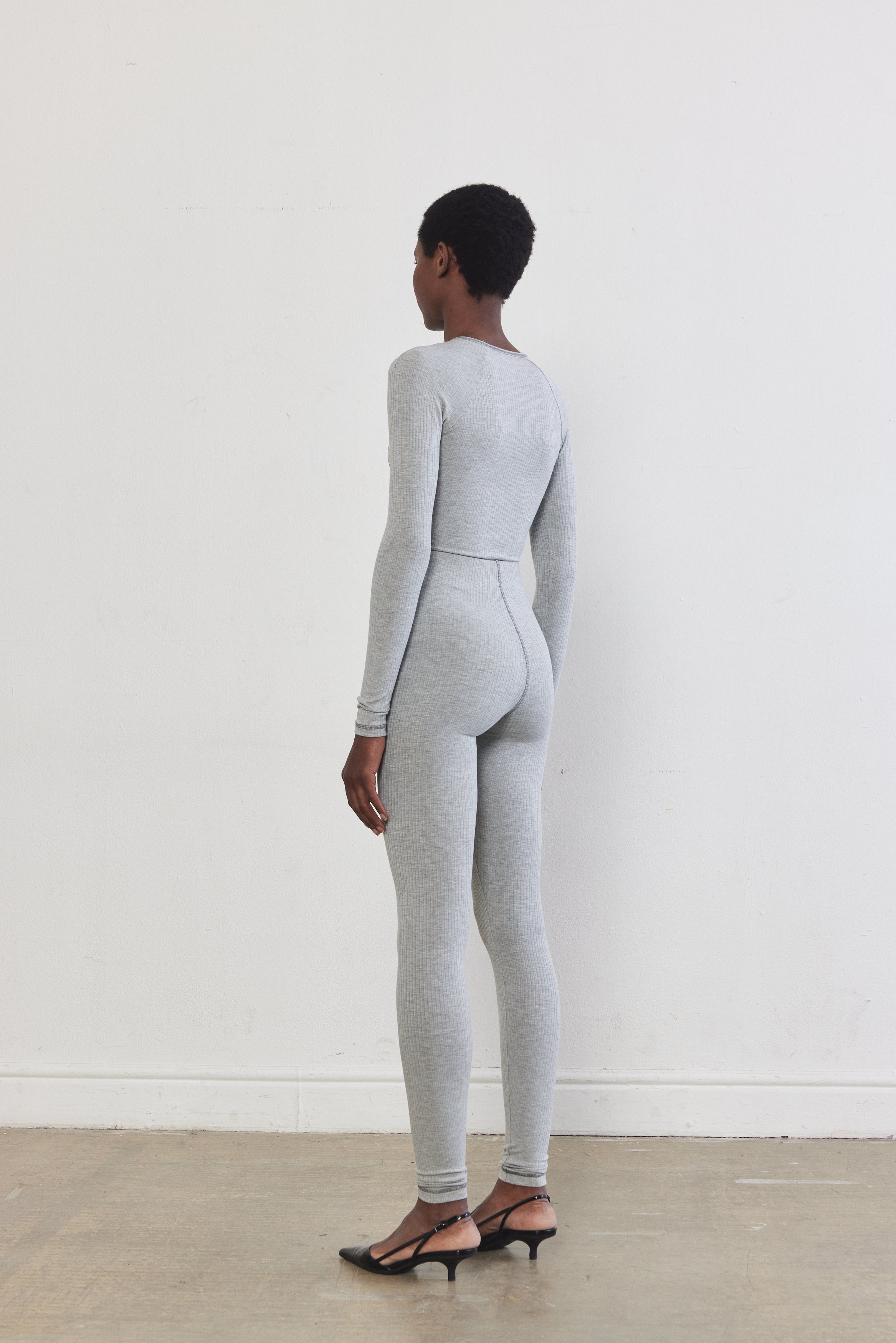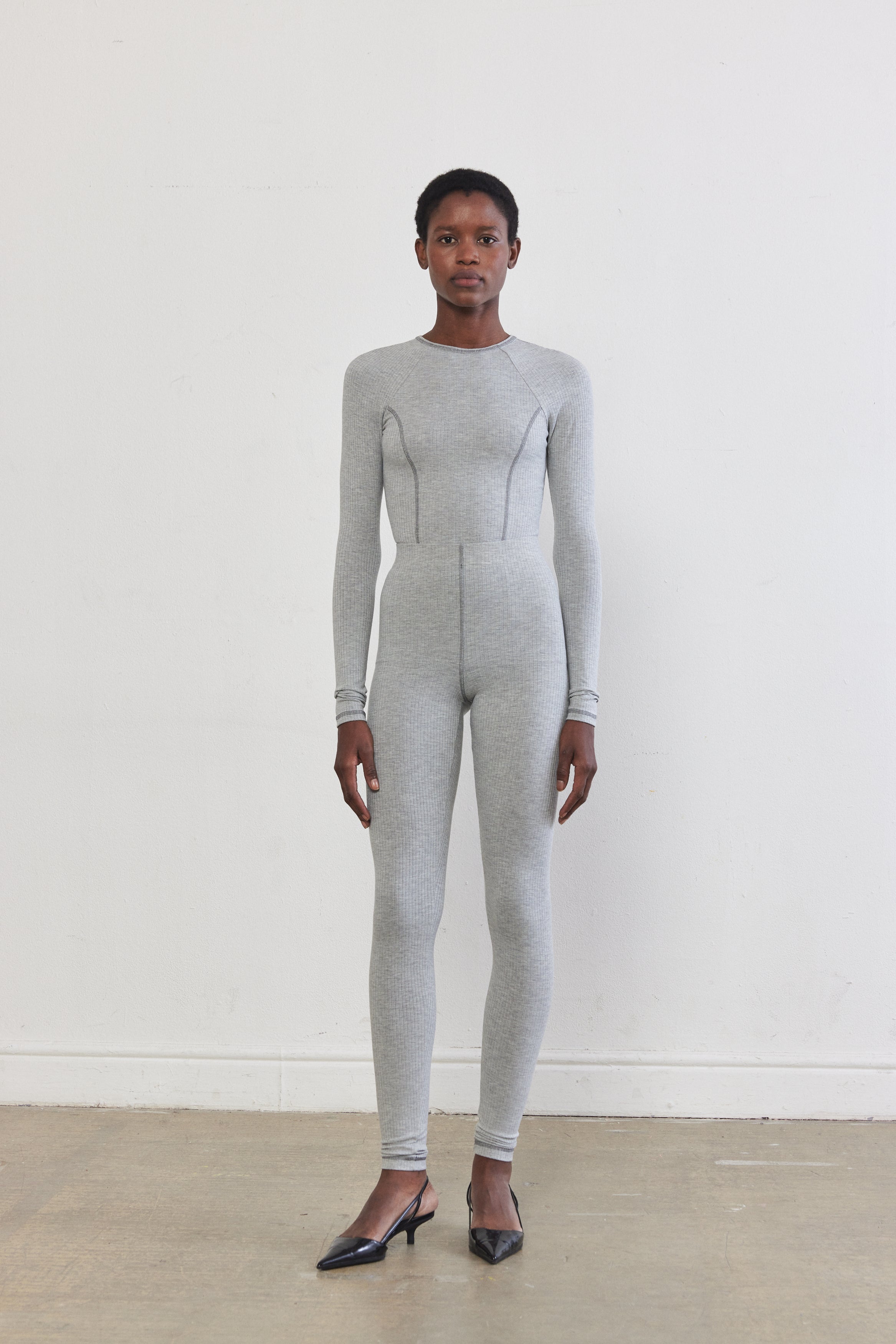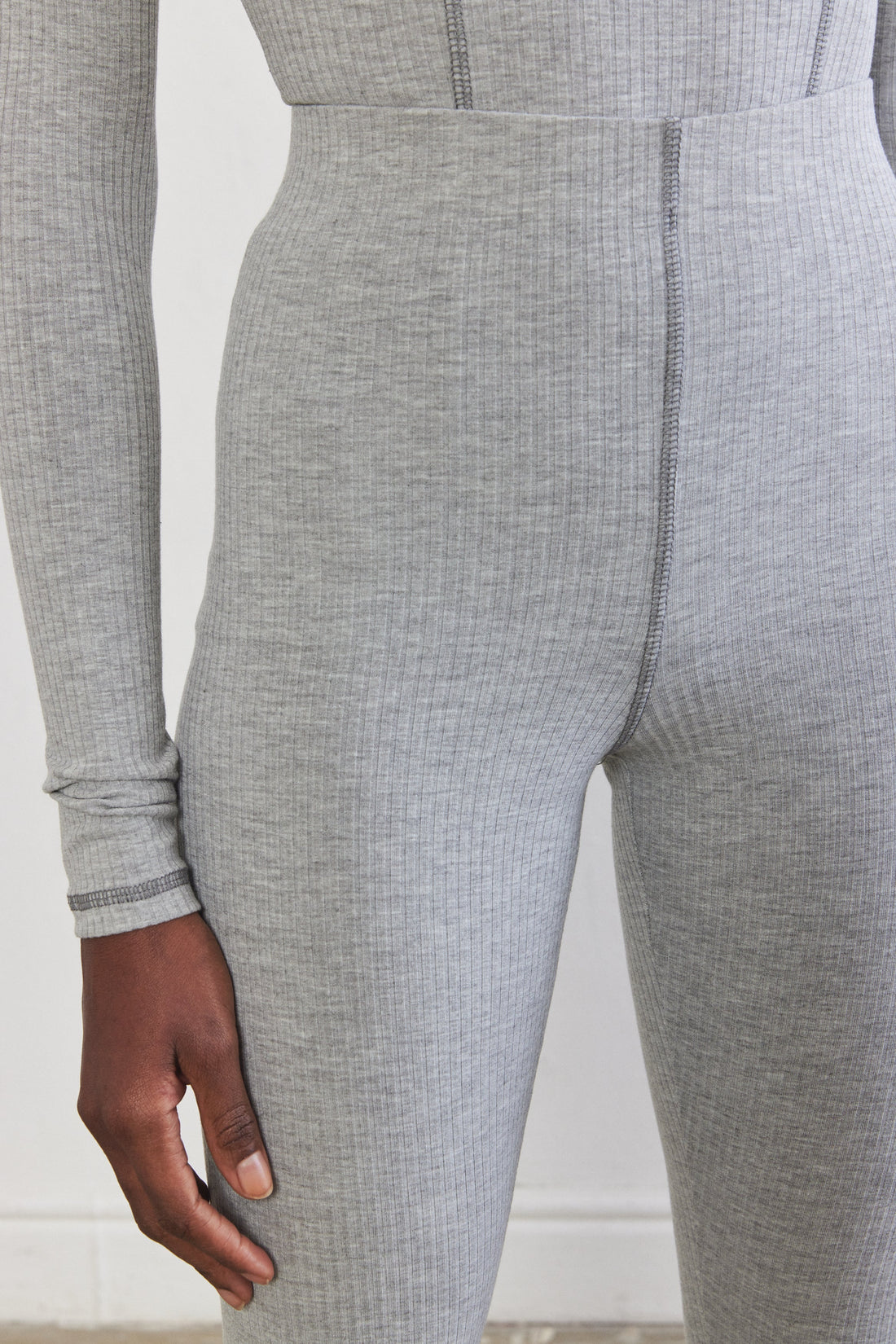 Ribbed long leggings with an elastic waistband. Features flat lock stitch detailes. Made from a thin ribbed stretchy fabric. Complete the look with a matching color ribbed top and an oversize coat.