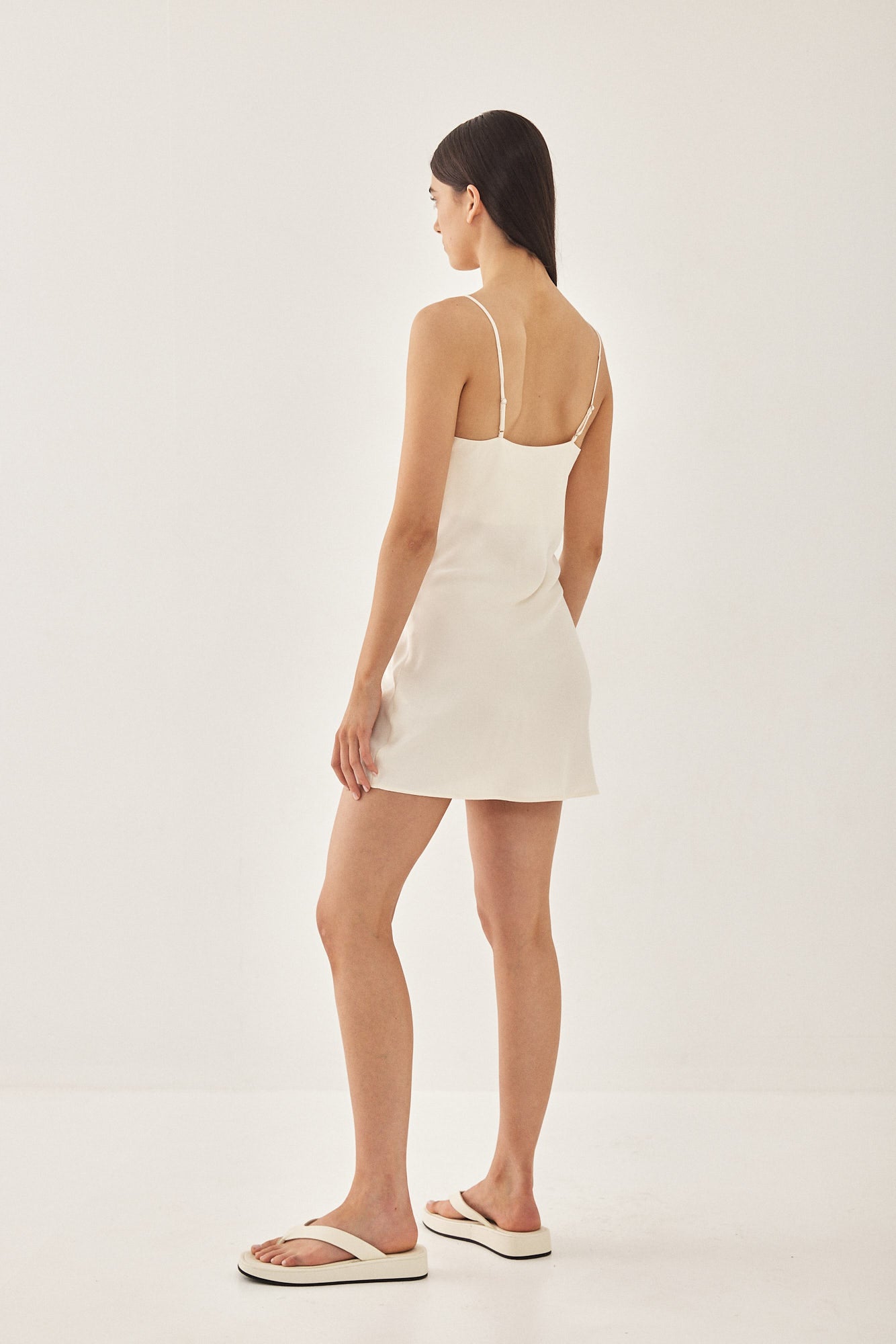 Our satin slip mini dress is your new go to summer dress. Features a v neckline and thin adjustable straps. Cut in a special bias cut technique so that the materials falls smoothly and moves with your body. Style it with our round sunglasses and a pair of slides for a casual and cool look.