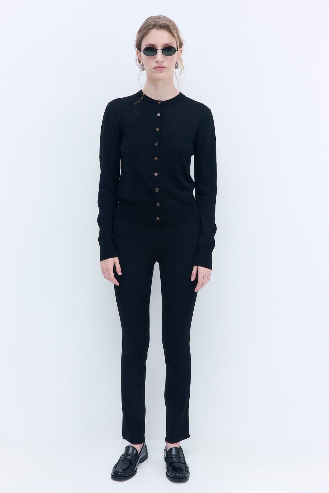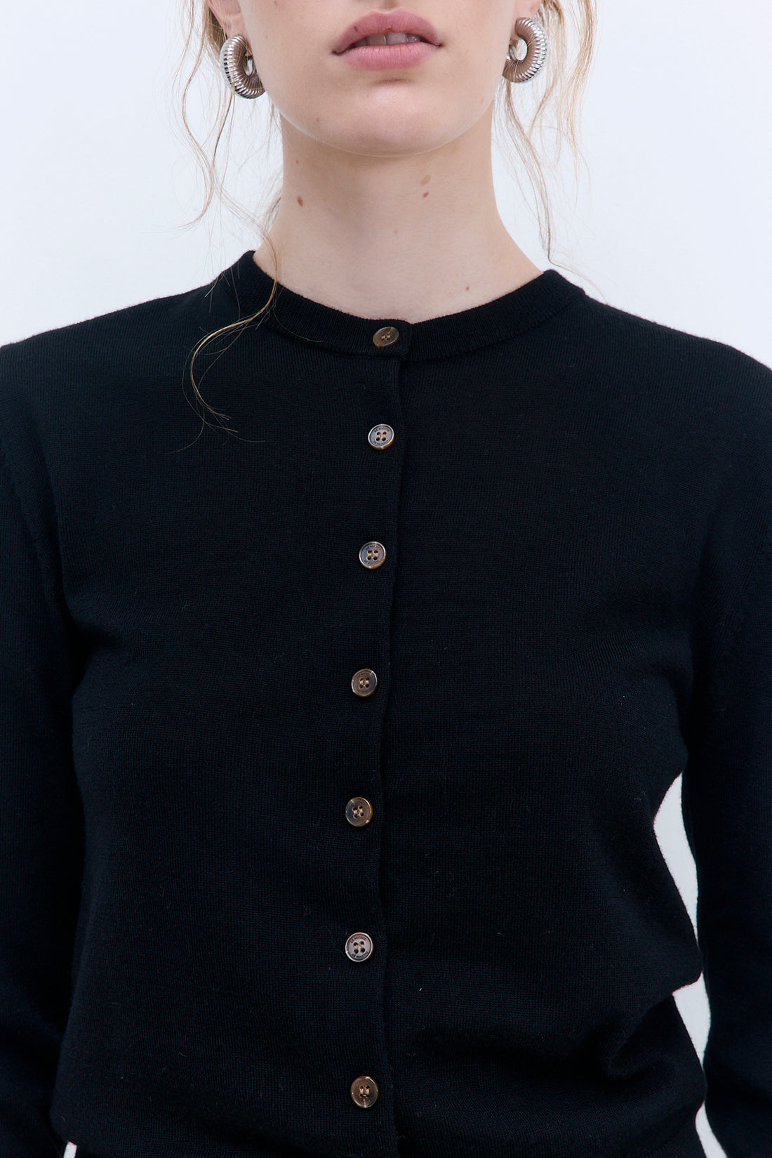 The perfect winter essential. A lightweight cardigan. Fitted with subtle volume at the sleeves and hem for a modern silhouette. Contrasting button closure. Finished with ribbed edges at the neckline, hems, and cuffs. Detailed with a tonal embroidered logo at the sleeve. Style it with our iconic Classic Oversized Daddy Blazer and Tapered Leg Daddy Pants for the ultimate monochromatic look.