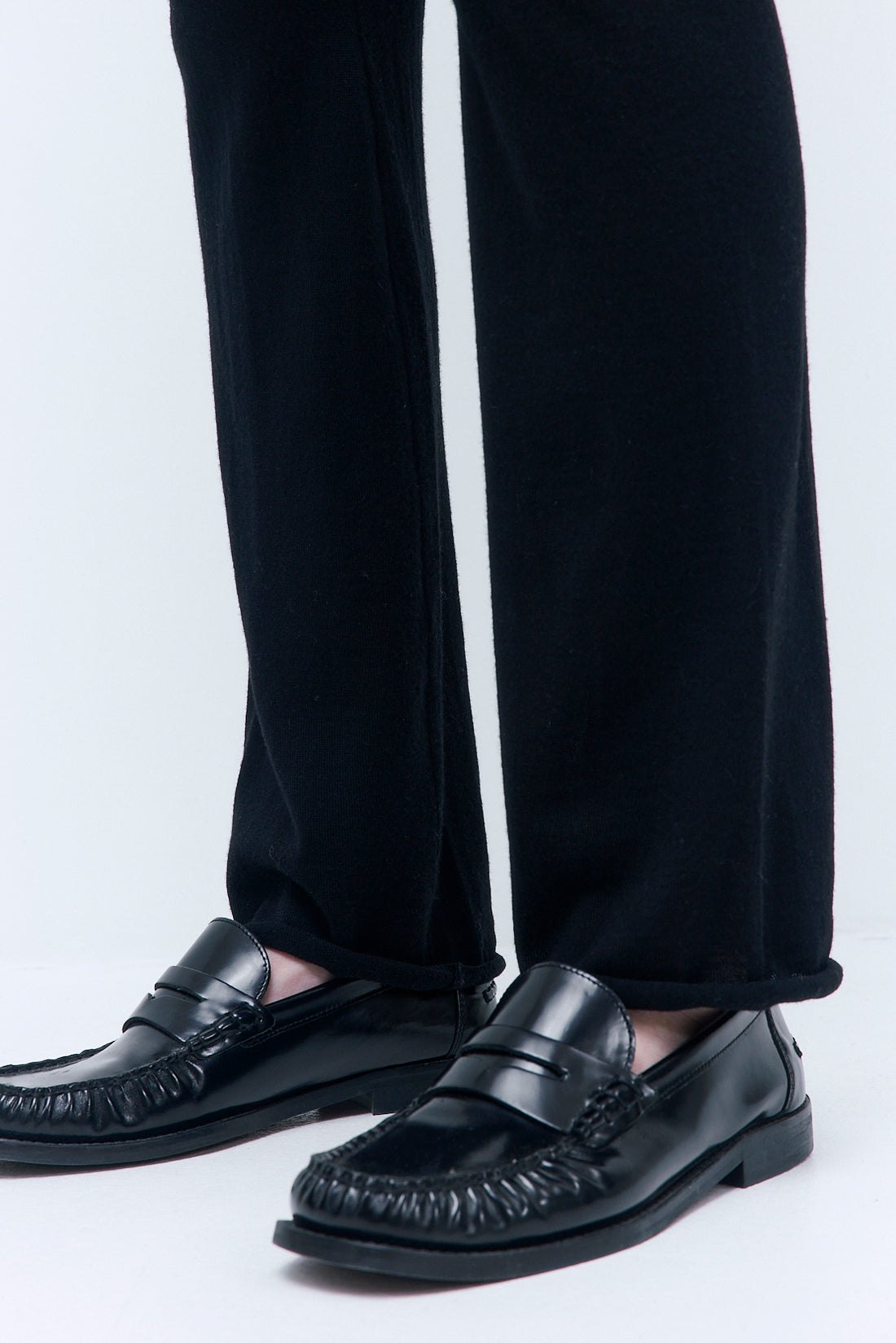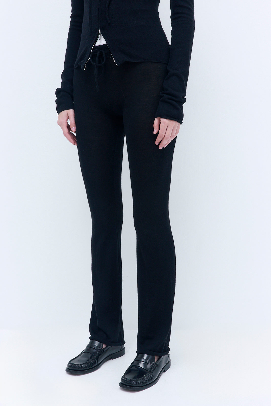 When comfort meets contemporary style. Fitted trousers with a subtle kick flare. Features an internal elastic waistband for comfort. Ribbed belt detailing with adjustable drawstrings. Finished with a tonal embroidered logo at the back. Style it with our matching Lightweight Zipper Cardigan and finish the look with our effortless Merino Wool Skinny Scarf for ultimate comfort.