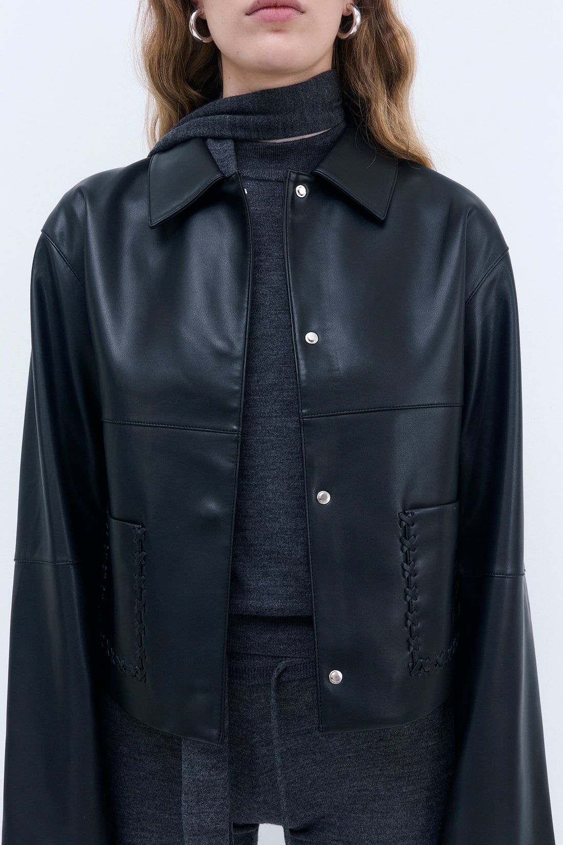 Your new go-to jacket to add to your rotation this winter. Vegan leather. True to size fit. Padded. Featuring hidden silver snap closure for a clean, streamlined front. Accented with embroidered x's along the jacket. Detailed with patch pockets with an embossed tonal logo on one side. Subtle vent and tailored cuts on the back. Style it with our essential Wide Rib Mini Dress and iconic Yvon Shoulder Bag for a clean, polished look.