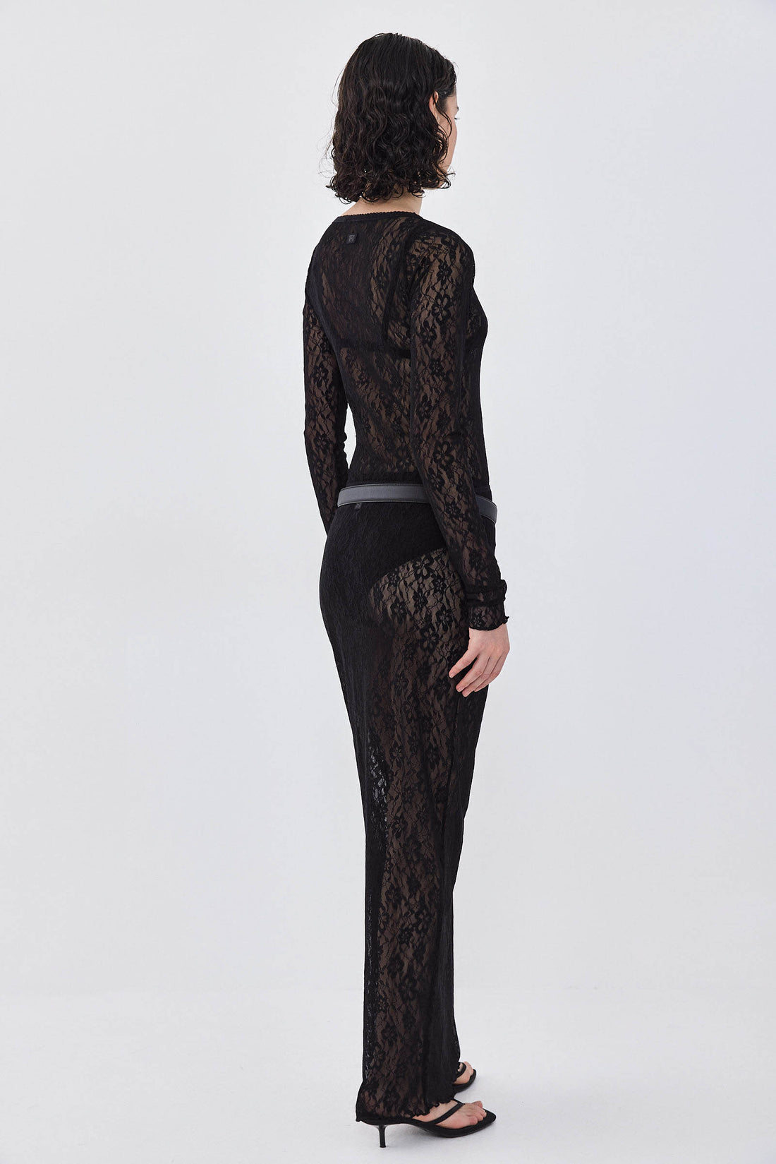 Long sleeved lace top. Boatneck neckline. Flowery lace pattern. Stretchy material which hugs the body. Cotton tonal logo patch at the back. Baby lock finish. Style it over your favorite lace bra, suede bottom and thin genuine leather belt for the an effortlessly chic autumn look.