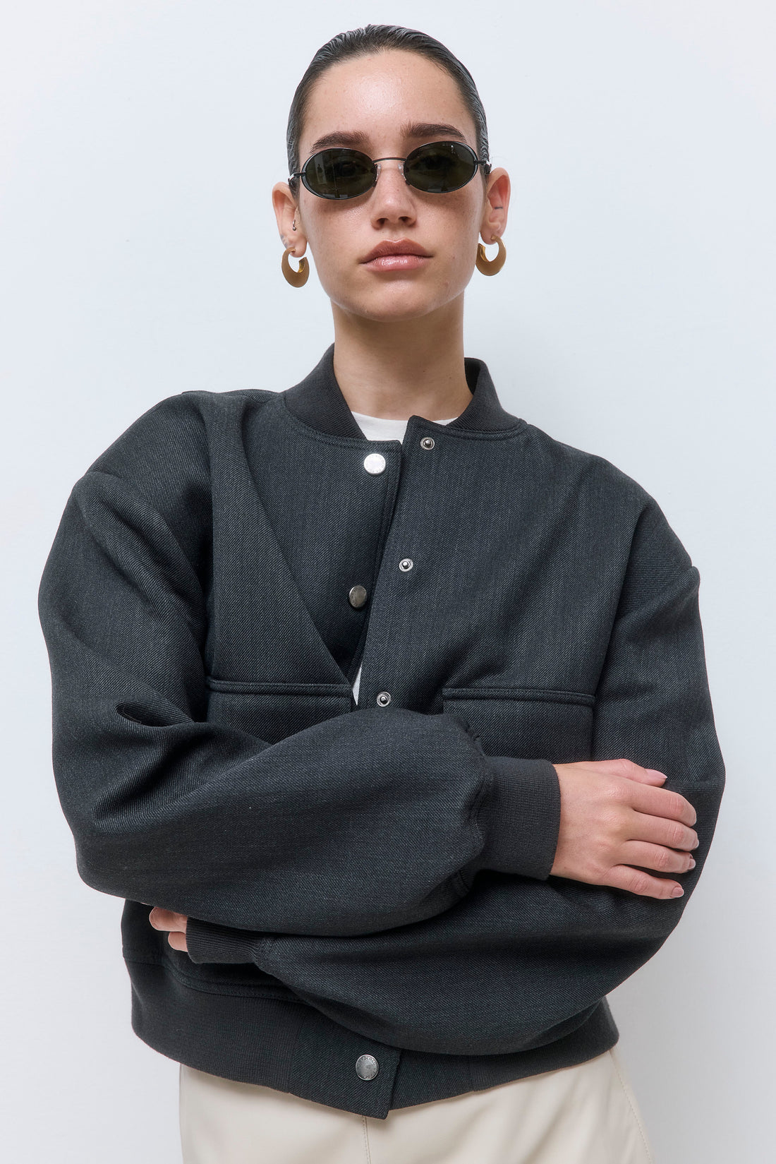 Elevate your fall wardrobe with our new oversized bomber jacket. Features padded broad shoulders and a ribbed collar for a classic, laid back style. Lined. Ribbed cuffs and hems. Logo engraved snap buttons closure. Two patch pockets with luxurious logo embroidery. Style it with our lightweight turtleneck, a pair of our beautiful denim and our oval sunnies for a cool everyday look.