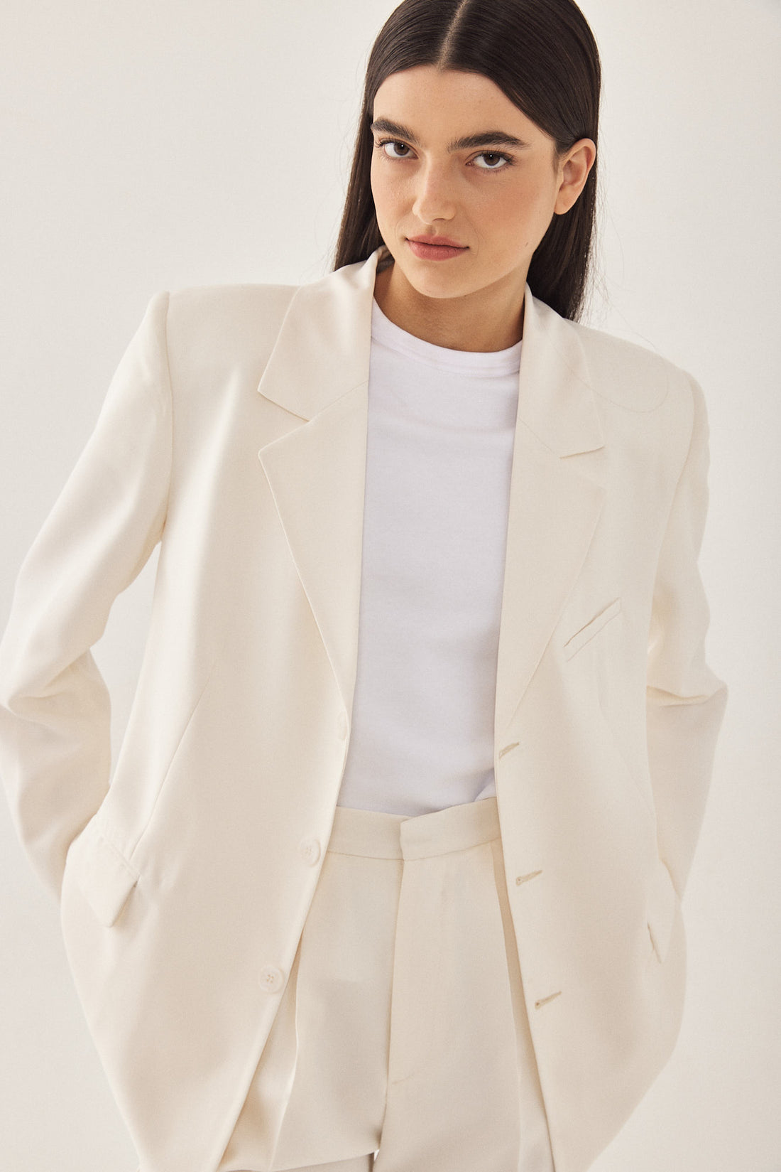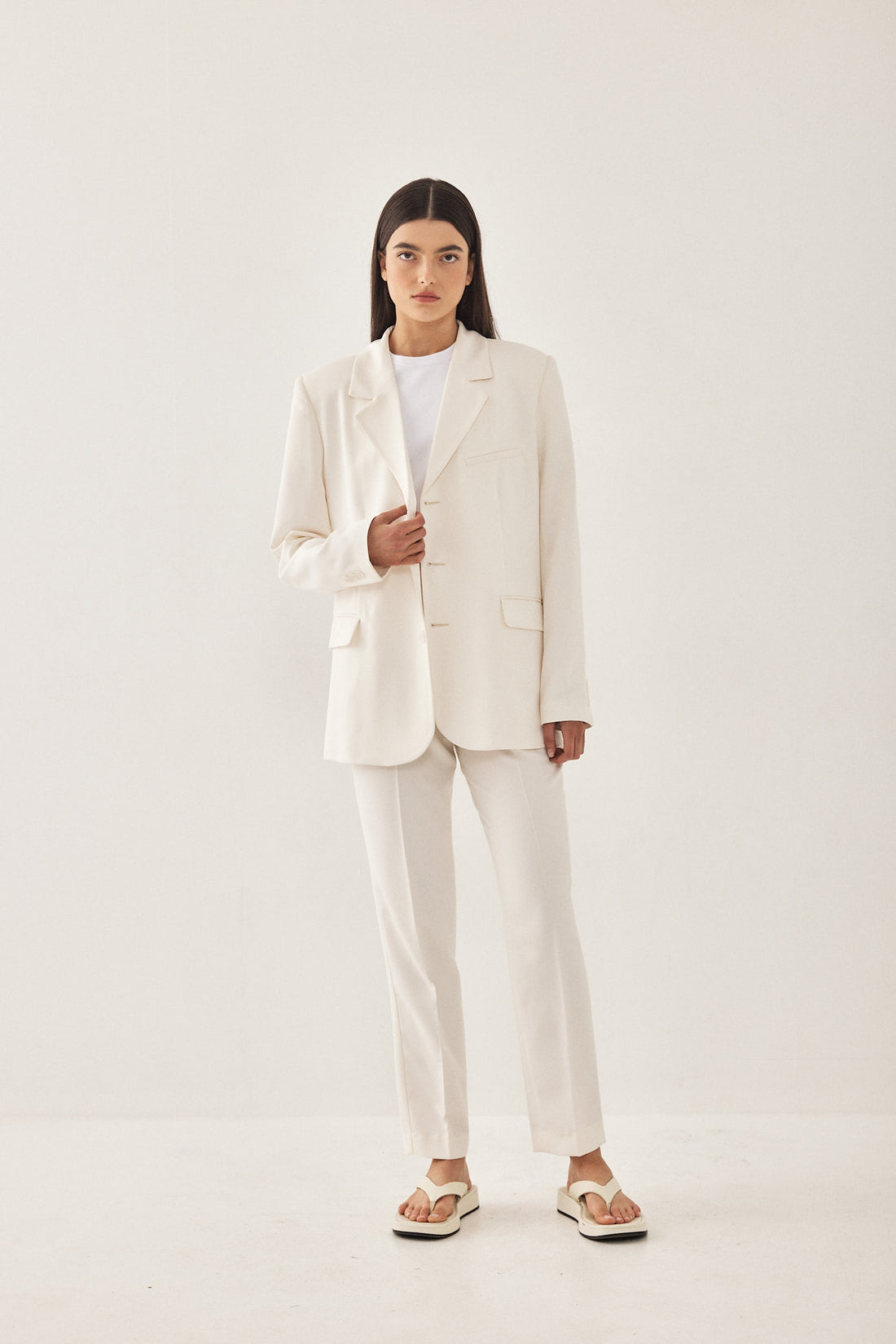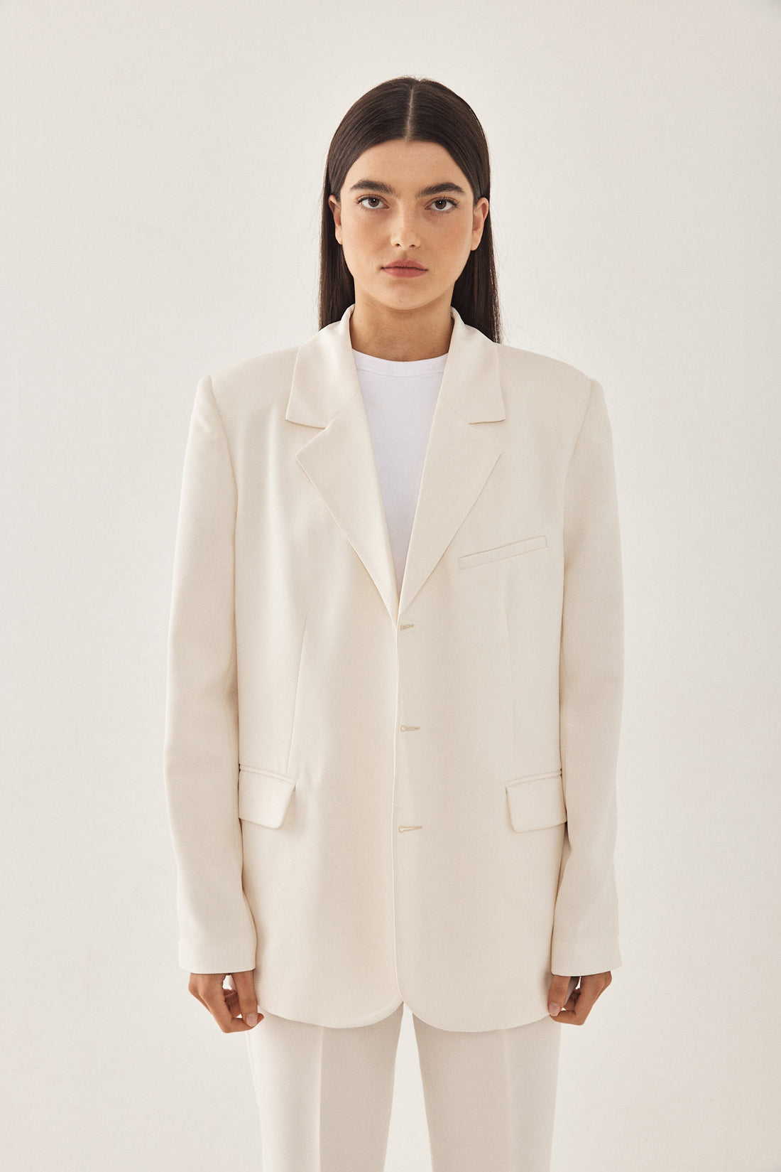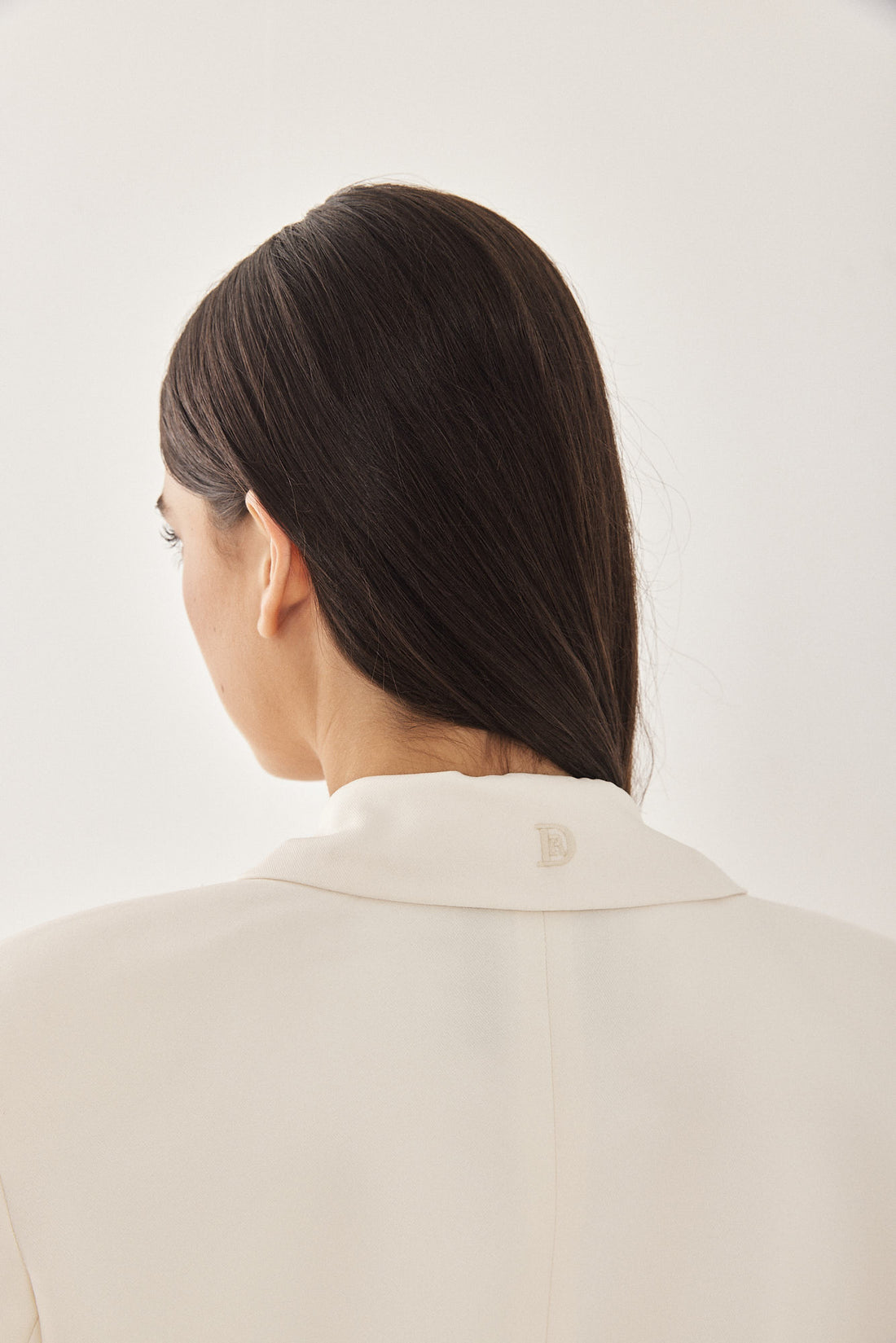 A classic masculine cut blazer. Features a lapel collar with a front button closure. Long sleeves with pronounced shoulder. Has an embroidered logo at the back collar. Style it with a pair of matching daddy pants and a tank top for an elevated look.