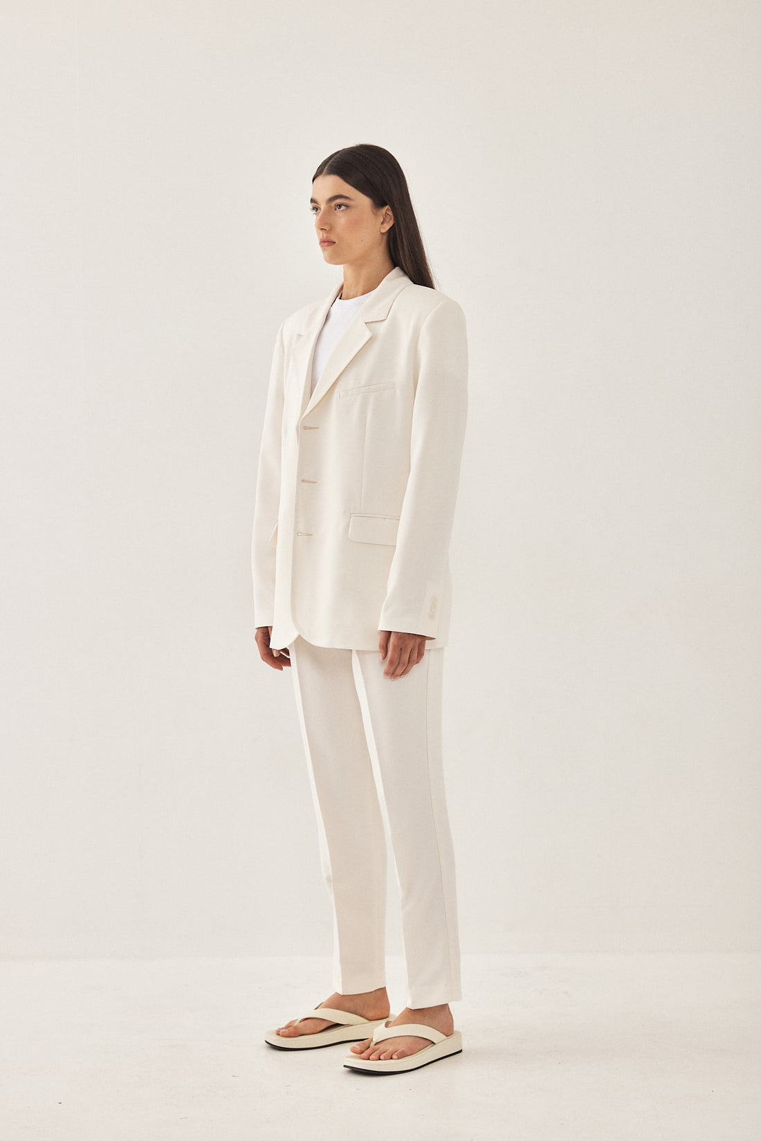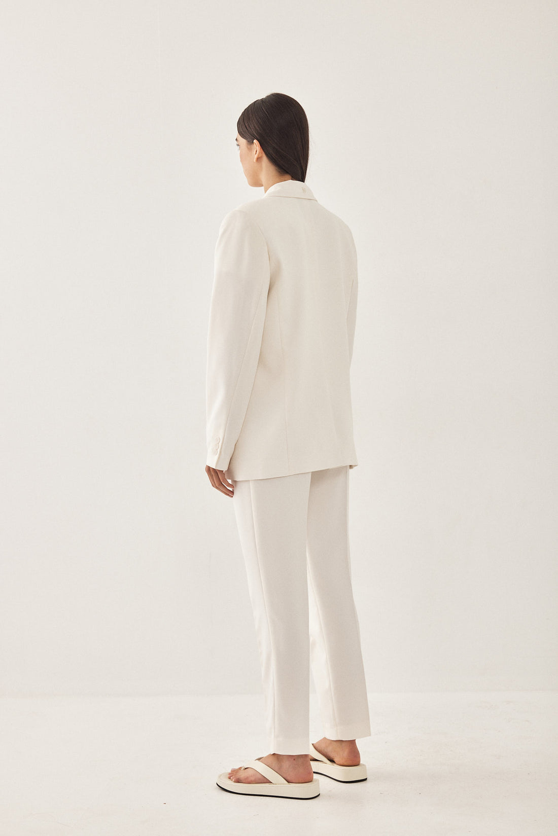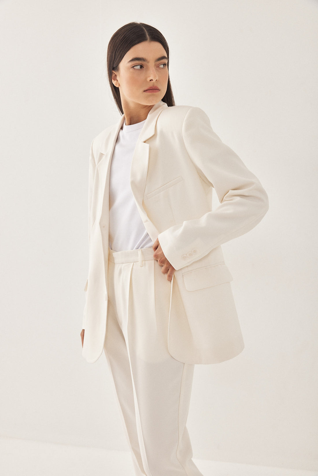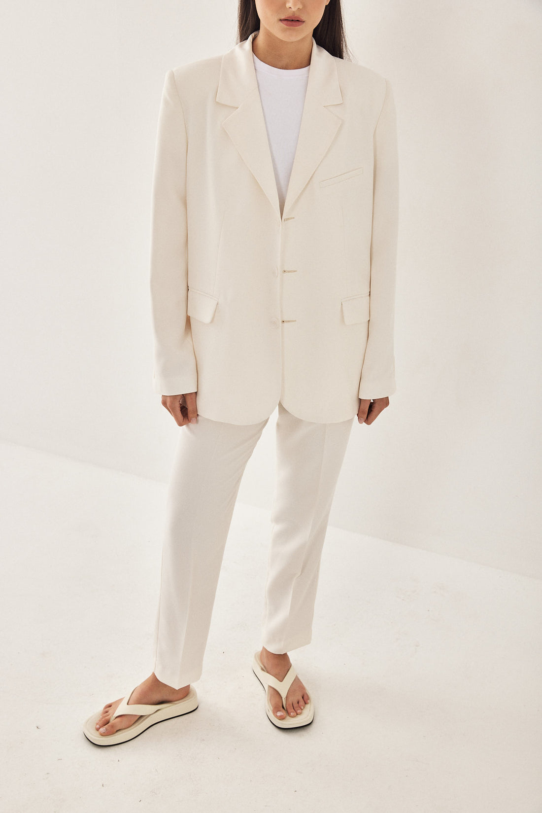 A classic masculine cut blazer. Features a lapel collar with a front button closure. Long sleeves with pronounced shoulder. Has an embroidered logo at the back collar. Style it with a pair of matching daddy pants and a tank top for an elevated look.