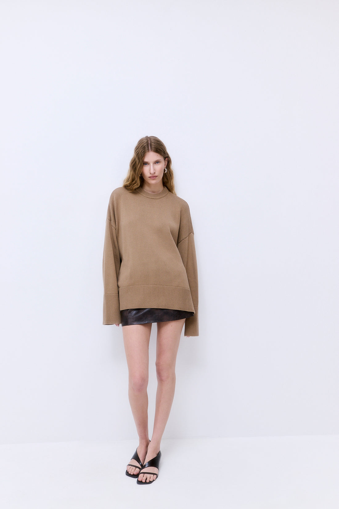The perfect cozy winter essential. Crew neckline. Oversized fit. Slits on the side. Dropped shoulders. Wide rib hem. Tonal silicon logo on the back. Fully fashioned. Style it with our with our chic Sheer Midi Skirt and pair these with our iconic Yvon Shoulder Bag for an effortless everyday look.