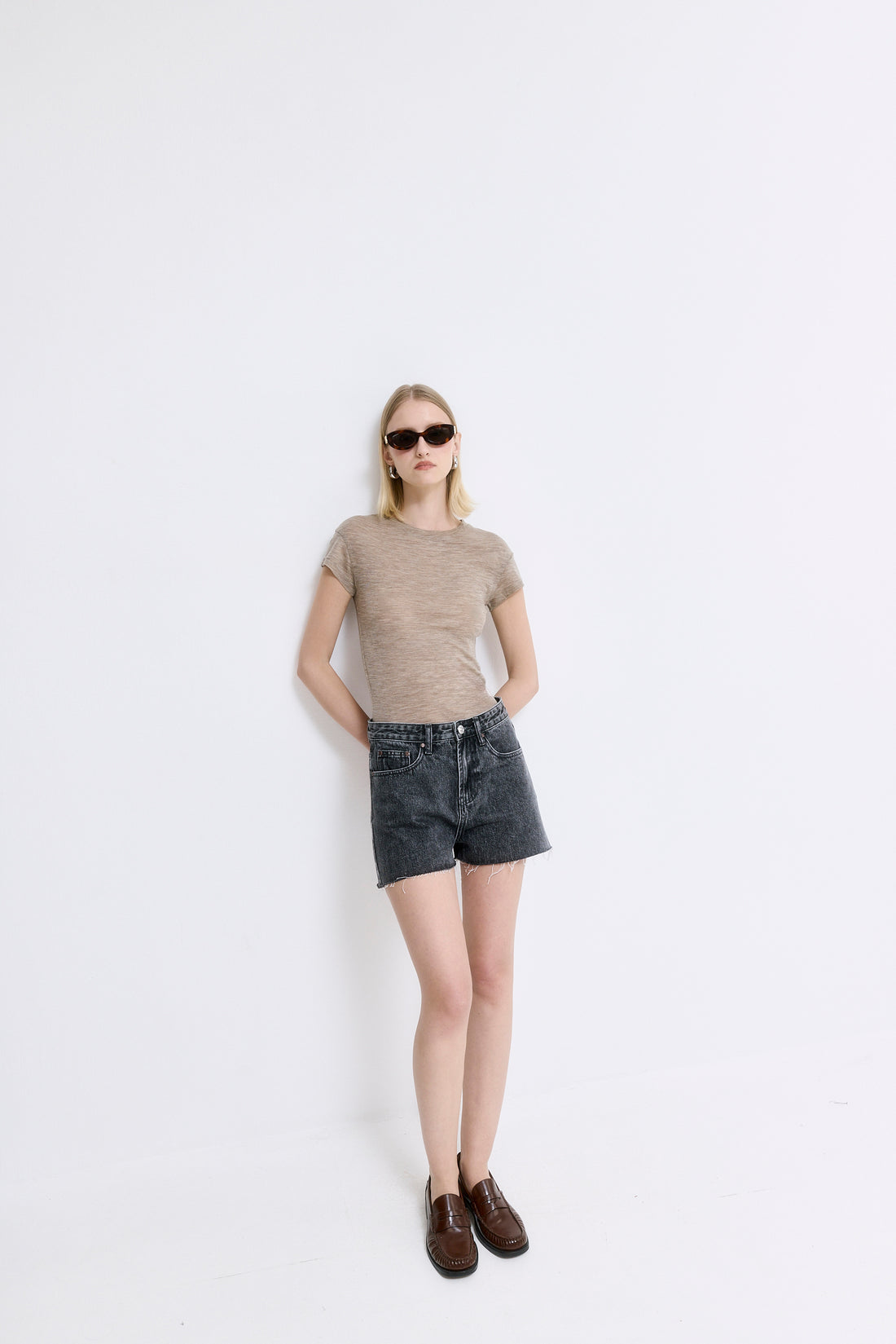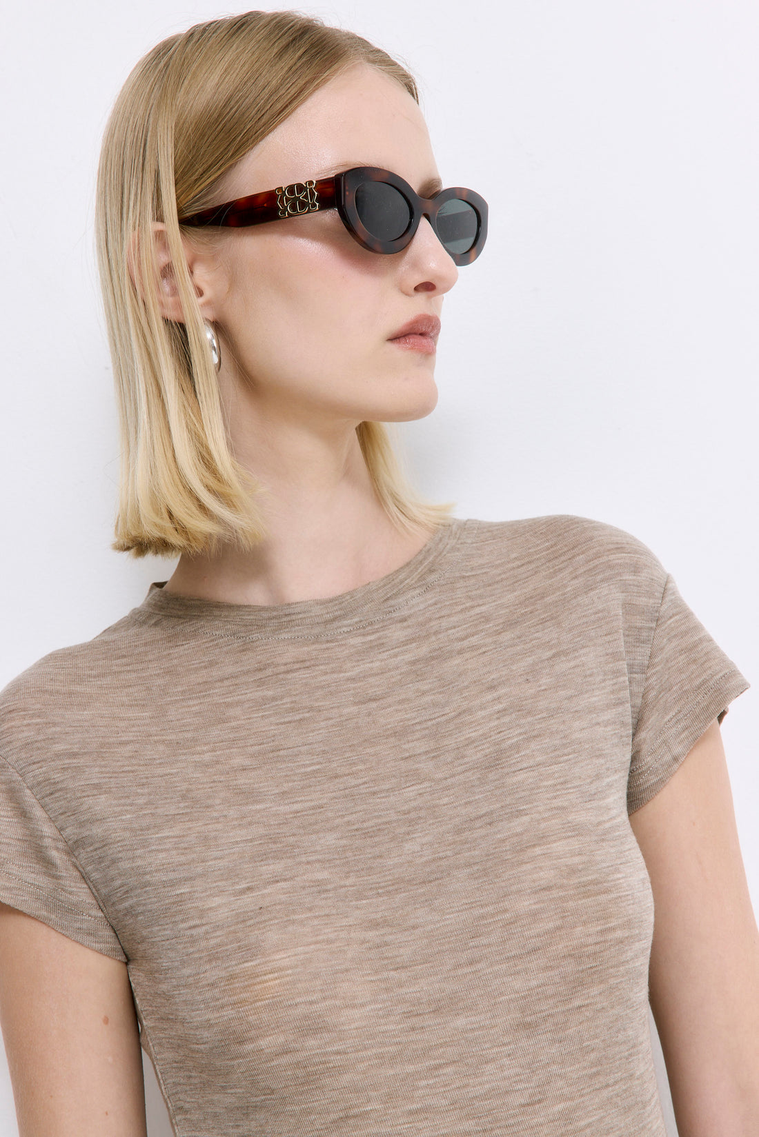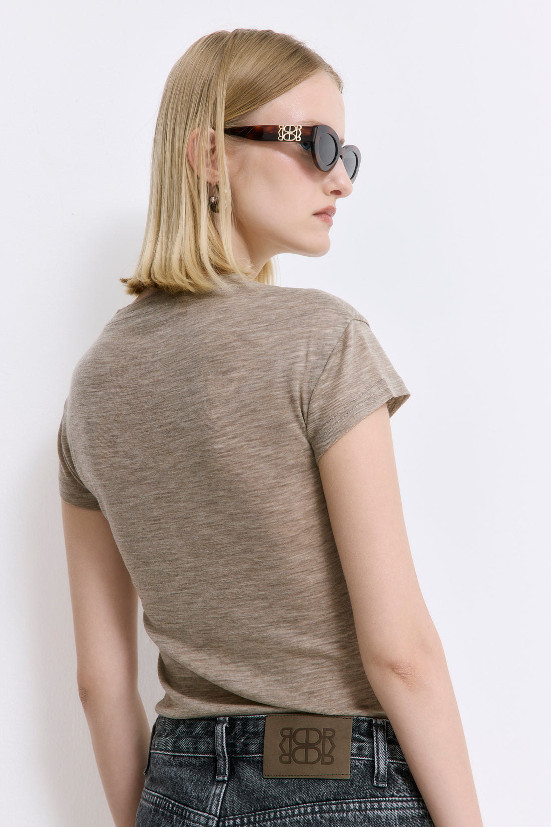 Our fitted wool cup tee is a must having piece from our thin wool collection. Made from ultra-light, breathable wool that regulates temperature and wicks moisture — keeping you cool, dry, and effortlessly chic all season long. Crew neckline. Short angled cut sleeves. Fitted silhouette. Tonal logo embroidered on the side. Clean finish. Style it with our perfect denim mini skirt, our chic scrunchie and finish the look with our timeless Rodika suede tote bag.