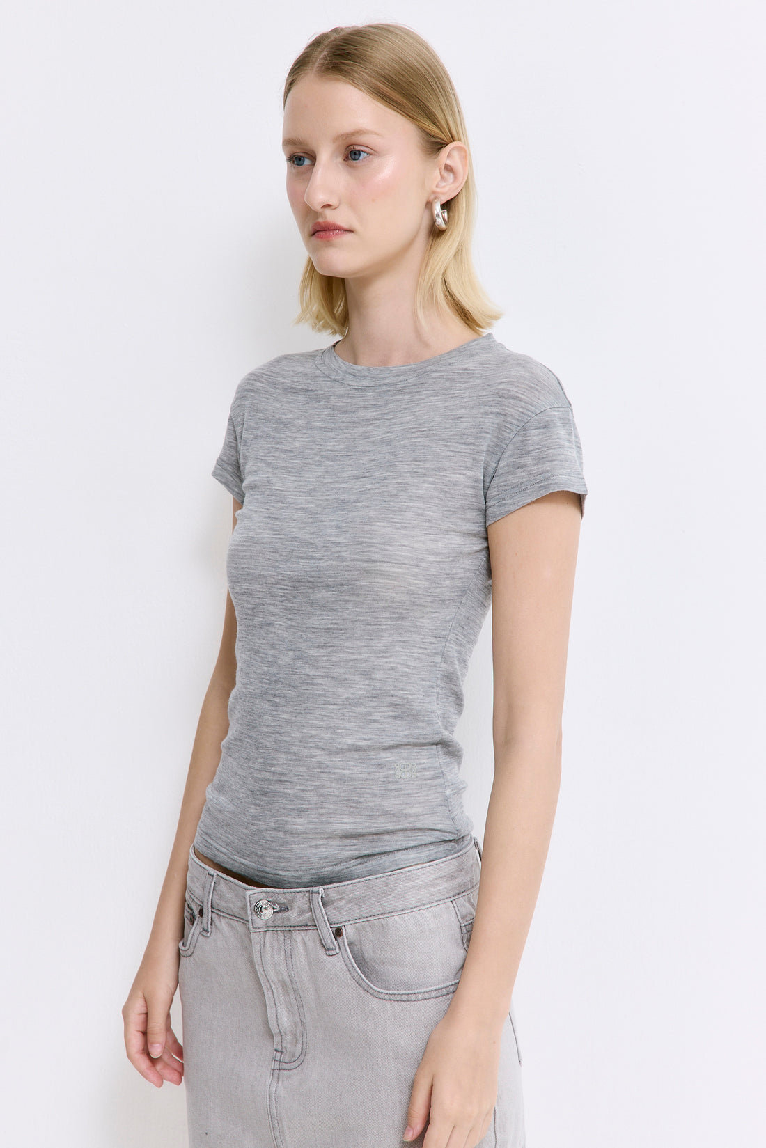 Our fitted wool cup tee is a must having piece from our thin wool collection. Made from ultra-light, breathable wool that regulates temperature and wicks moisture — keeping you cool, dry, and effortlessly chic all season long. Crew neckline. Short angled cut sleeves. Fitted silhouette. Tonal logo embroidered on the side. Clean finish. Style it with our perfect denim mini skirt, our chic scrunchie and finish the look with our timeless Rodika suede tote bag.