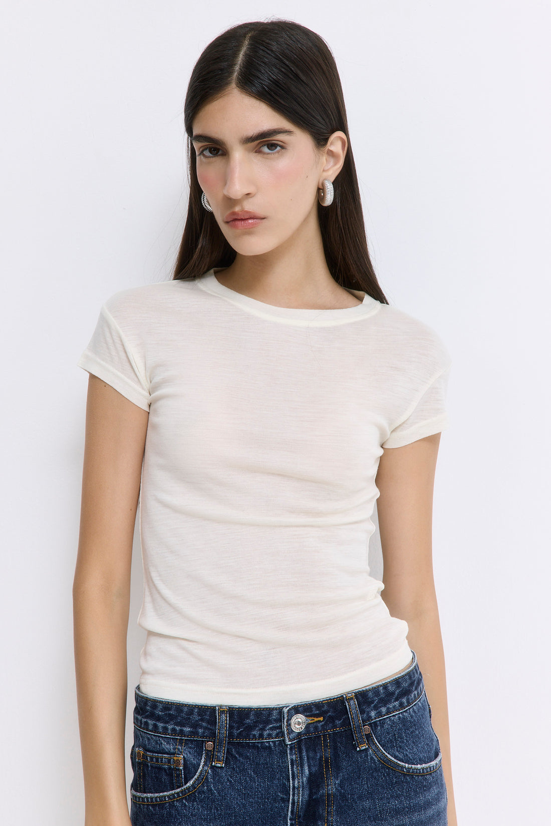 Our fitted wool cup tee is a must having piece from our thin wool collection. Made from ultra-light, breathable wool that regulates temperature and wicks moisture — keeping you cool, dry, and effortlessly chic all season long. Crew neckline. Short angled cut sleeves. Fitted silhouette. Tonal logo embroidered on the side. Clean finish. Style it with our perfect denim mini skirt, our chic scrunchie and finish the look with our timeless Rodika suede tote bag.