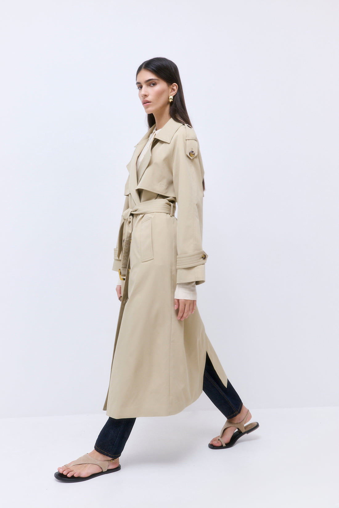 A refreshing take on our classic trench coat. Oversized. Double breasted. Fully lined jacket. Front and back flap. Embroidered tonal logo on flap. Engraved buttons. Epaulettes. Wide side pockets. Back yoke. Stitched belt detail. Belt at the waist. Style it with our iconic Oval Sunglasses and our timeless Yvon Shoulder Bag for an effortless transitional look, from summer to fall.
