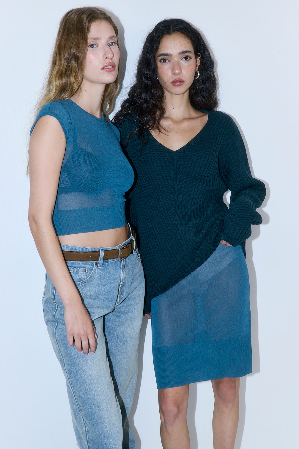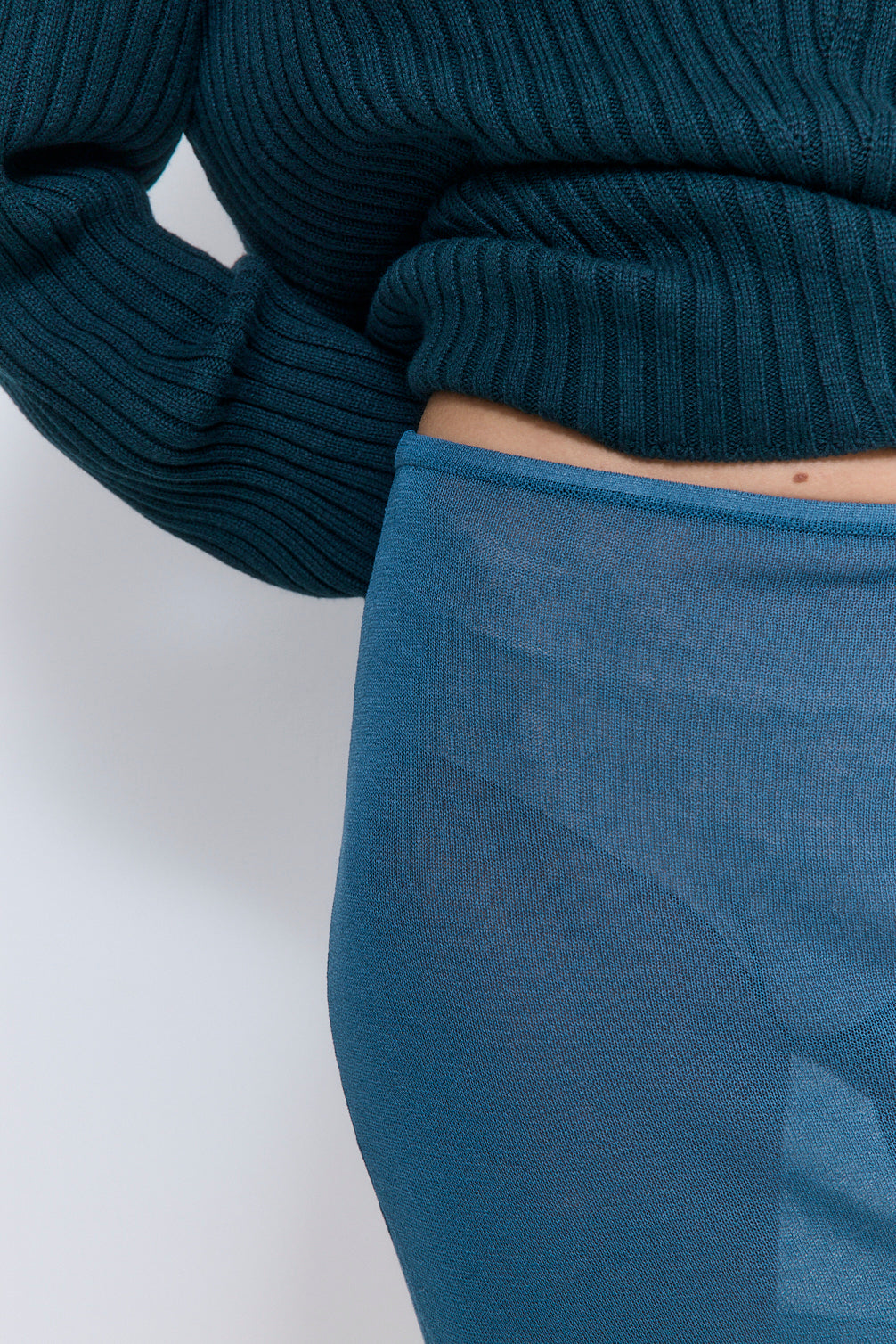 Our new Sheer Midi Skirt is the perfect going-out staple. Made from delicate sheer fabric for a light, airy feel. Thin elastic waistband. Wide ribbed hem. Adjustable low waist. Fully fashioned. Midi length skirt. Complete the look with our matching Sheer Baby Tee and chic Rodika Tote Bag for effortless sophistication.