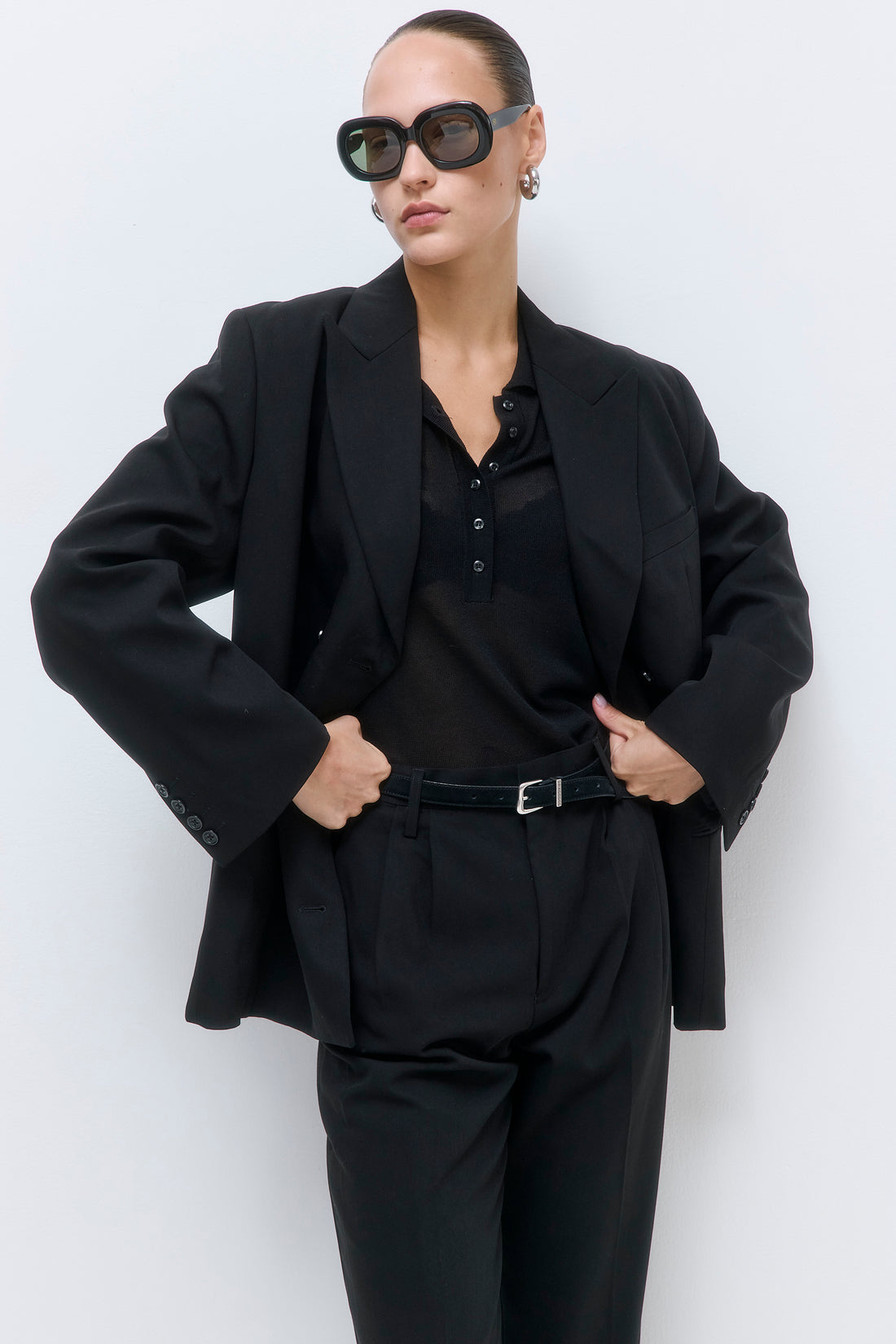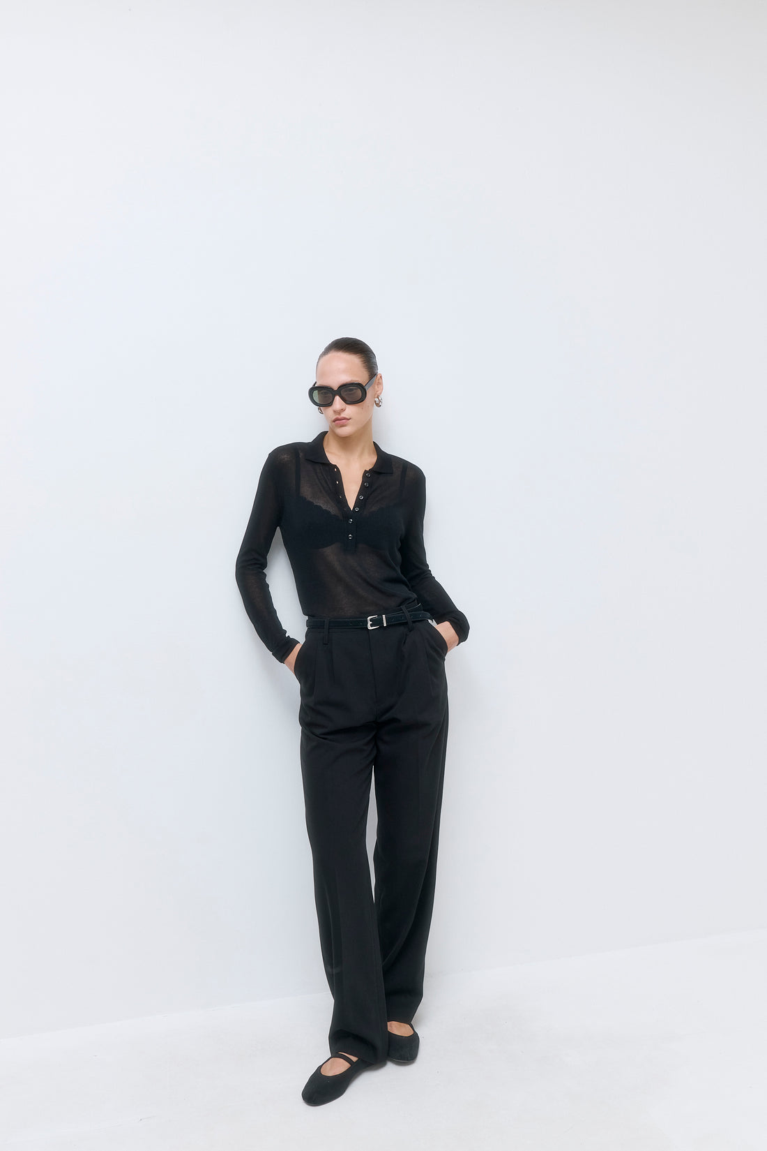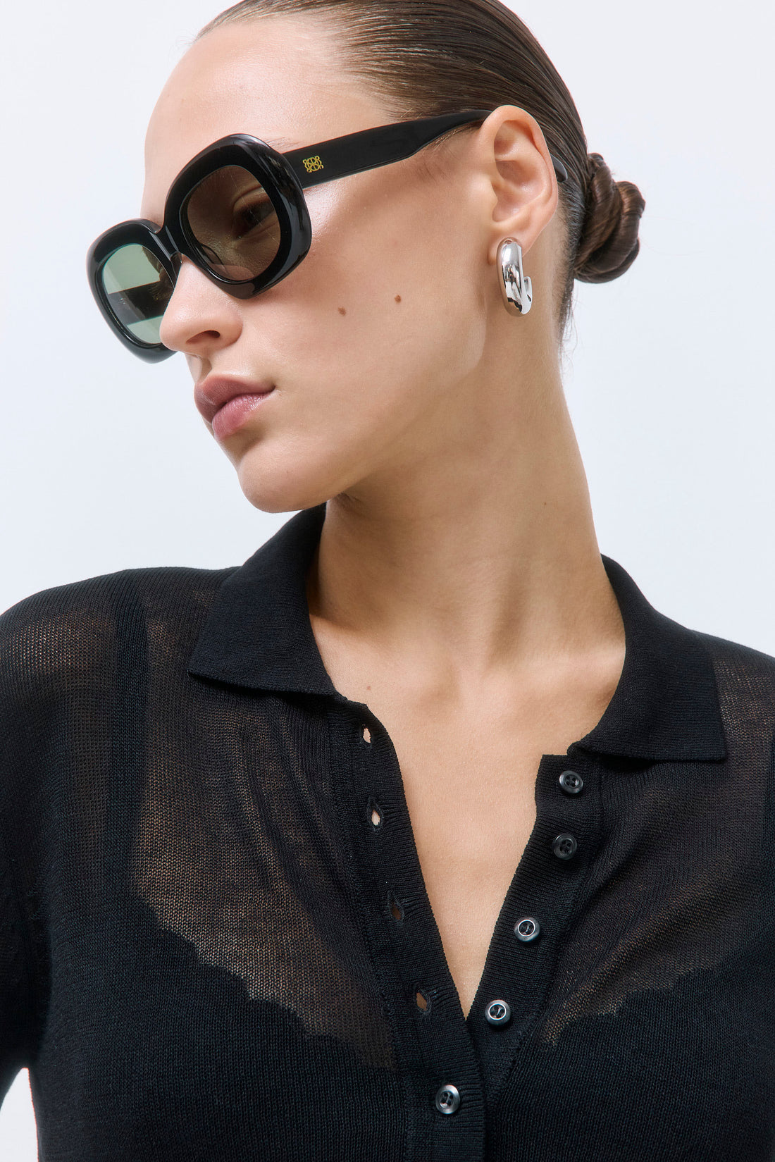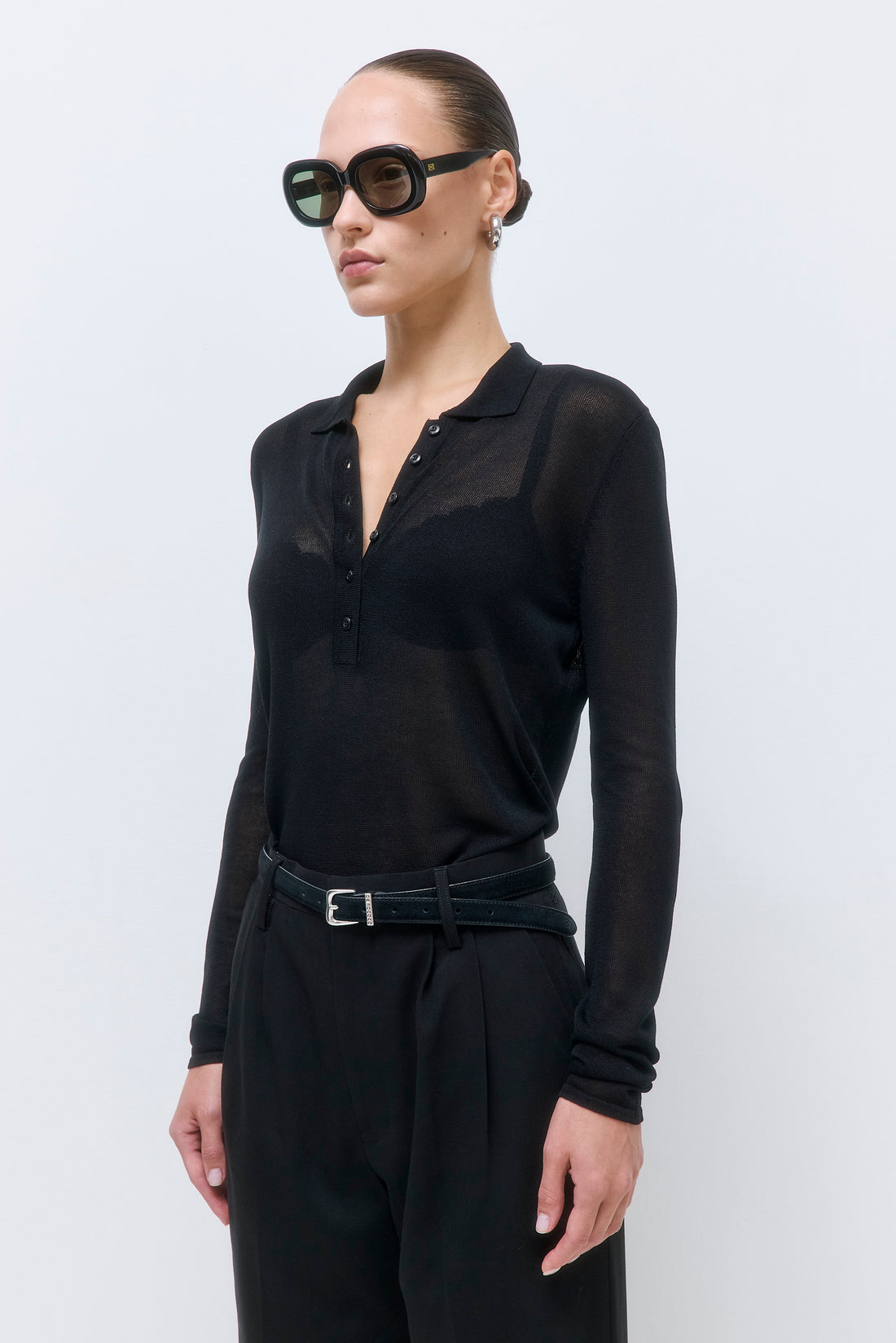 Our new Sheer Polo Tee is guaranteed to elevate any outfit with effortless sophistication. Loose fit. Sheer fabric. Shiny tonal buttons. Fully fashioned. Fine ribbed cuffs at the sleeves and hem. Style it with our matching Sheer Midi Skirt and timeless Oval Sunglasses for a refined, modern vibe.