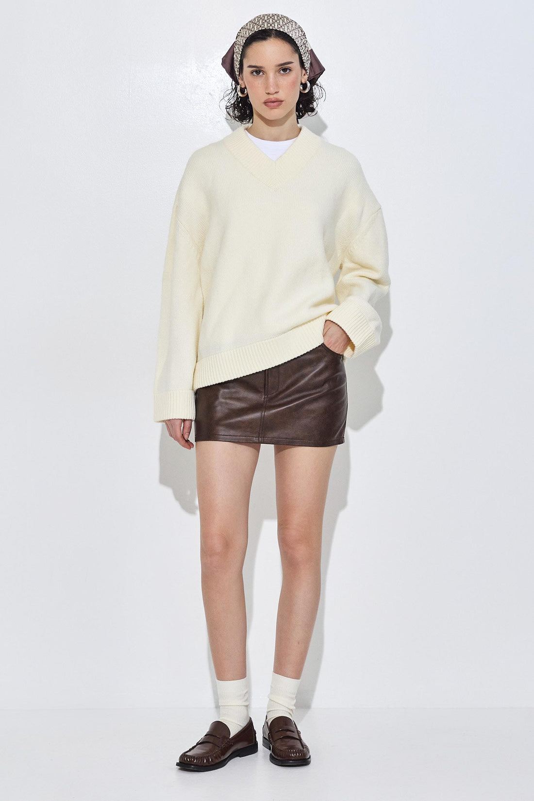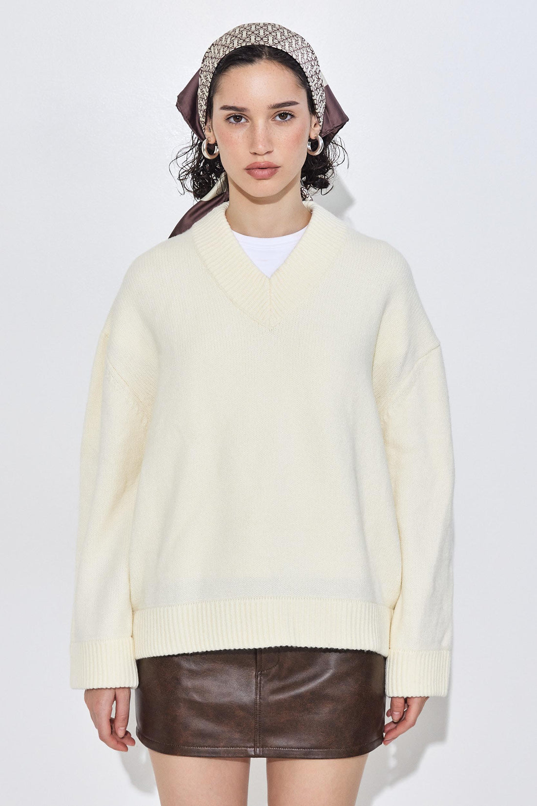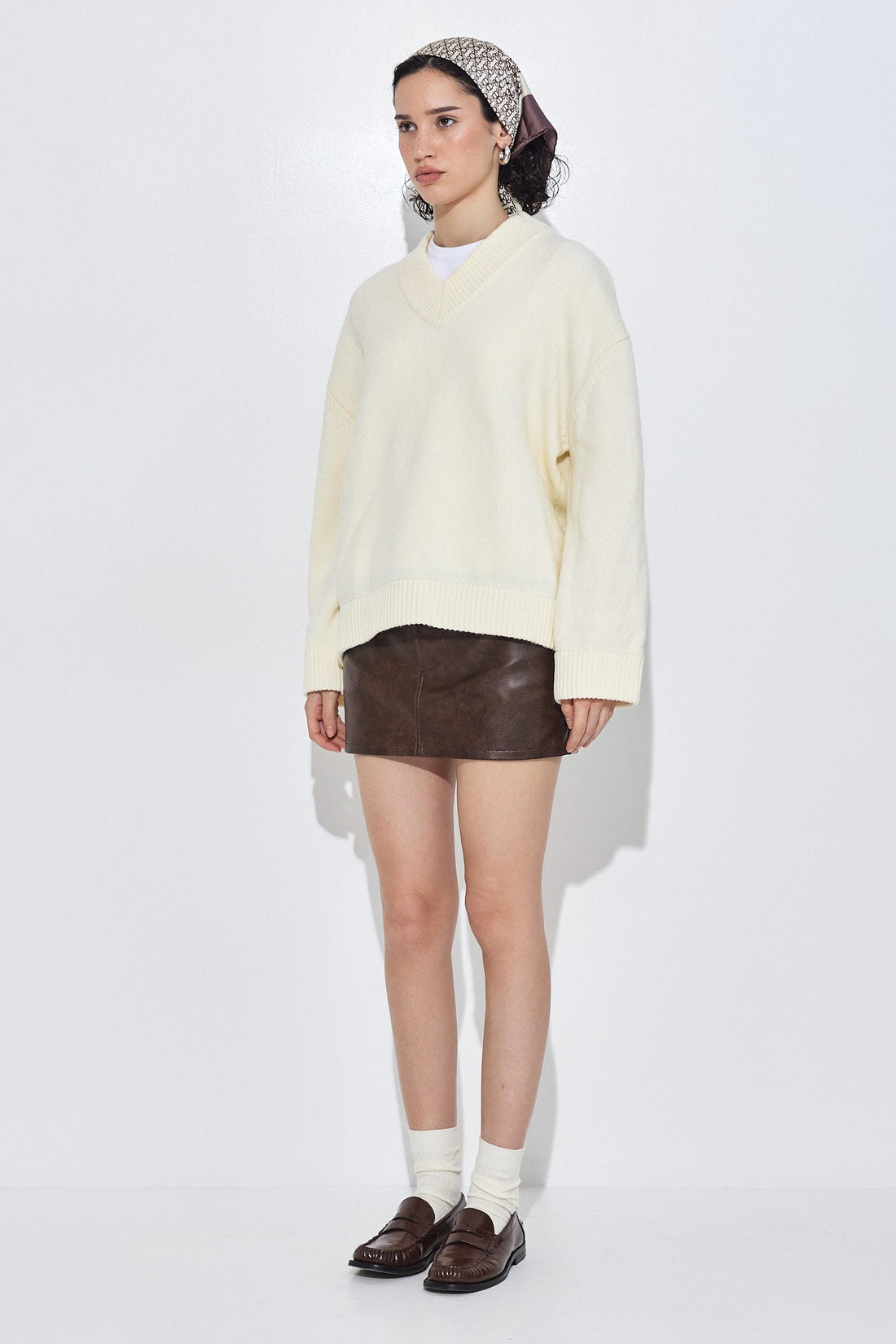 The coziest addition to our luxurious fully fashioned knitwear. Wide ribbed v neck sweater. Oversized fit for the coziest feel. Drop shoulder sleeves. Wide ribbed finish. Silicone tonal logo patch on the back. Layer it over a classic white tee, add a short leather mini skirt and a silk scarf to tie the whole look together effortlessly.