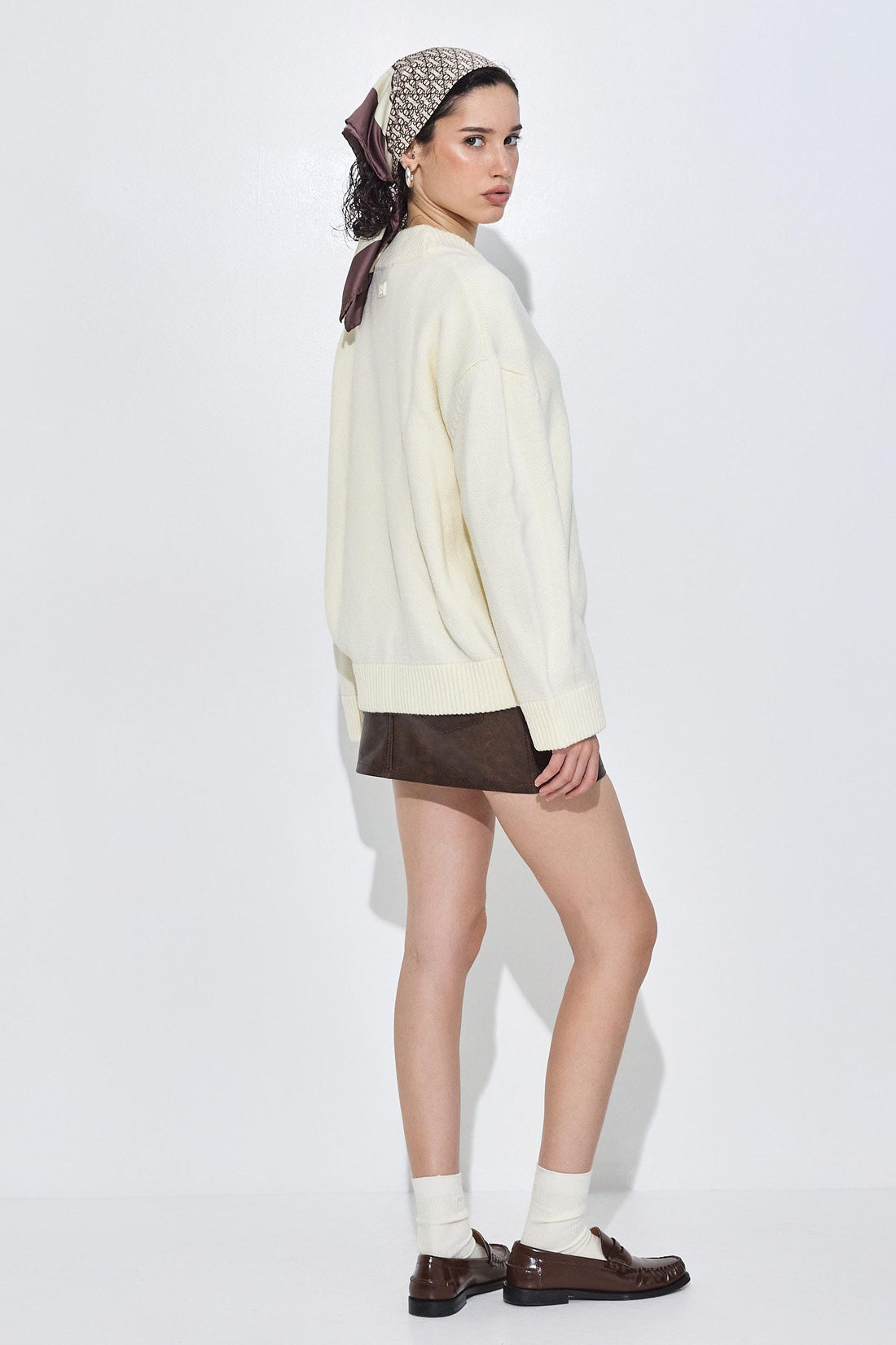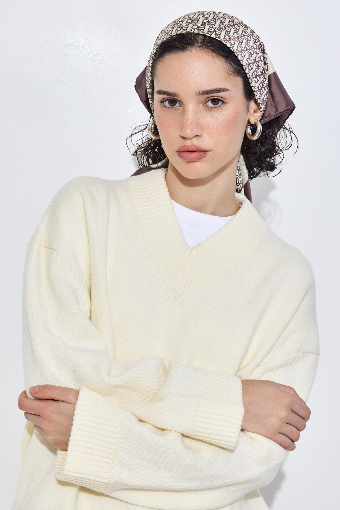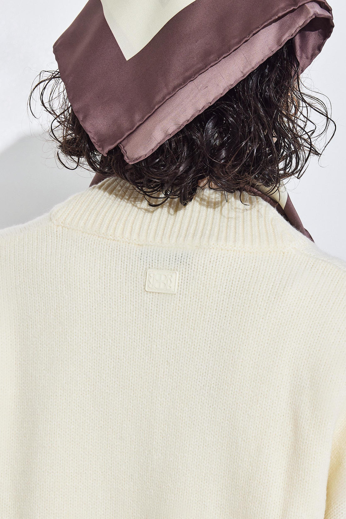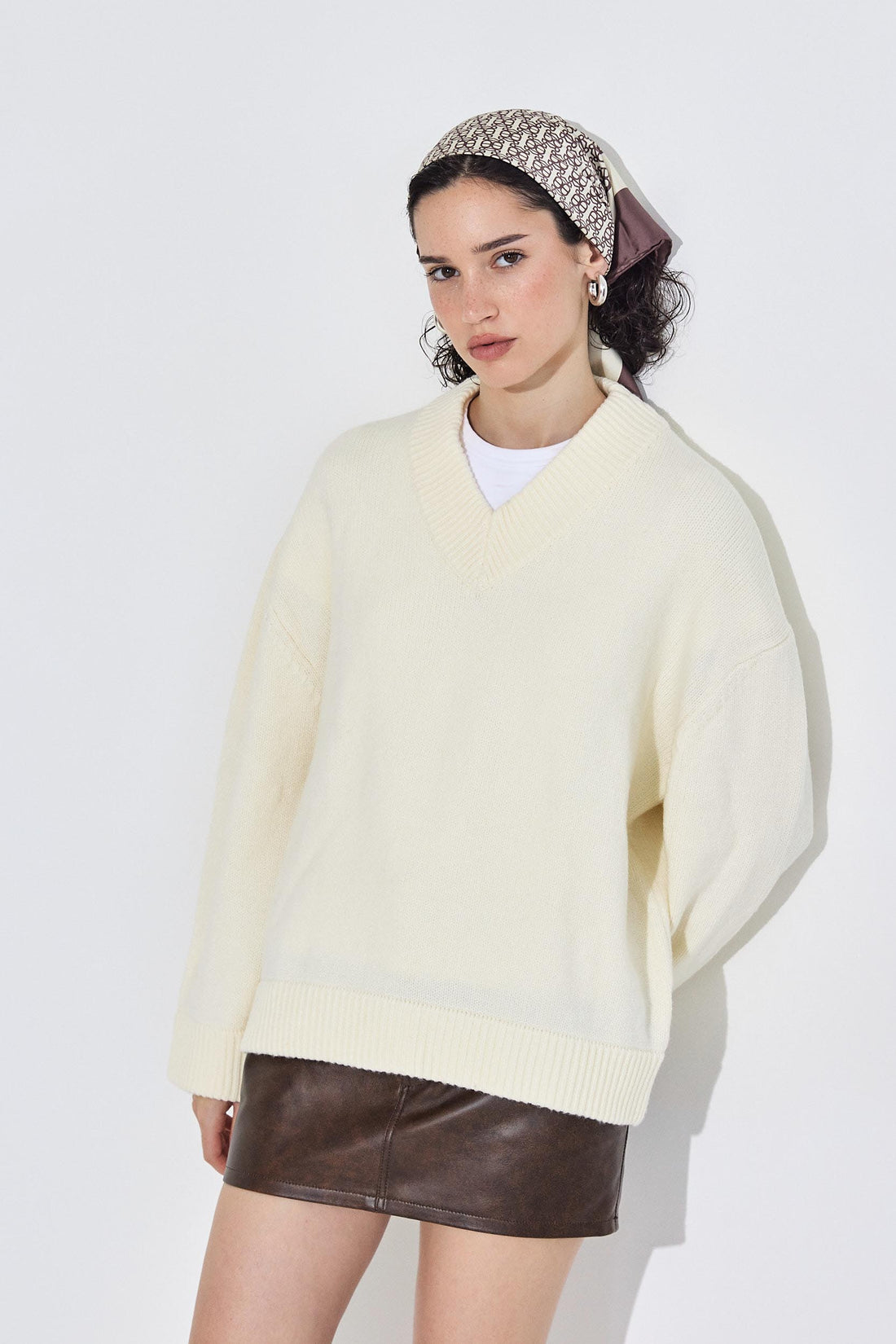 The coziest addition to our luxurious fully fashioned knitwear. Wide ribbed v neck sweater. Oversized fit for the coziest feel. Drop shoulder sleeves. Wide ribbed finish. Silicone tonal logo patch on the back. Layer it over a classic white tee, add a short leather mini skirt and a silk scarf to tie the whole look together effortlessly.