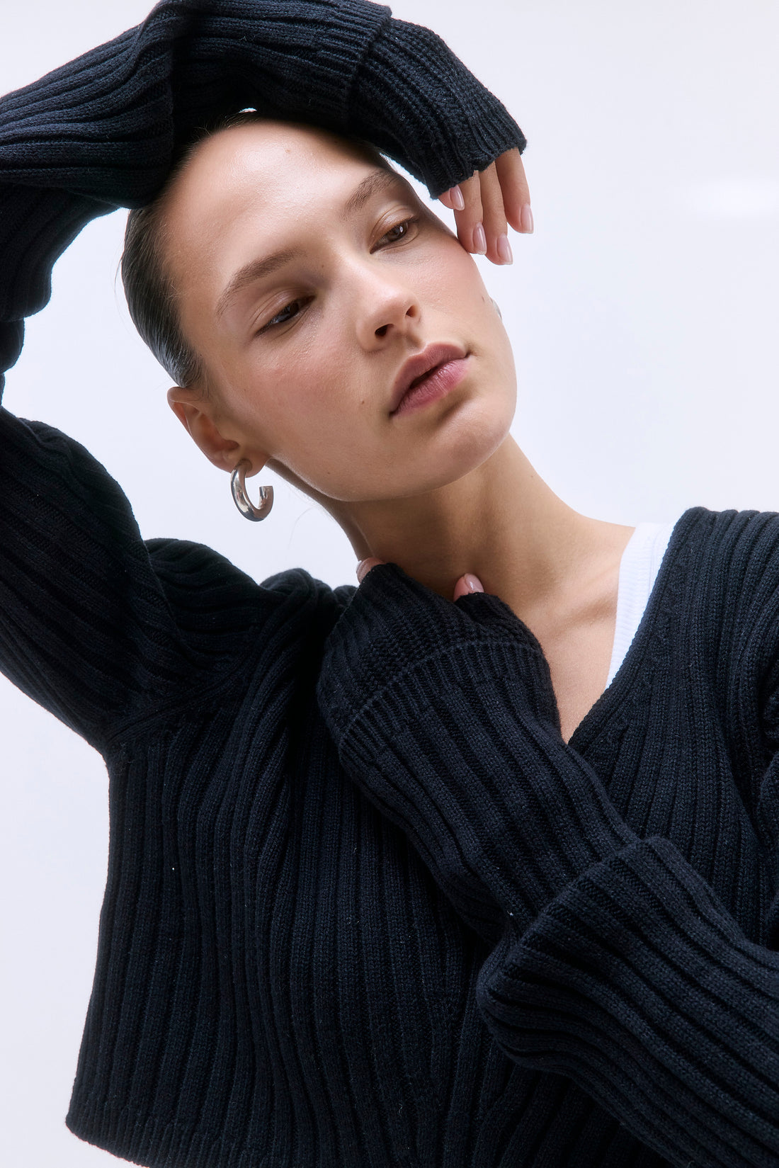 Upgrade your winter outfits with our chic new Fingerless Knit Gloves. Thick ribbed hem and finish. detailed with a tonal silicon logo patch on one hand. Style it with our new Chunky Ribbed Scarf and iconic Double Wool Cropped Jacket for the ultimate sleek look.