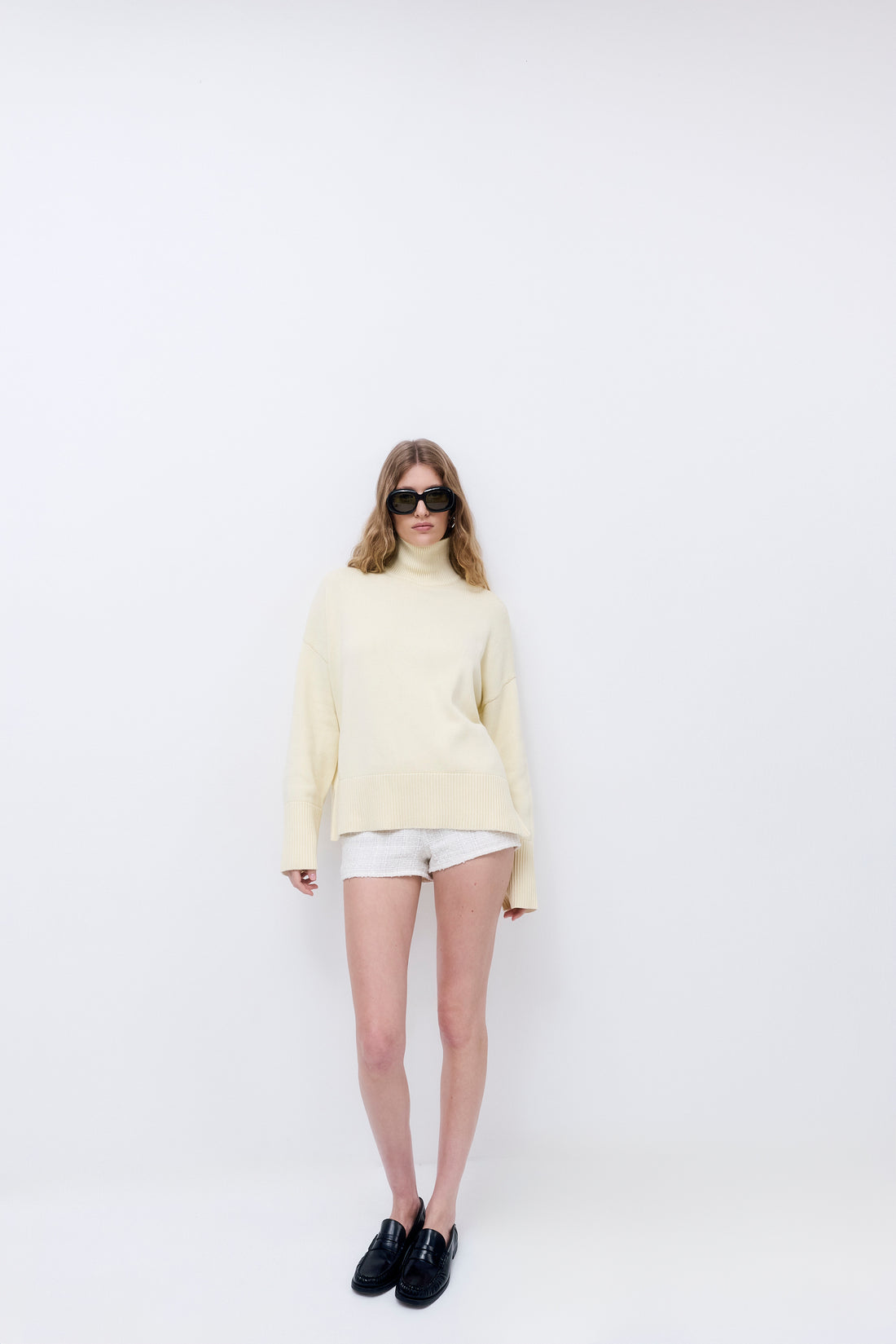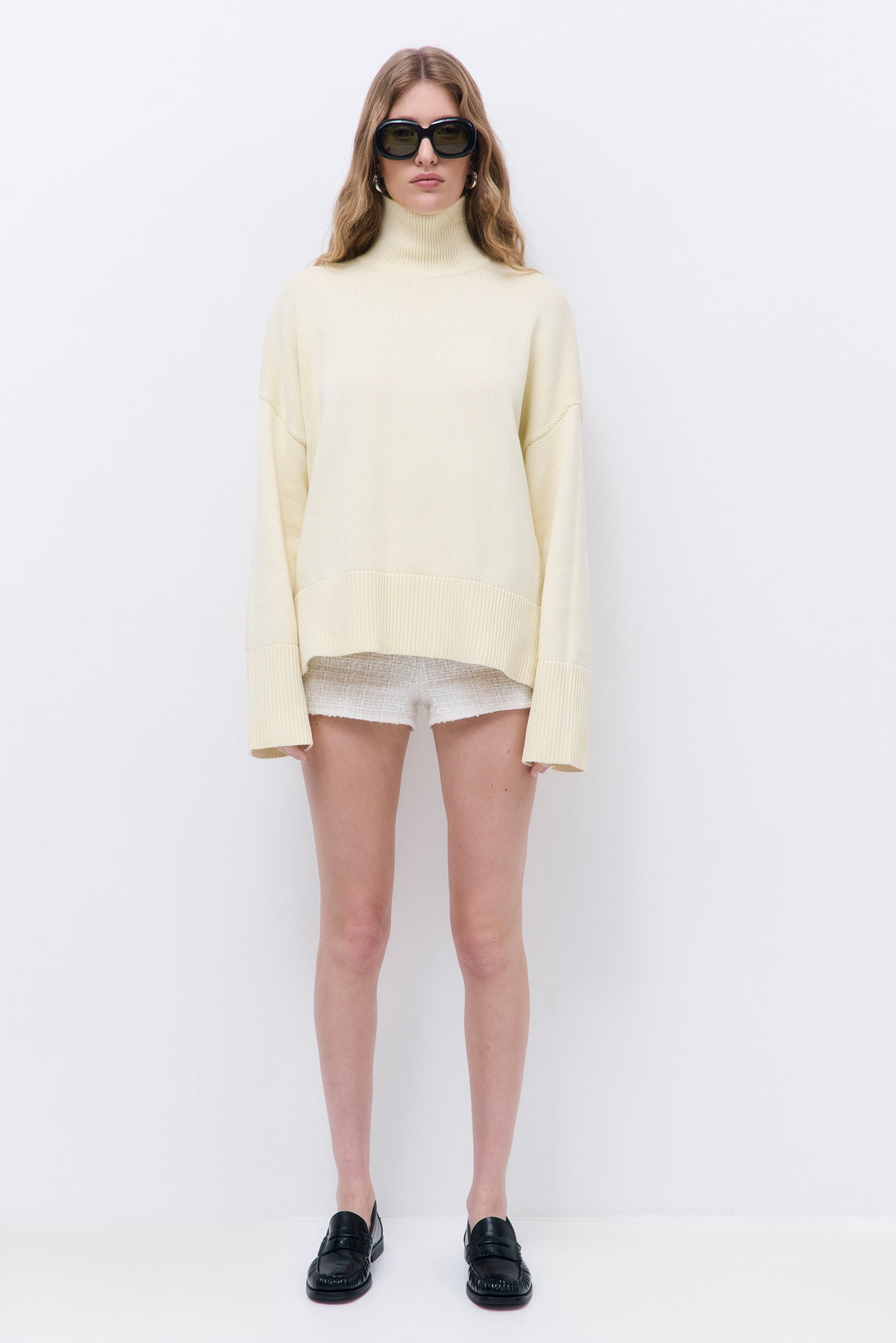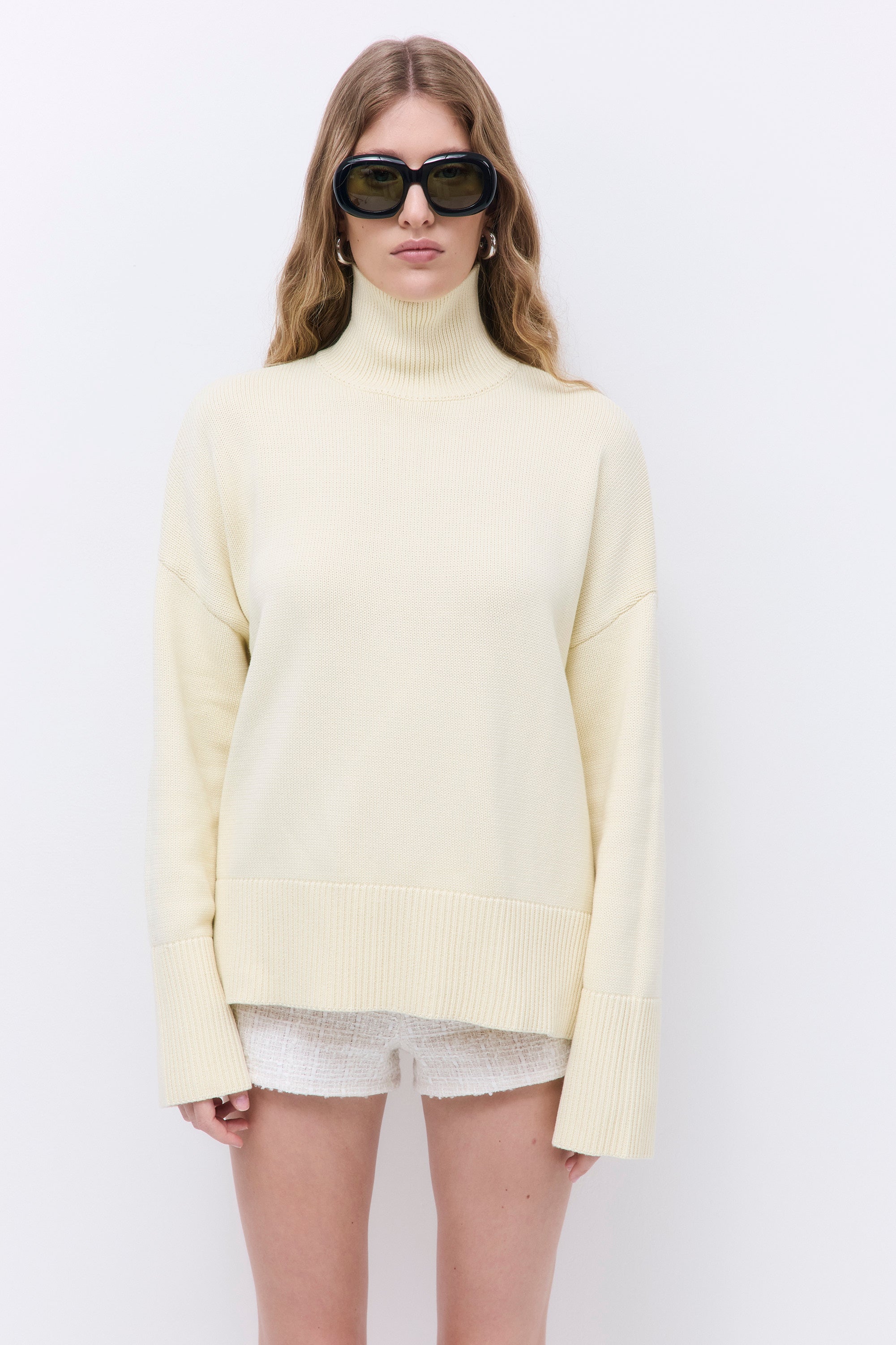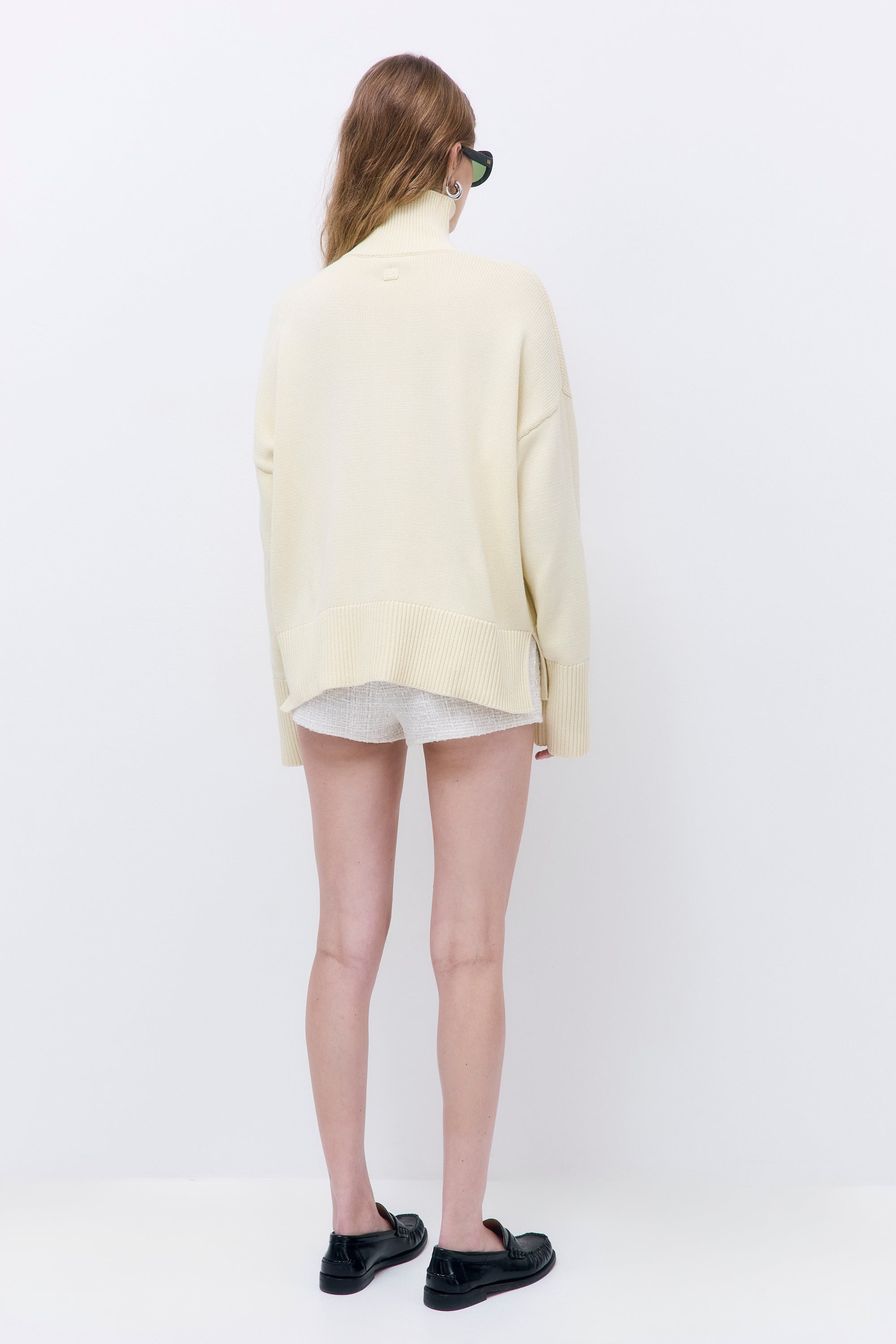 The perfect cozy winter essential. Turtleneck. Oversized fit. Slits on the side. Dropped shoulders. Wide rib hem. Tonal silicon logo on the back. Fully fashioned. Style it with our with our chic Sheer Midi Skirt and pair these with our iconic Yvon Shoulder Bag for an effortless everyday look.