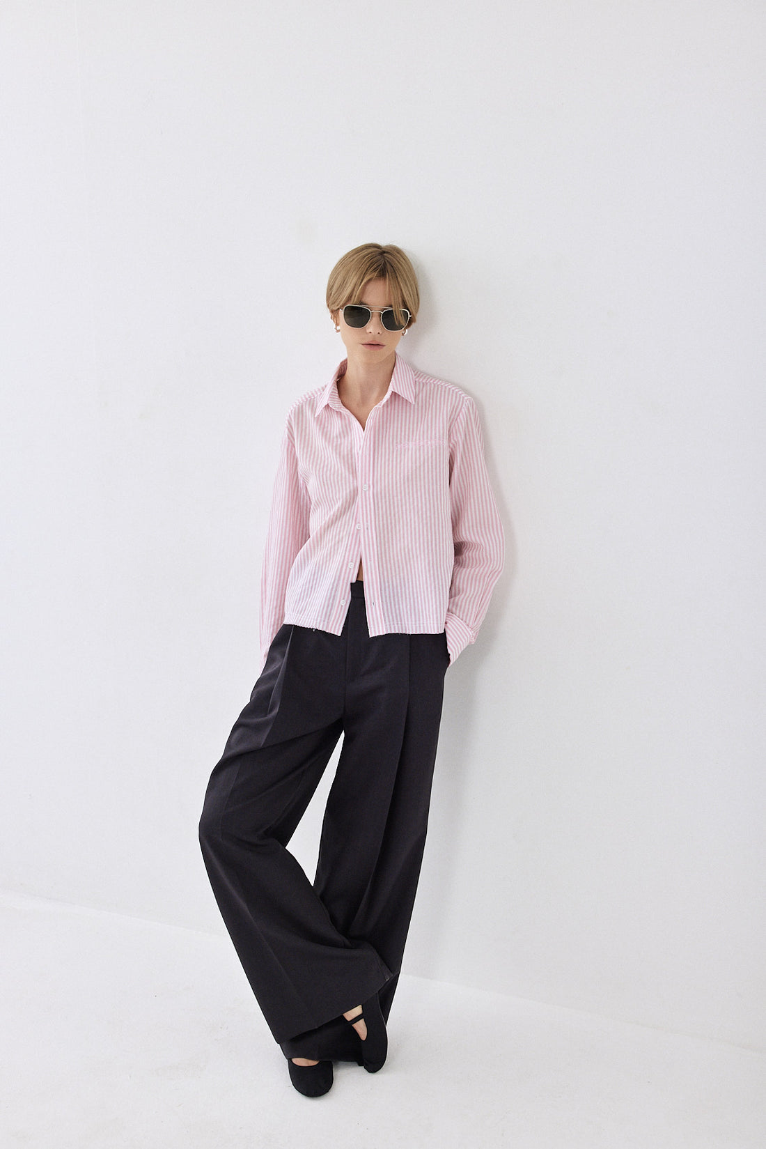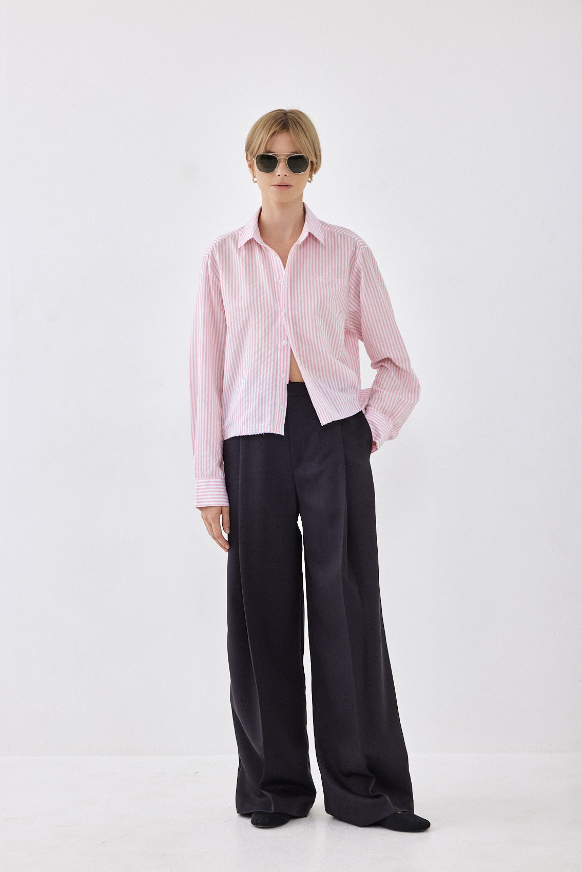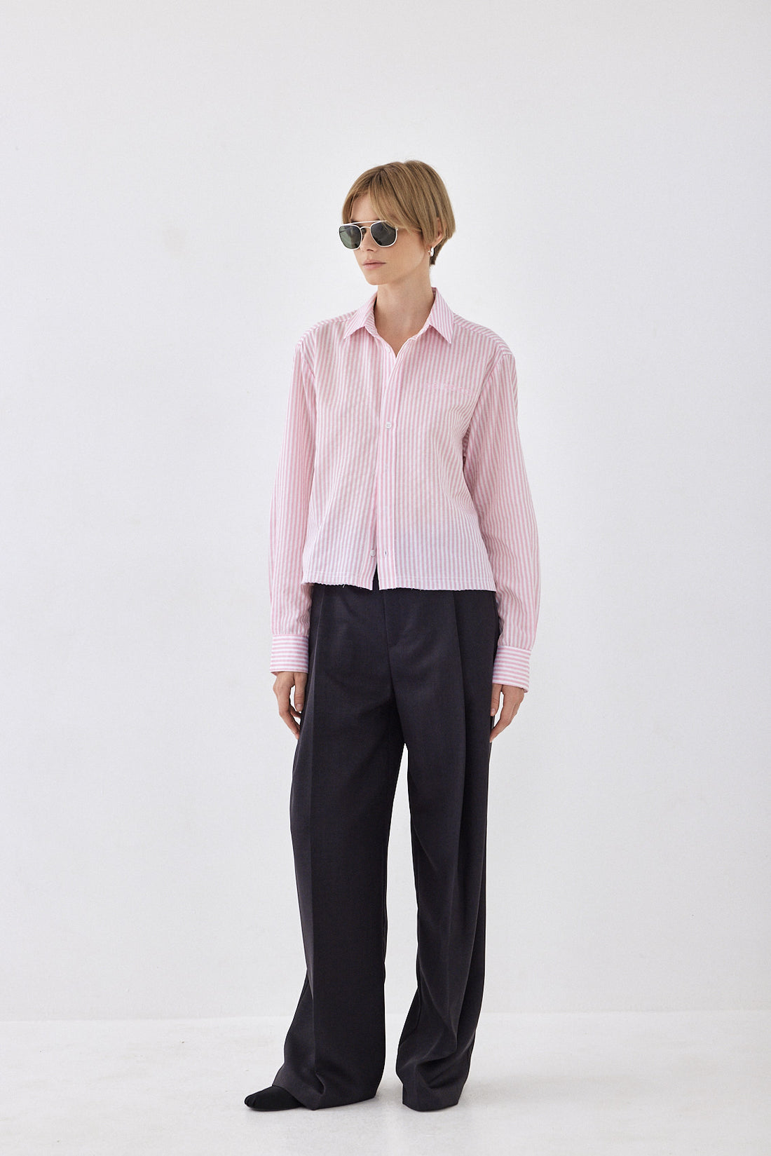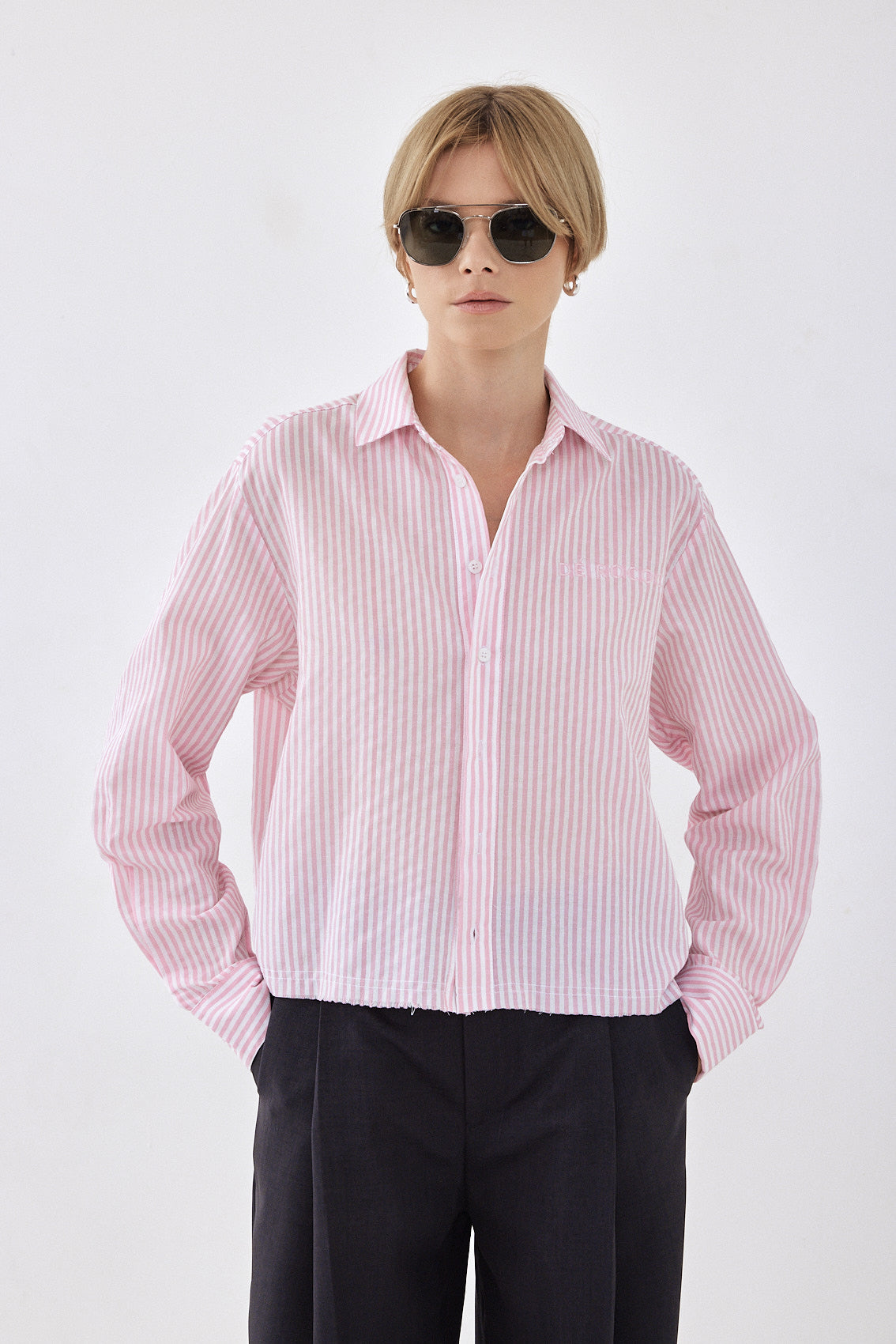 Cropped button down shirt. Featuring frontal button closure. Raw hemline. Lapel collar and oversized cuffs. Dé Rococo embroidery on the front. Crispy, breathable lightweight material. Style it with your favorite pair of denim and add a kitten heel for the ultimate versatile look, perfect for both day and night.