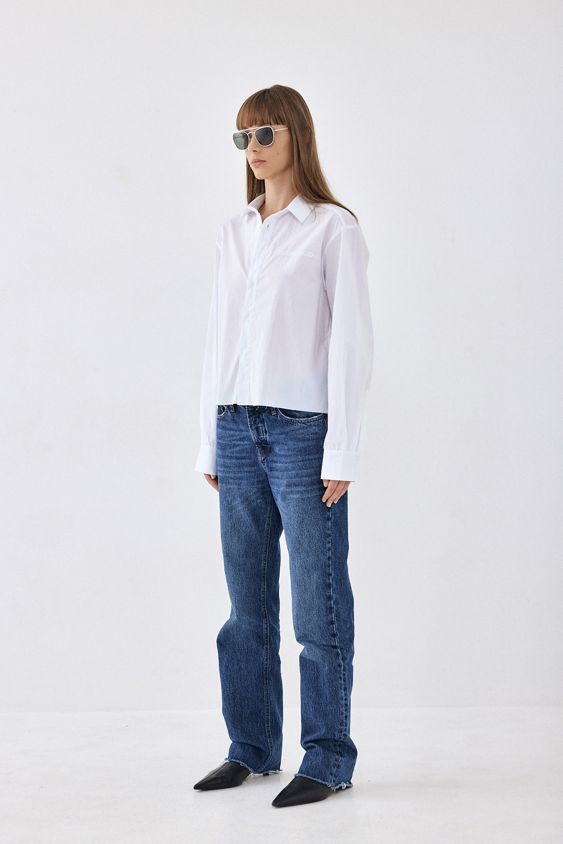 Cropped button down shirt. Featuring frontal button closure. Raw hemline. Lapel collar and oversized cuffs. Dé Rococo embroidery on the front. Crispy, breathable lightweight material. Style it with your favorite pair of denim and add a kitten heel for the ultimate versatile look, perfect for both day and night.