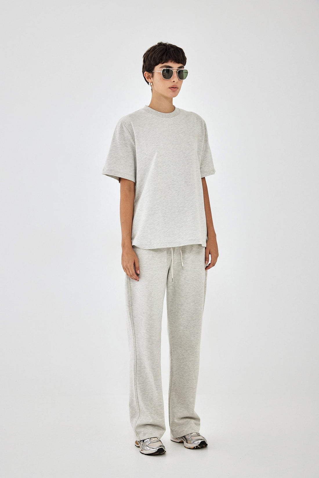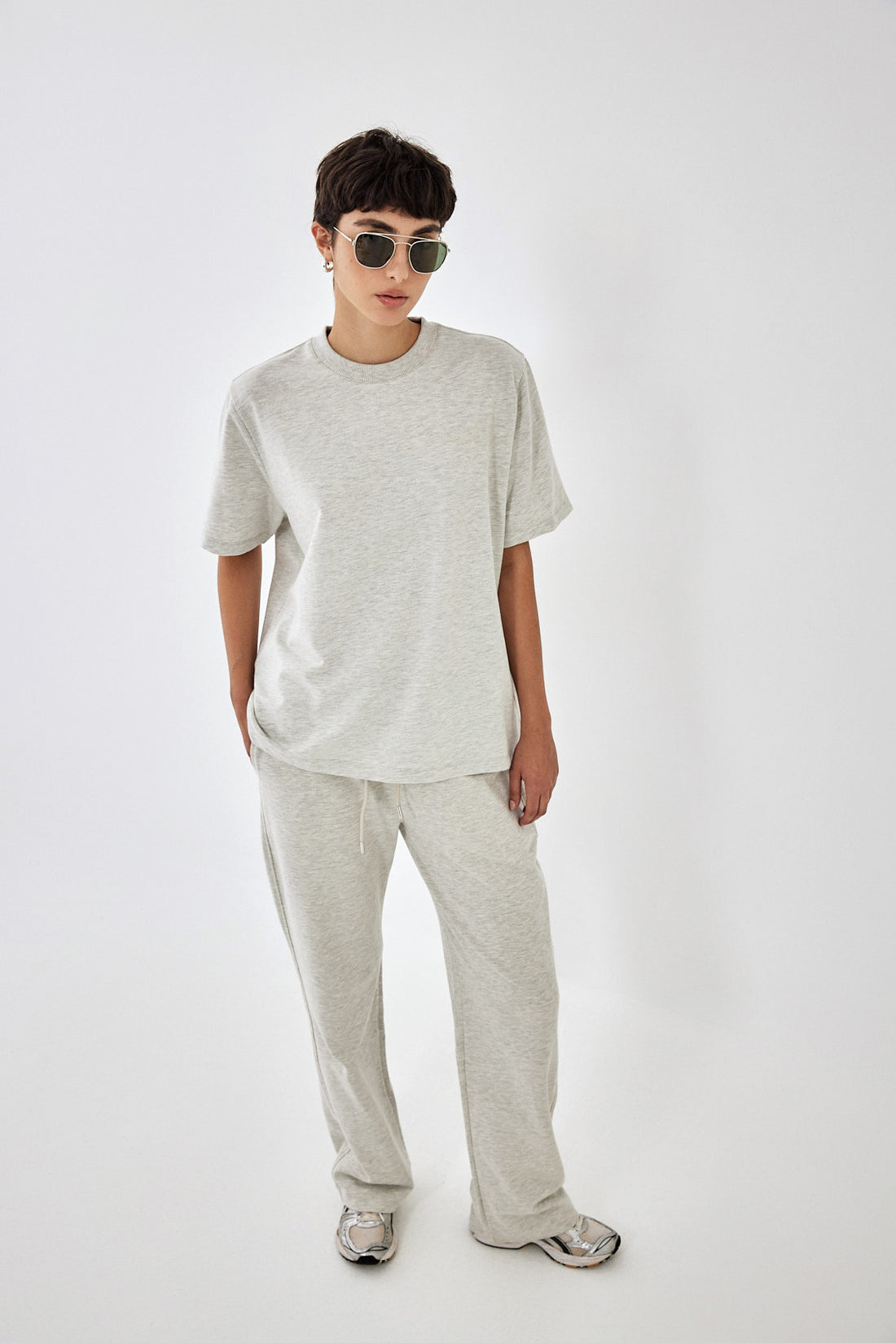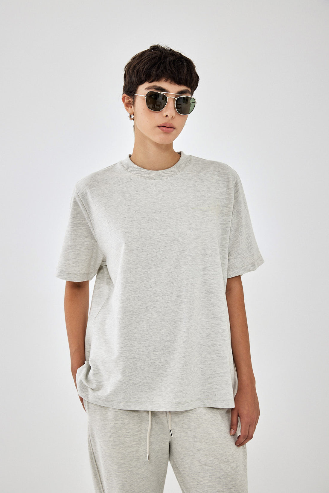 The perfect addition to your active wardrobe. T shirts in matching colors to the active sets, perfect for layering. Ribbed crew neckline. French terry. Delicate tone on tone rubber print on the front and back. Oversized fit, sits loosely on the body. Style it with the matching joggers to complete the set.