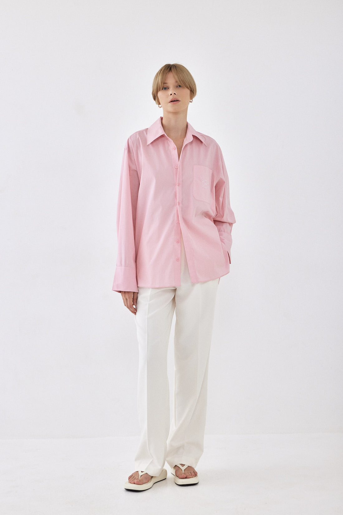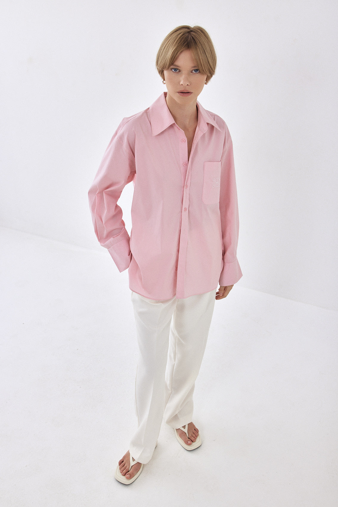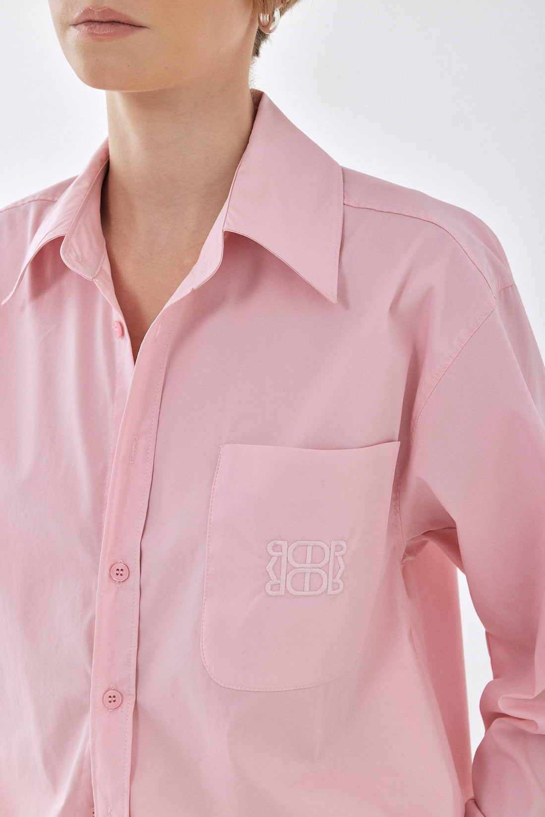 The perfect oversized cotton button down shirt. Features frontal button down closure. Lapel collar and oversized cuffs. Front pocket featuring logo. Crispy, ultra-flattering fabric. Style it with your favorite maxi skirt, a pair of studs and a kitten heel for the ultimate holiday look.