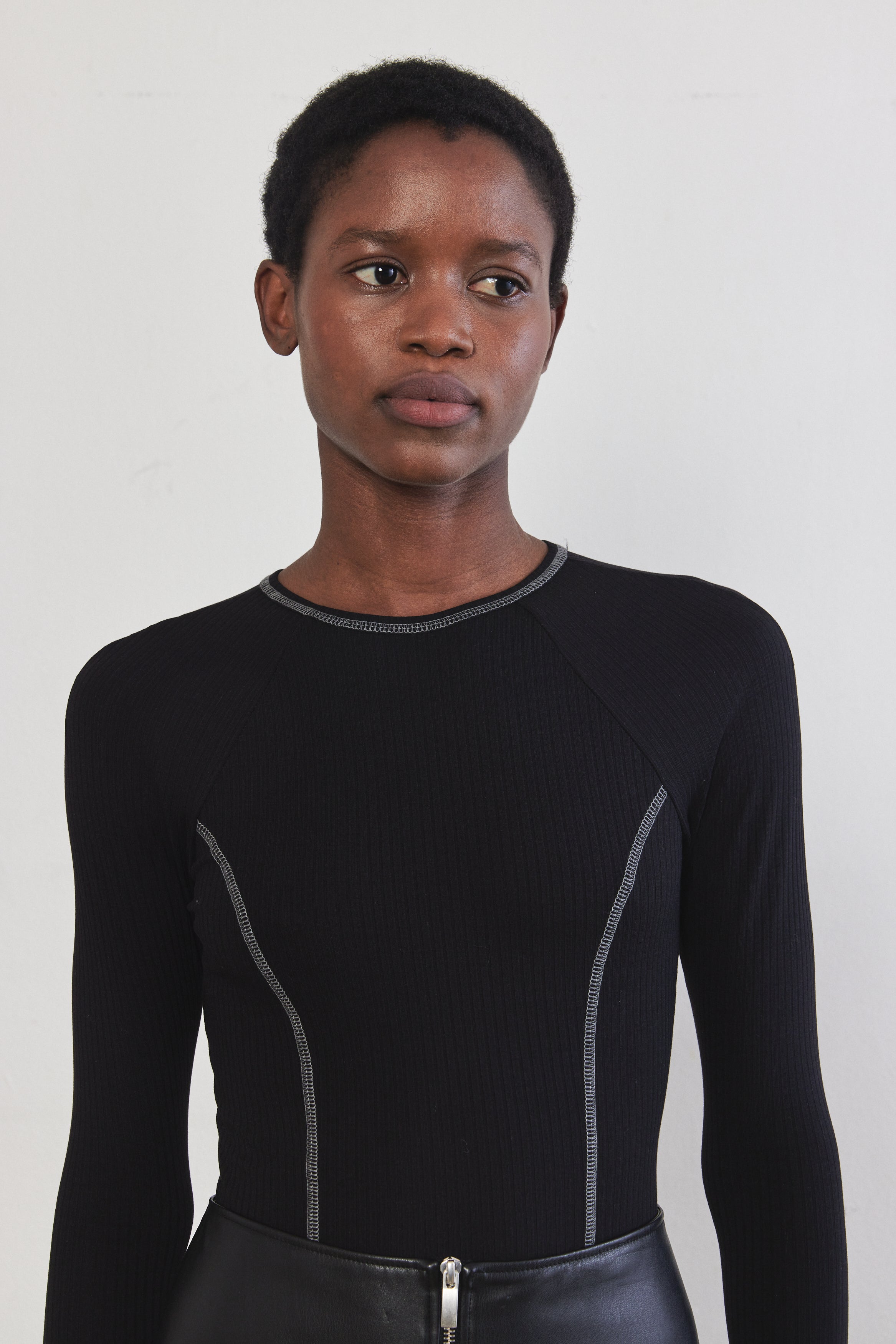 Long sleeve close fit top. Features a princess cut stitch detailes. Made from a thin ribbed stretchy fabric. Complete the look with a matching ribbed leggings.