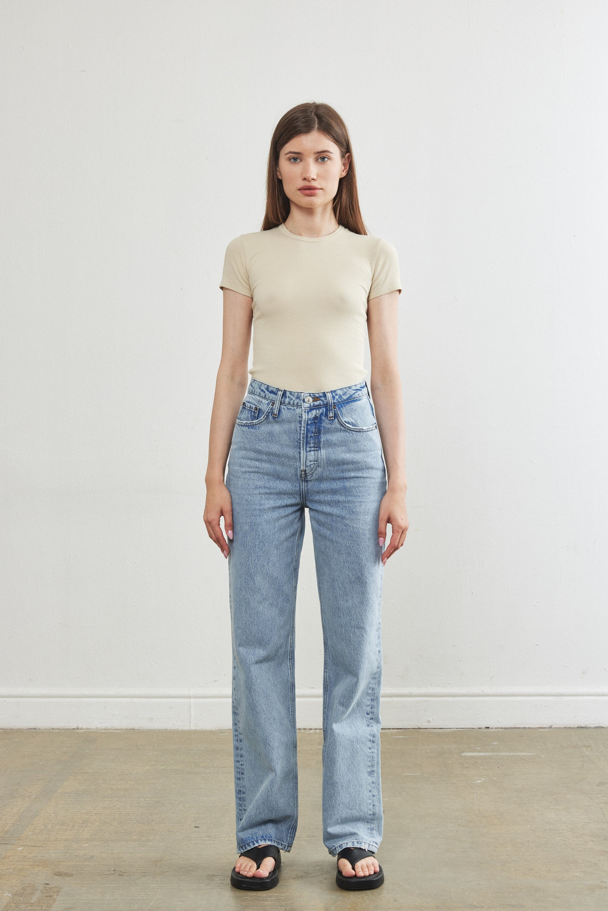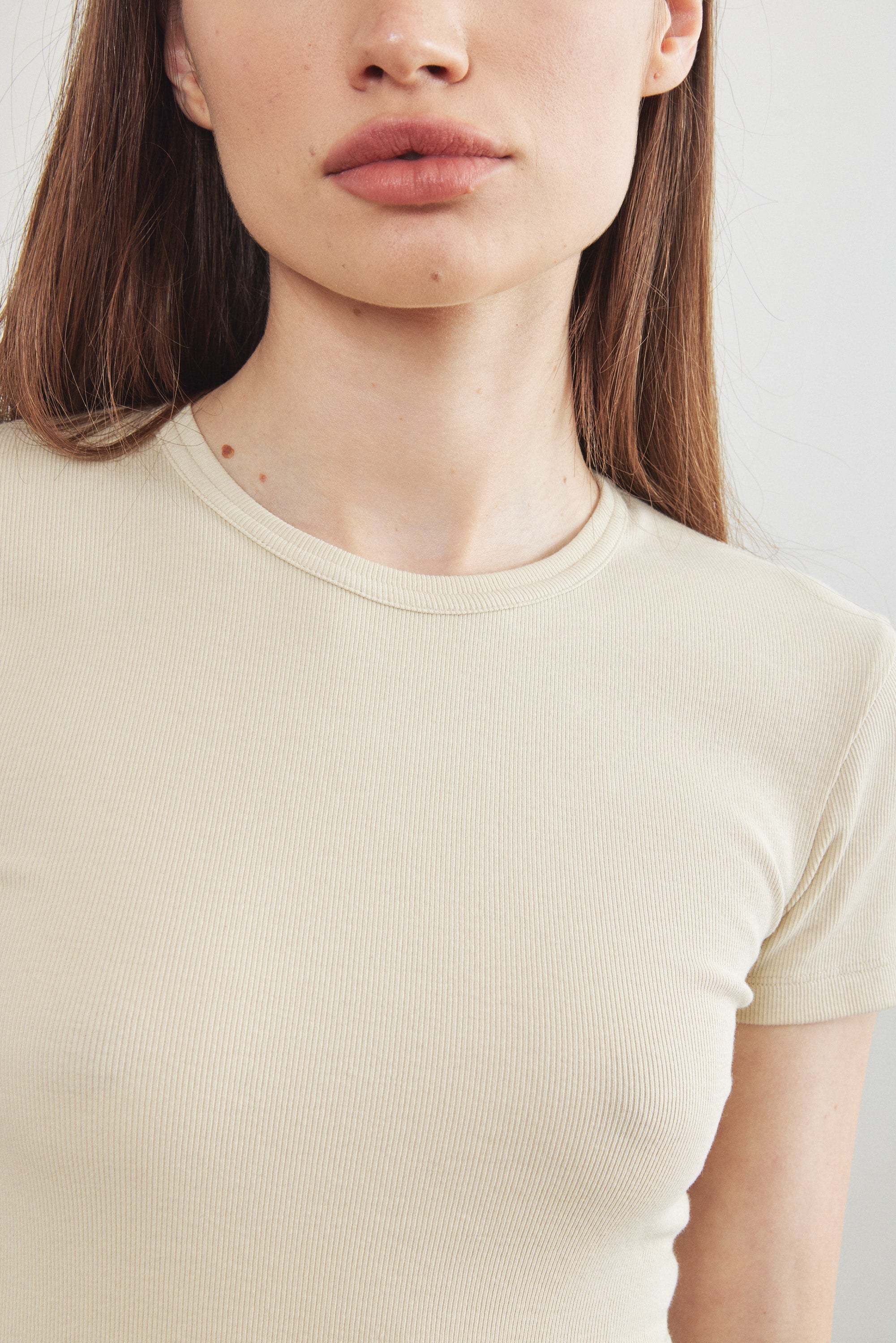 Short sleeve ribbed top. Features a crew neckline and a close fit. A basic T shirt that goes with every bottom and easy to layer.