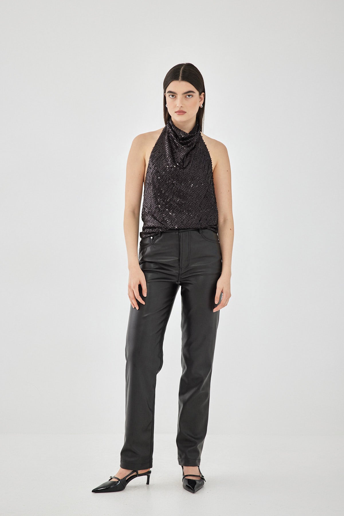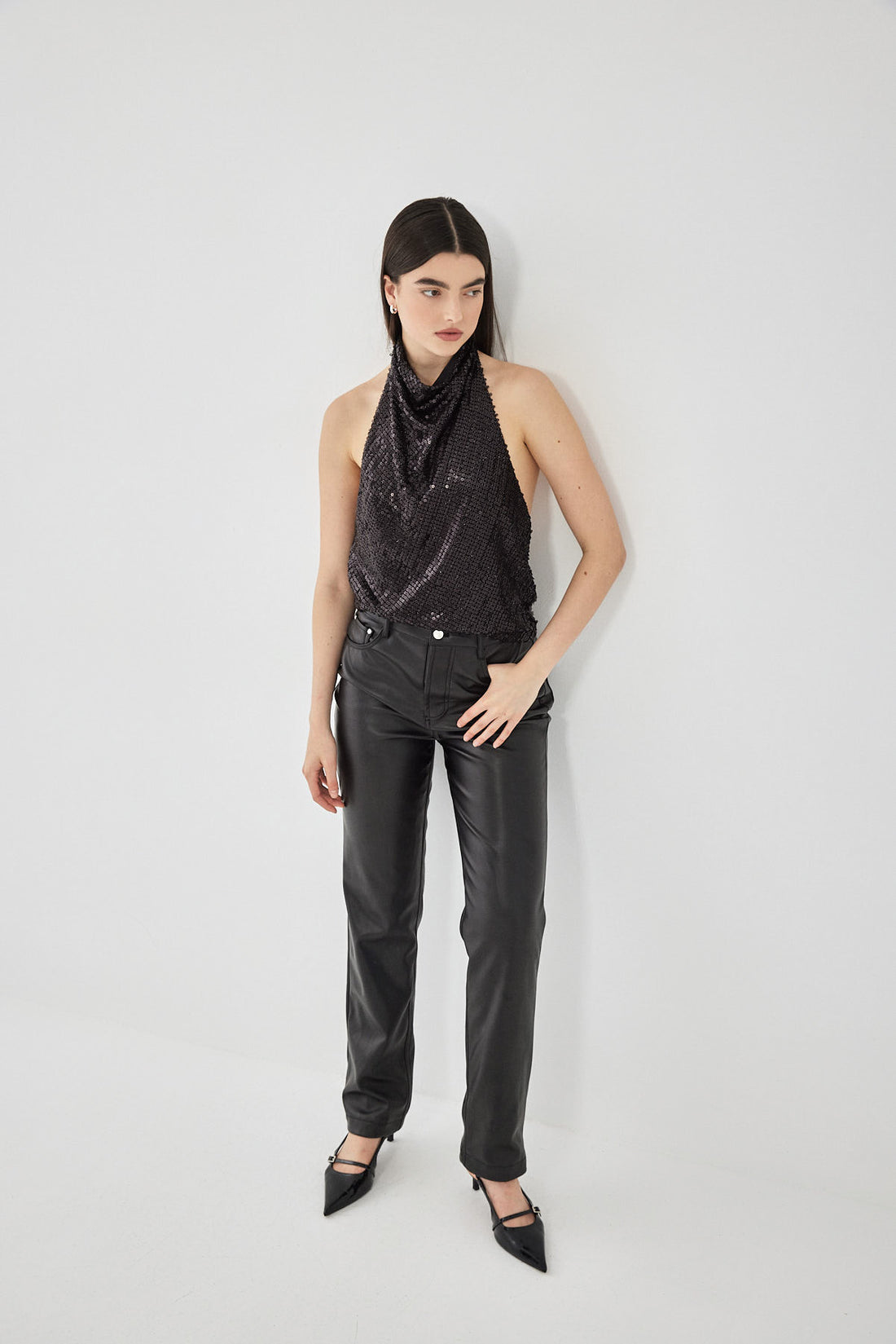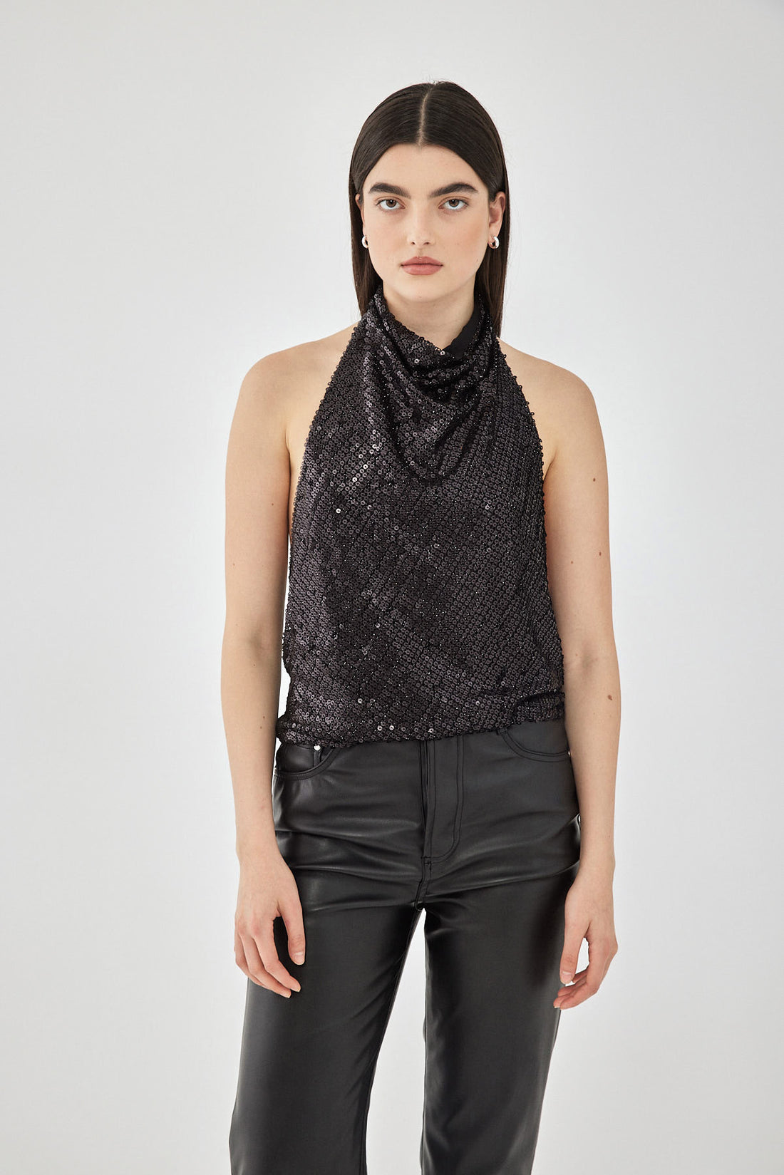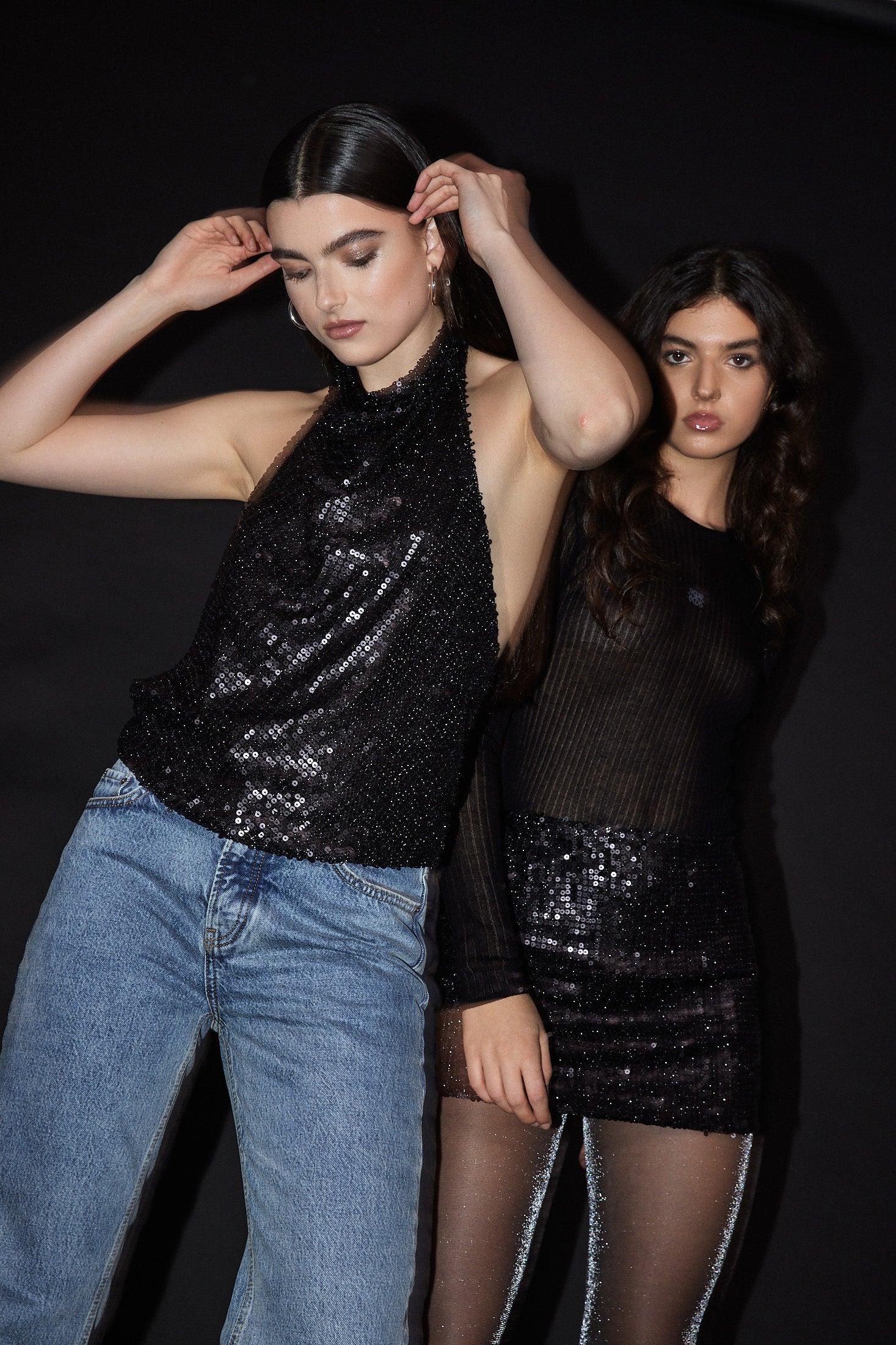 Get ready to party with this absolute showstopper! Deep open back halter sequined top. Button and loop closure at the neckline. Lined. Slight cowl at the back. Style it with the matching mini skirt, a pair of knee high boots and some shiny earrings for the ultimate New Years Eve look!