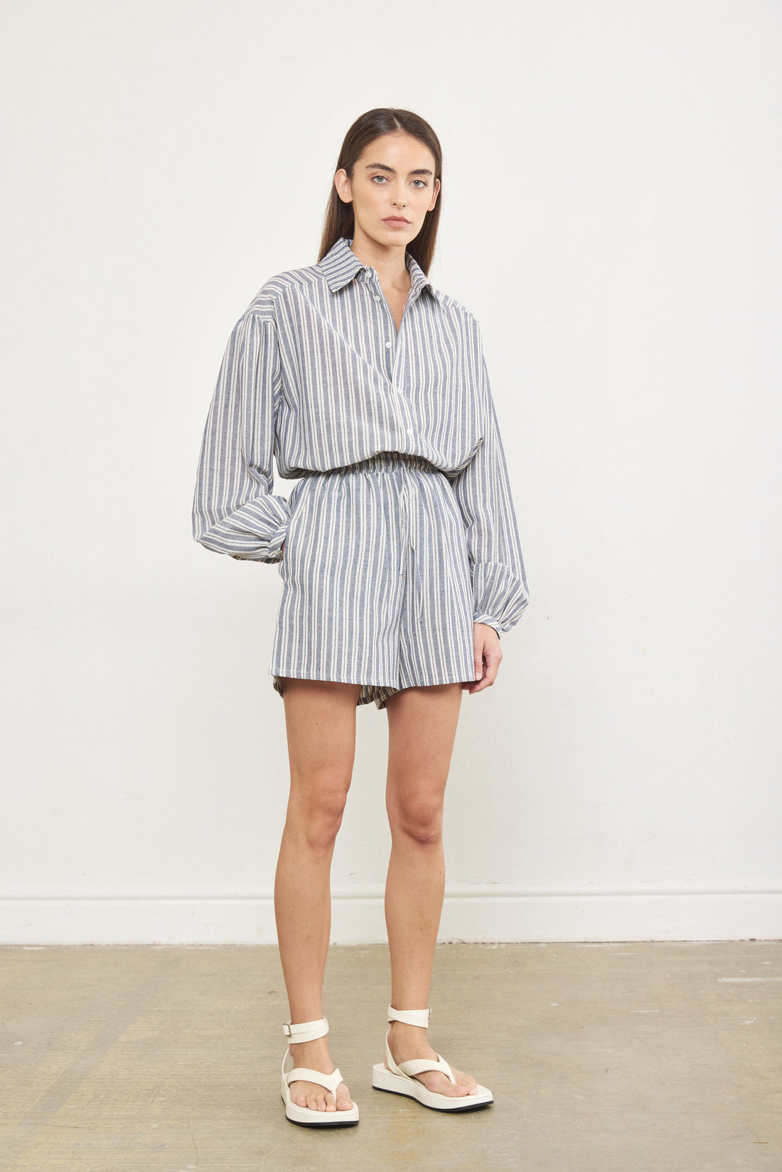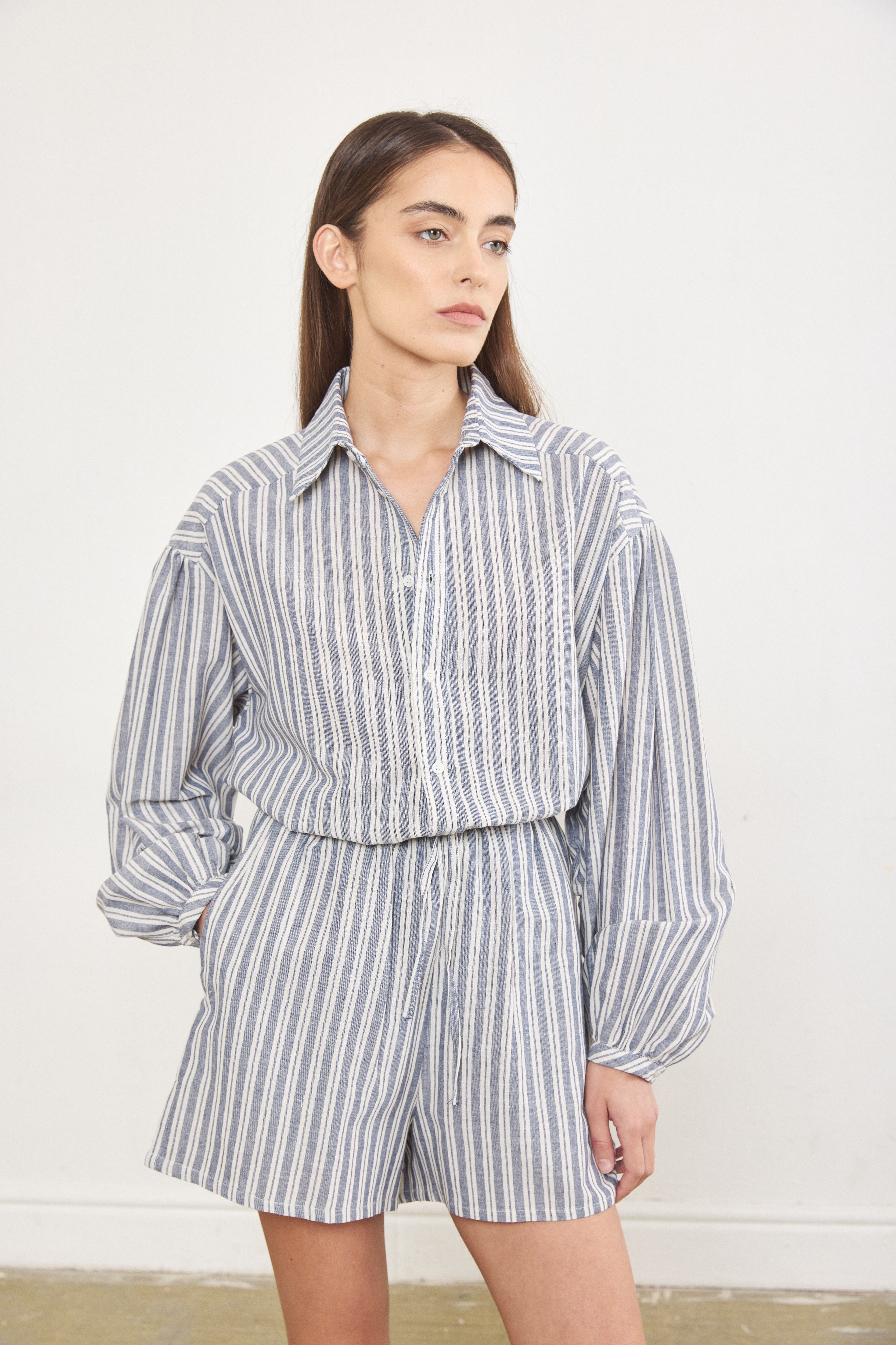 Buttoned down relaxed fit blouse. Lapel collar, long slightly puffed sleeves with small cuffs and a front button closure. Wear with a matching striped linen shorts.