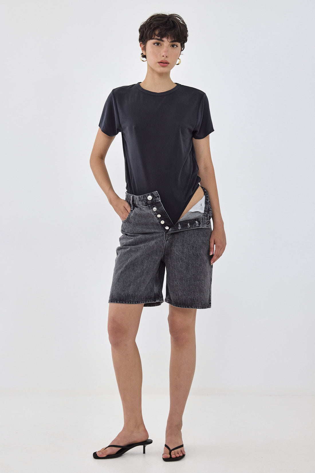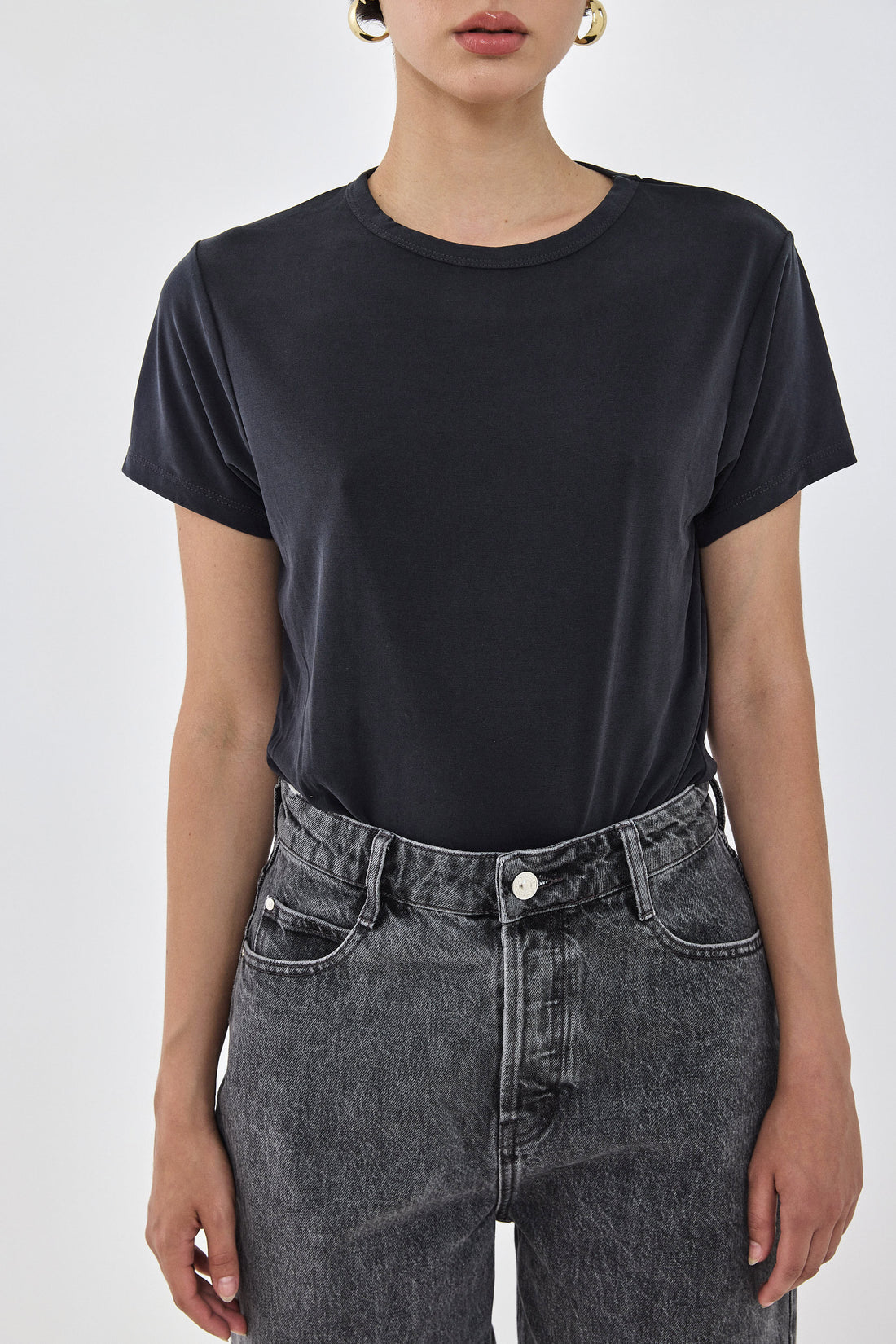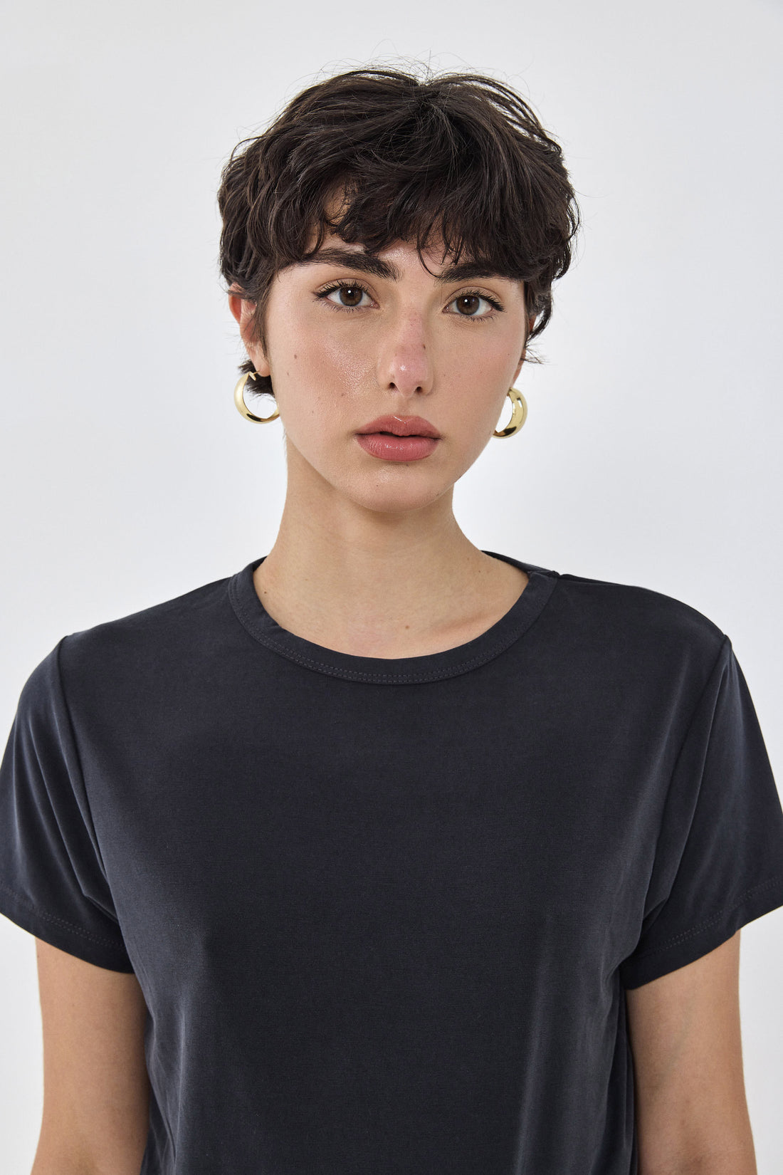 T shirt bodysuit with a crow neckline and short sleeves. Features a double snap-button closure and a thong base. Made from a thin, super soft fabric. Perfect to tuck in any bottom from denim to skirt.