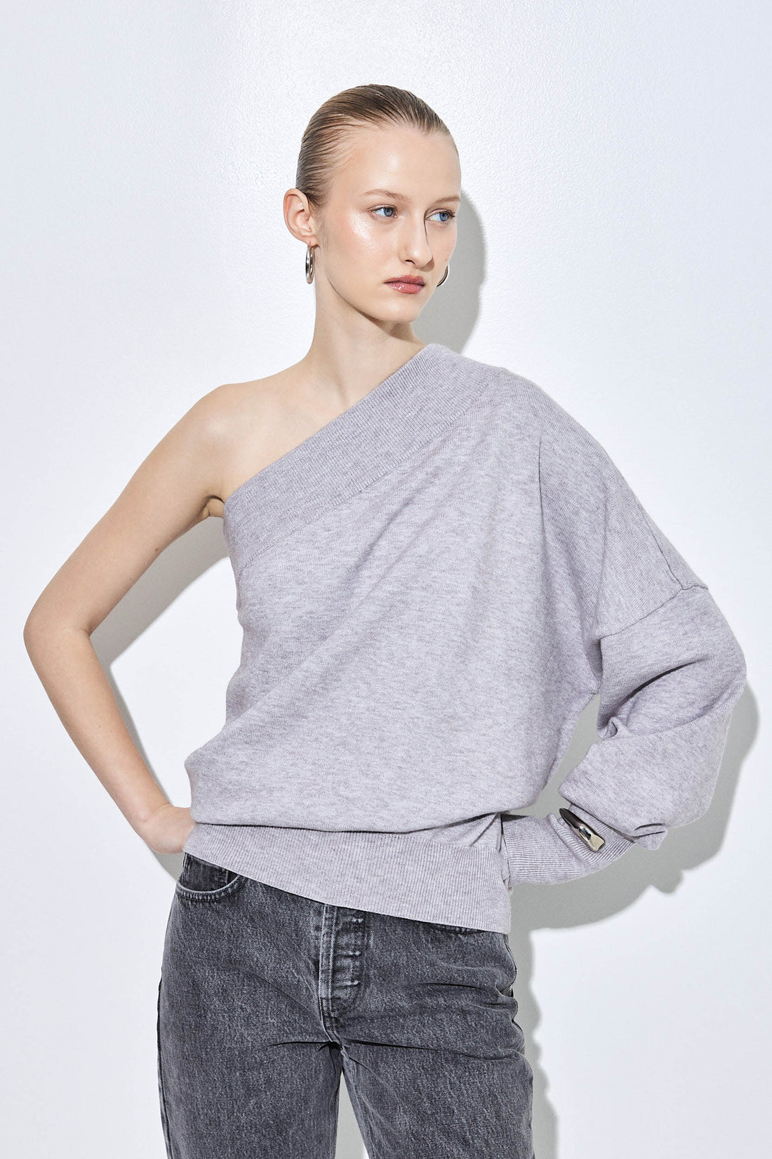 Elevate your fall wardrobe with our new one shoulder jumper. Designed for a sleek and classy look, our knitted one shoulder jumper features an asymmetrical neckline with a single long sleeve for an effortlessly chic silhouette. Ribbed finish. Volumouse Fit. Style it with a pair of our perfect denim, our beautiful clutch and throw our vegan leather bomber on top for a classy yet stylish look.