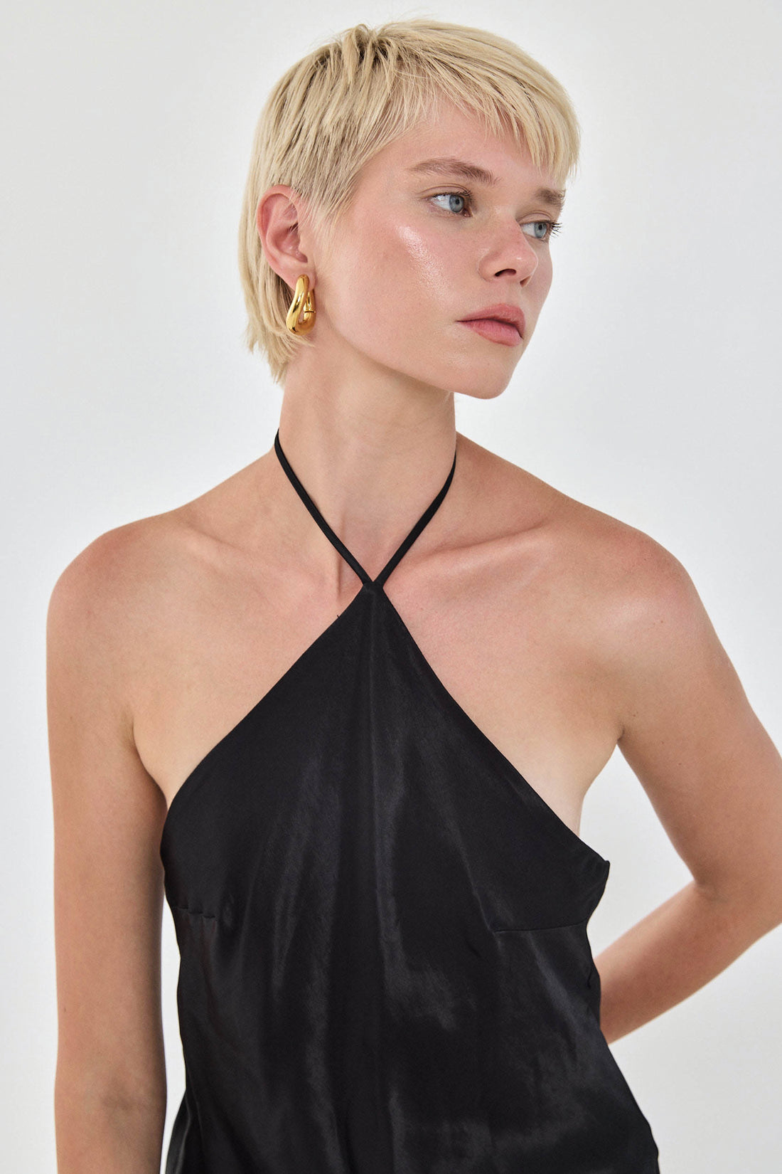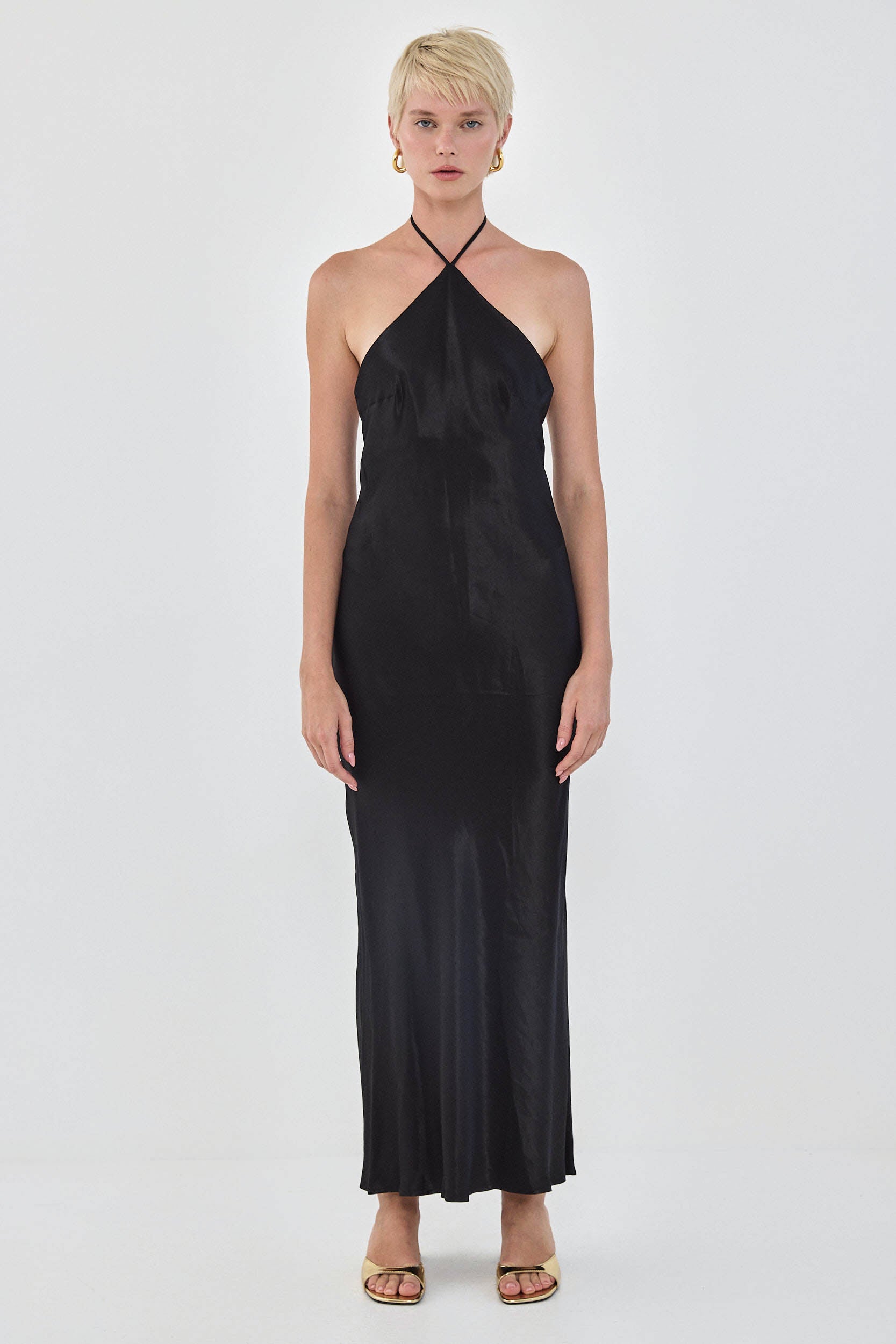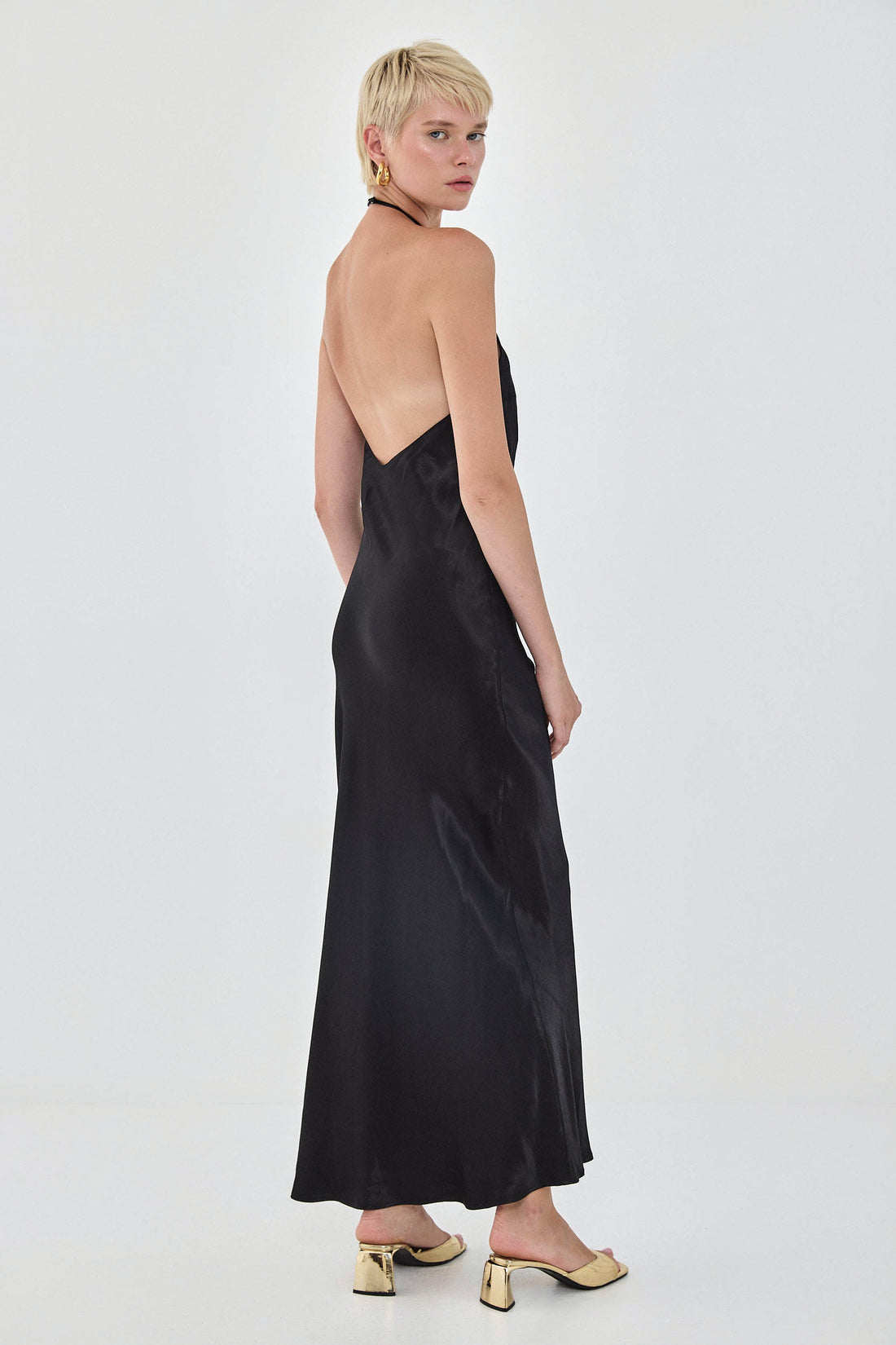 Your new favorite satin dress. Features a crossover neckline and a delicate open back.Maxi length. Cut in a special bias cut technique so that the materials falls smoothly and moves with your body. Style it with your favorite accessories and a pair of sandals for a stylish going out look.