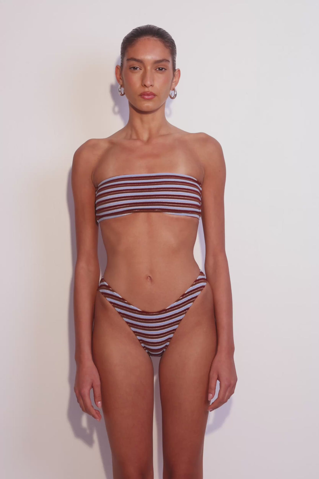 Alsea, named after a graceful water nymph, flows with elegance and ease—just like you in this stunning bikini bottom. Featuring a vintage-inspired striped pattern for a timeless, retro look. Made from ultra-soft towel fabric that flatters your curves and hugs your body for a sleek, effortless fit. Classic cut with full coverage. Features delicate stitching for a refined finish. Can be adjusted to be low waisted or mid waisted. Features a silver logo detailing on the back. Lined. Style it with our beautiful Petra top, our wide leg poplin pants, our buttoned down poplin shirt and finish it with our cool scrunchie for the most perfect beachside look.