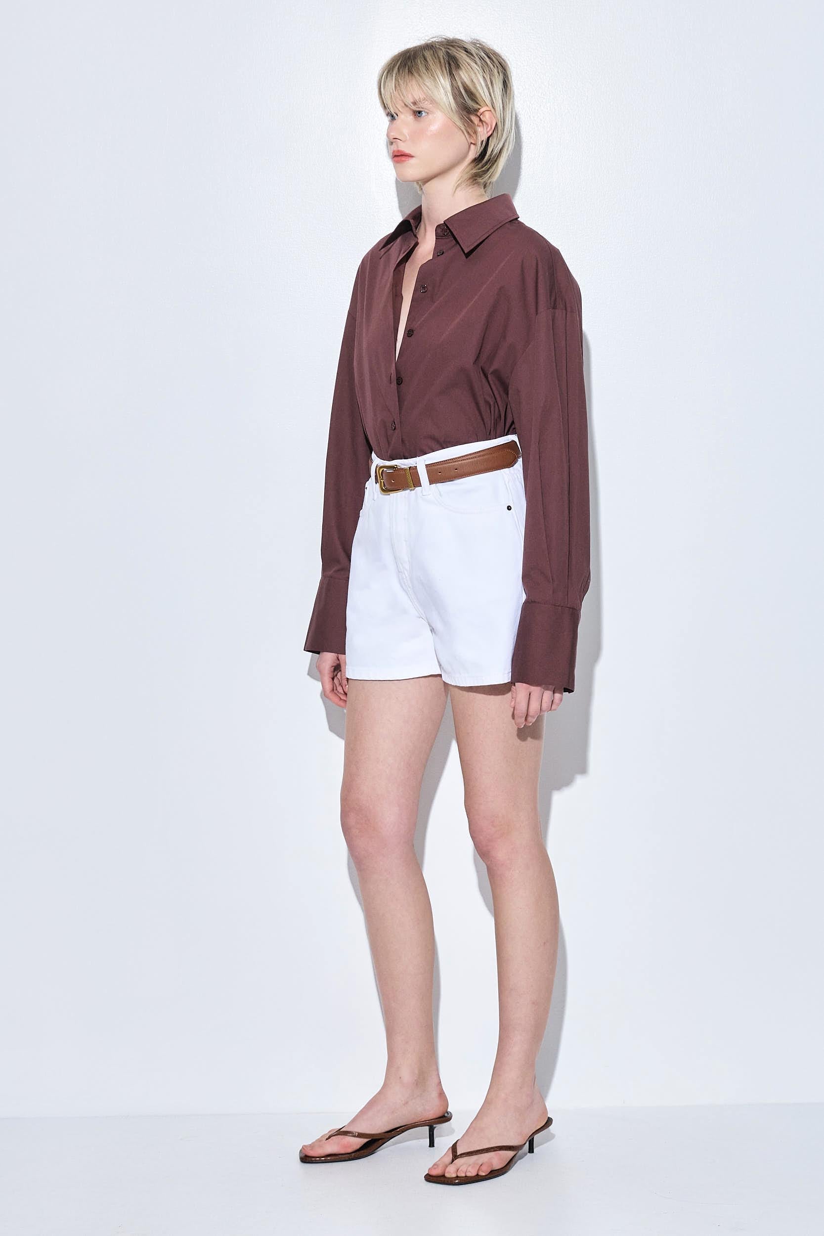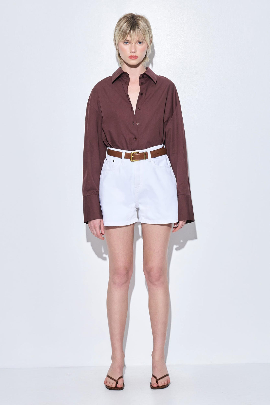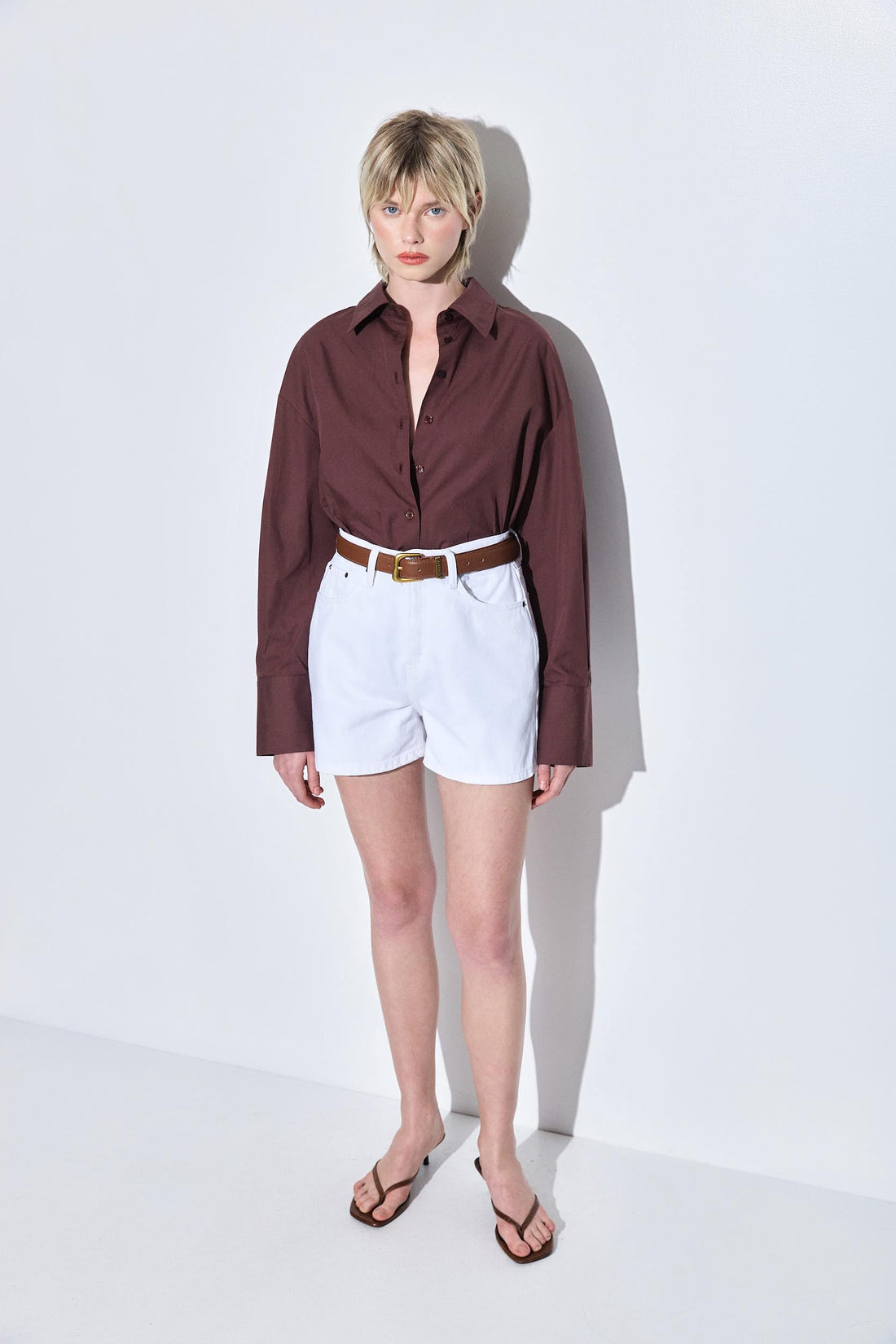 Our denim shorts feature a high waisted baggy fit. Front button closure. Features a logo detail embroidered at the back pocket. The perfect versatile pair of denim shorts, can be styled up or down. Style it with a basic t shirt, your favorite shoulder bag and a pair of slides for an effortlessly chic everyday look.
