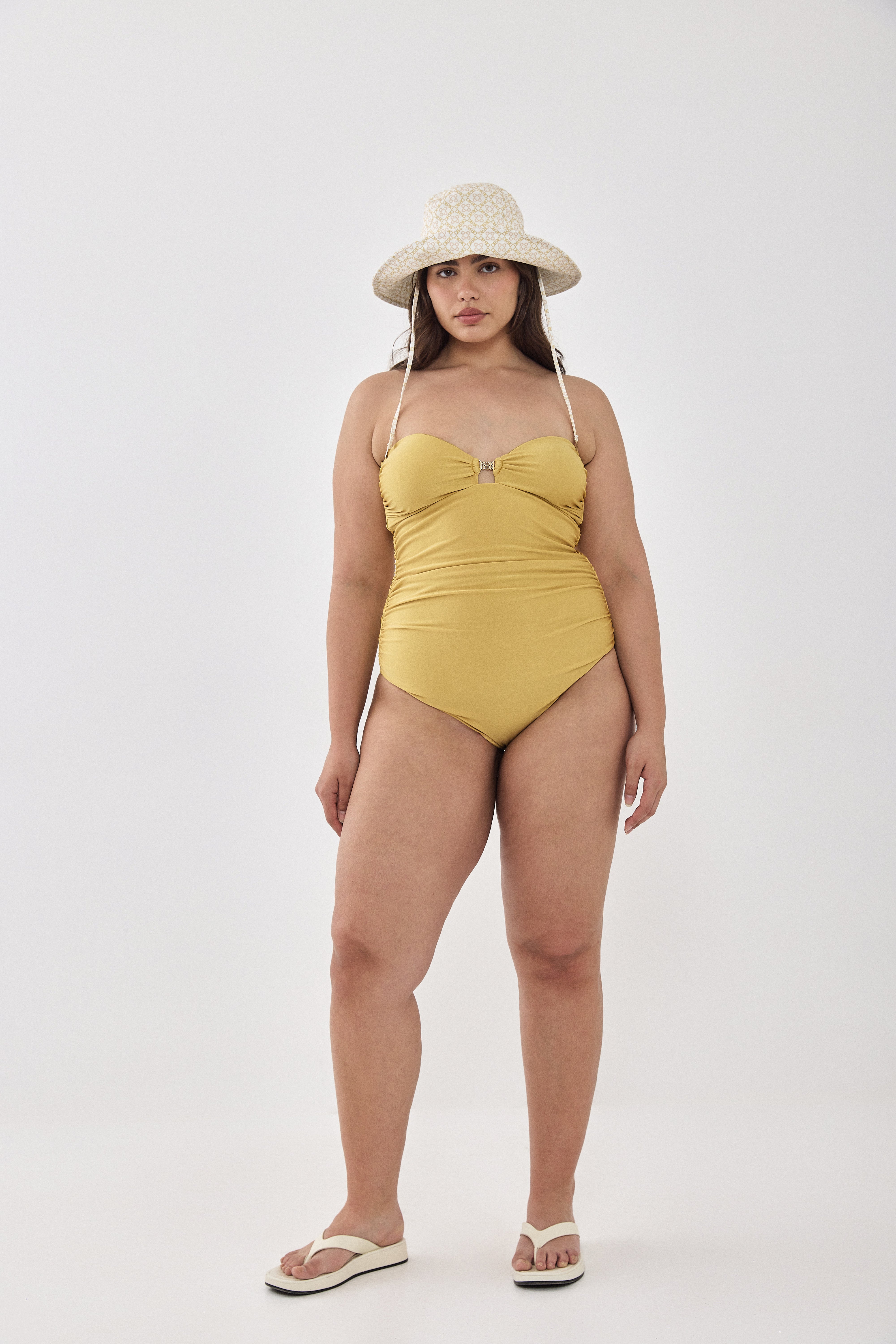 One of our chicest one pieces this collection. Strapless. Made from luxurious soft Italian fabric that is ultra flattering and body hugging. Gorgeous shiny fabric. Featuring a centered golden logo buckle detail. Double lined. Wiring at the sides for extra support. Gathering detailing along the side seams. Gathering detailing at the top center. Internal silicone band along the top part for extra grip and support. Seamless at the top. Mid rise leg opening. Style it with your favorite summer scarf, aviator sunnies and a pair of slides for the perfect summer look that will have you feeling like you're at the Italian Riveria.