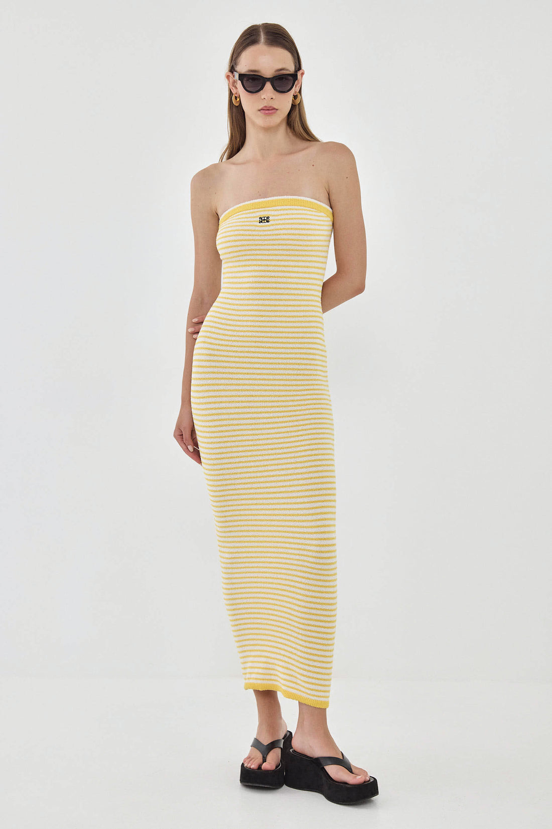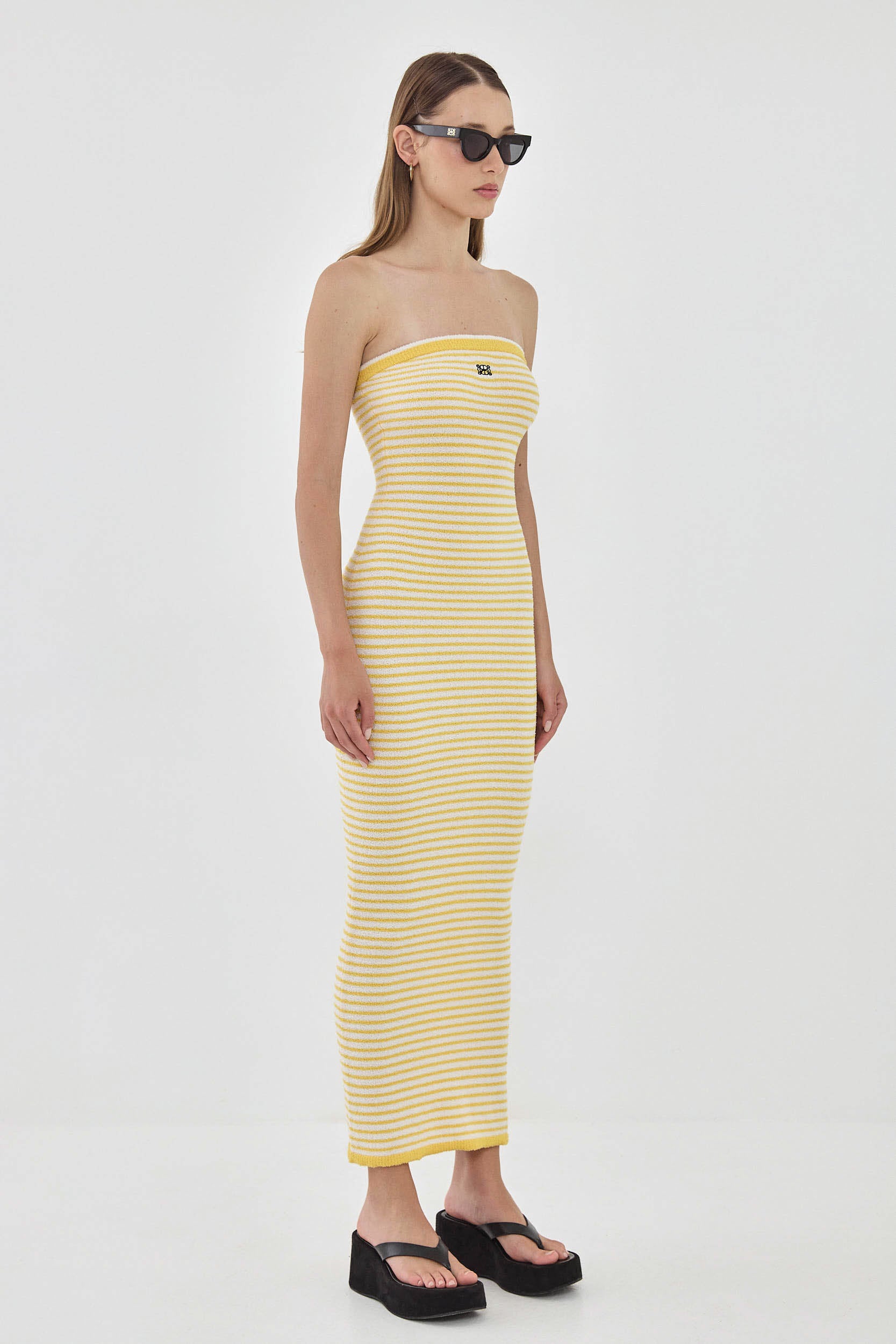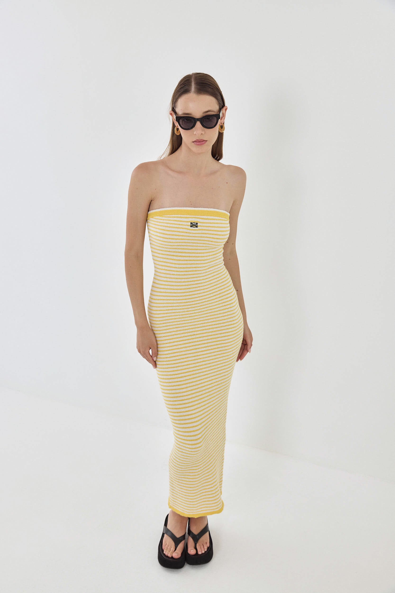 This strapless maxi dress will have you feeling like you're in the dreamy French Riviera. Elastic at the chest for extra grip. Body hugging. Made from the coziest boucle fabric. Strapless neckline. Maxi length. Embroidered logo detailing on the front. Contrast striped ribbed finish. Style it with your favorite chunky slides, golden accessories and a rattan bag for the perfect effortless summer look.