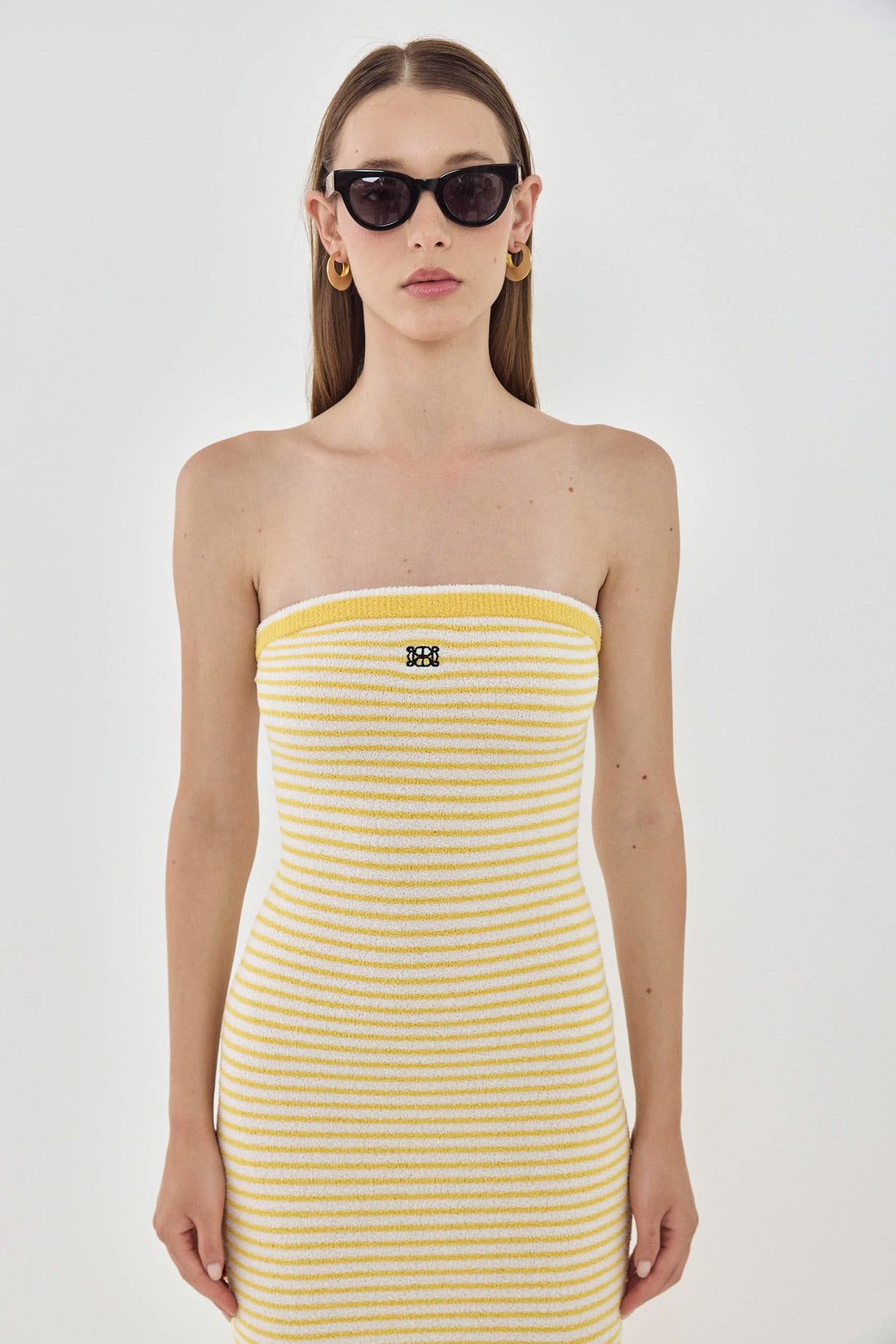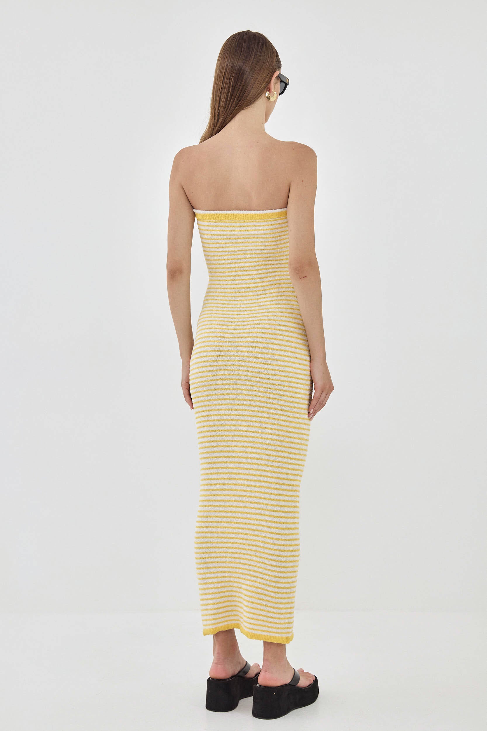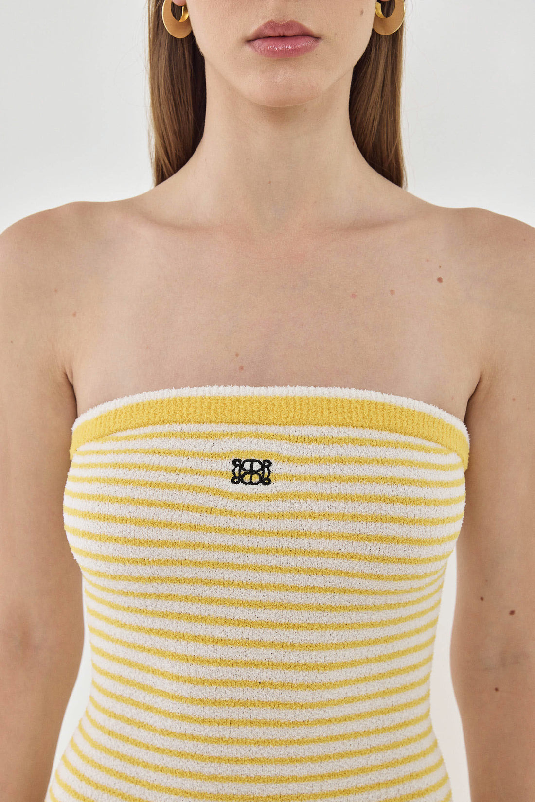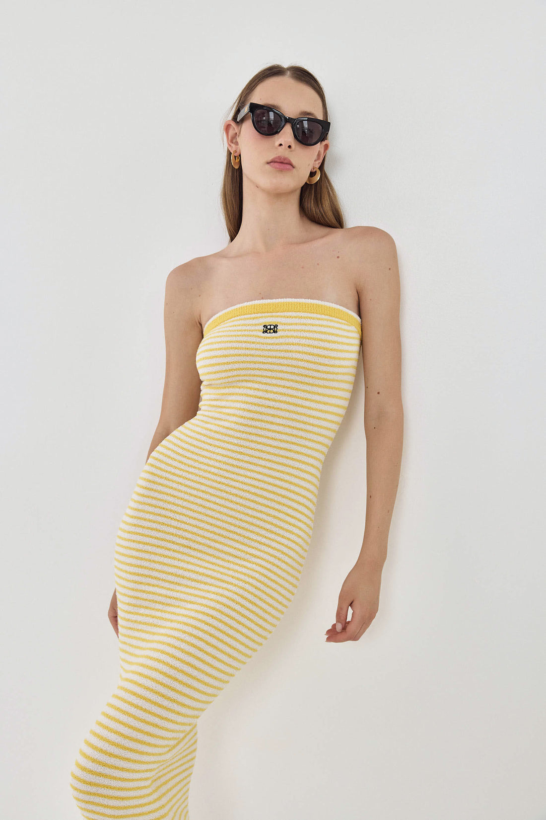 This strapless maxi dress will have you feeling like you're in the dreamy French Riviera. Elastic at the chest for extra grip. Body hugging. Made from the coziest boucle fabric. Strapless neckline. Maxi length. Embroidered logo detailing on the front. Contrast striped ribbed finish. Style it with your favorite chunky slides, golden accessories and a rattan bag for the perfect effortless summer look.