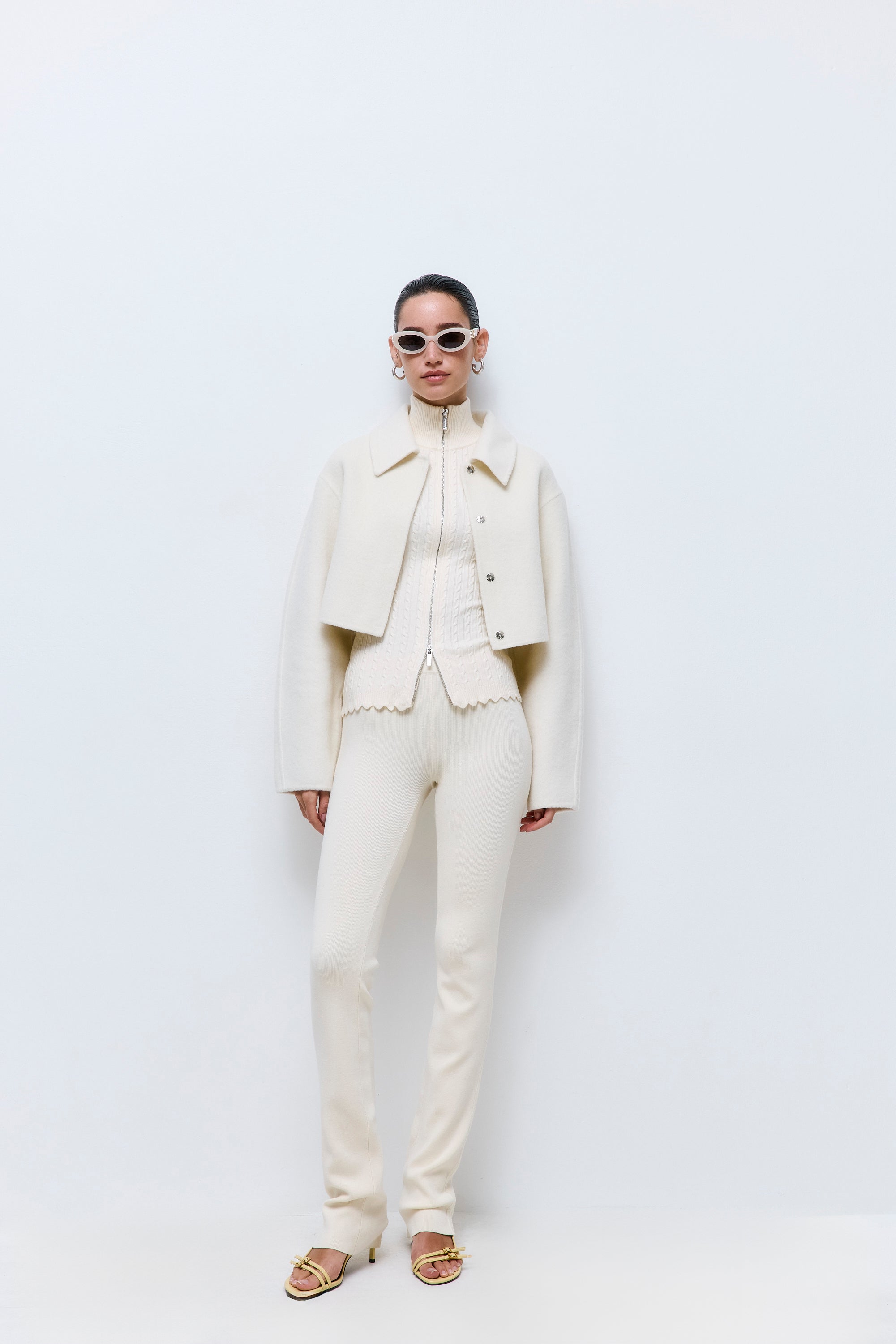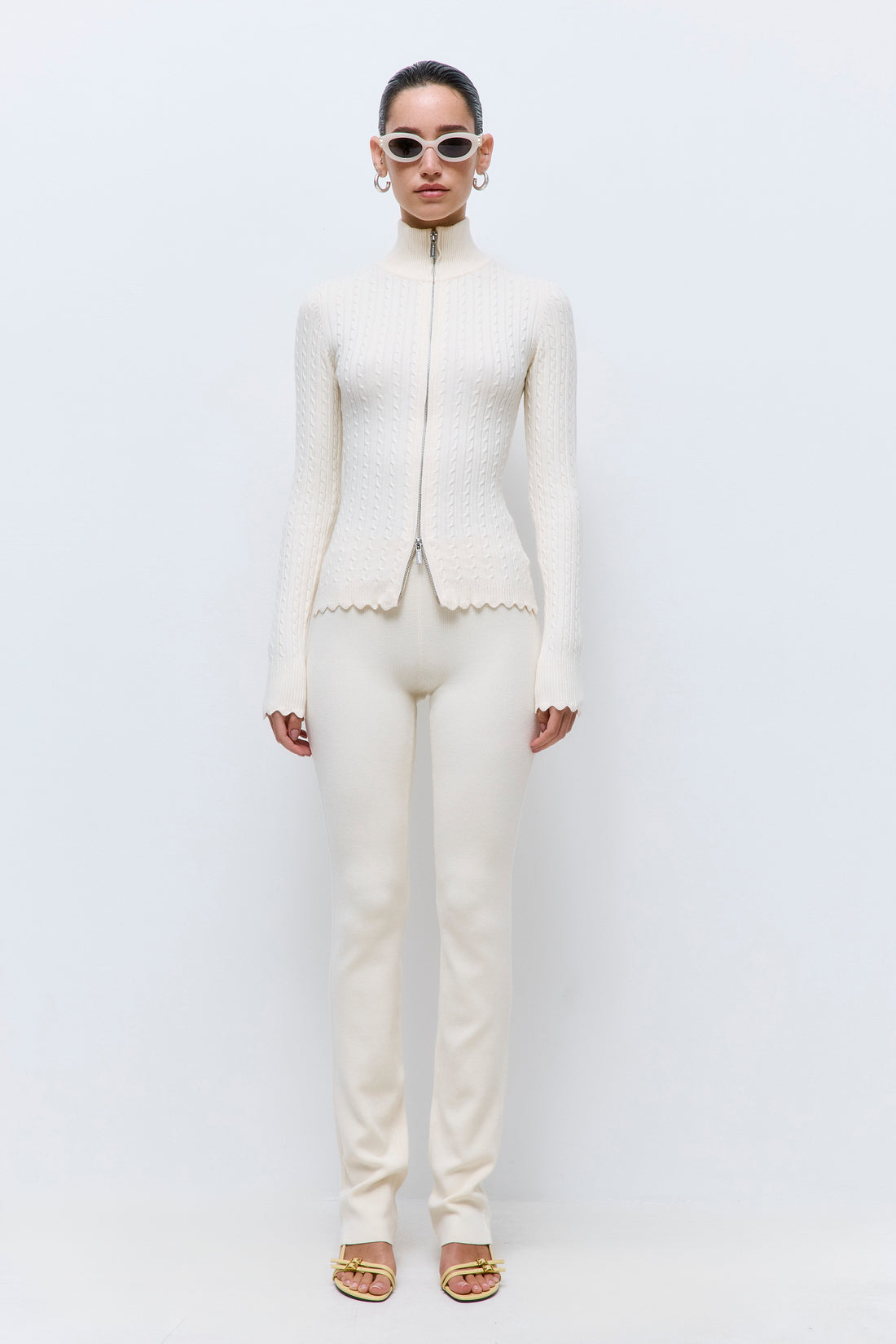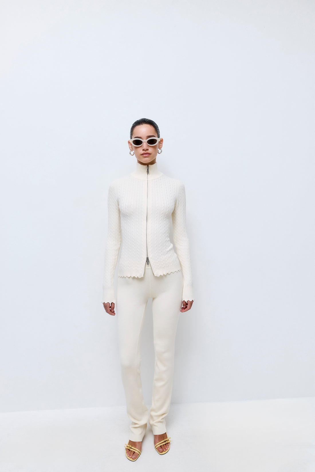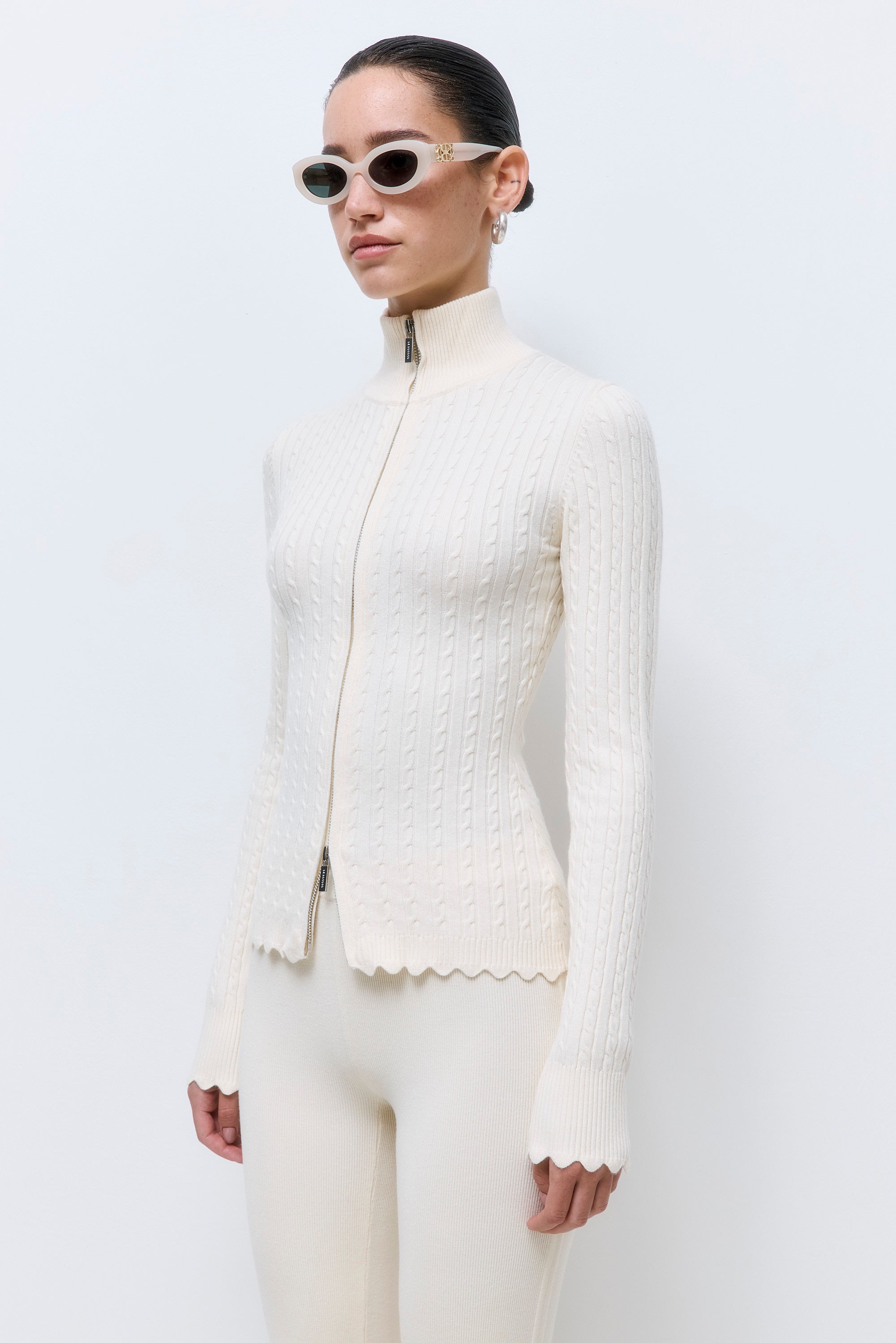 Our new cool-girl Fitted Cable Knit Cardigan is your buttery-soft essential for effortless style. Fitted silhouette. Featuring a double logo zipper that opens from both ends. Can be worn open or closed, as you please. Fully fashioned. Finished with a ribbed collar, cuffs, and hem. Wavy detailing along the sleeves and hem. Pair it with our iconic No. 15 Denim and our luxurious Jackie Sunglasses for a versatile look.