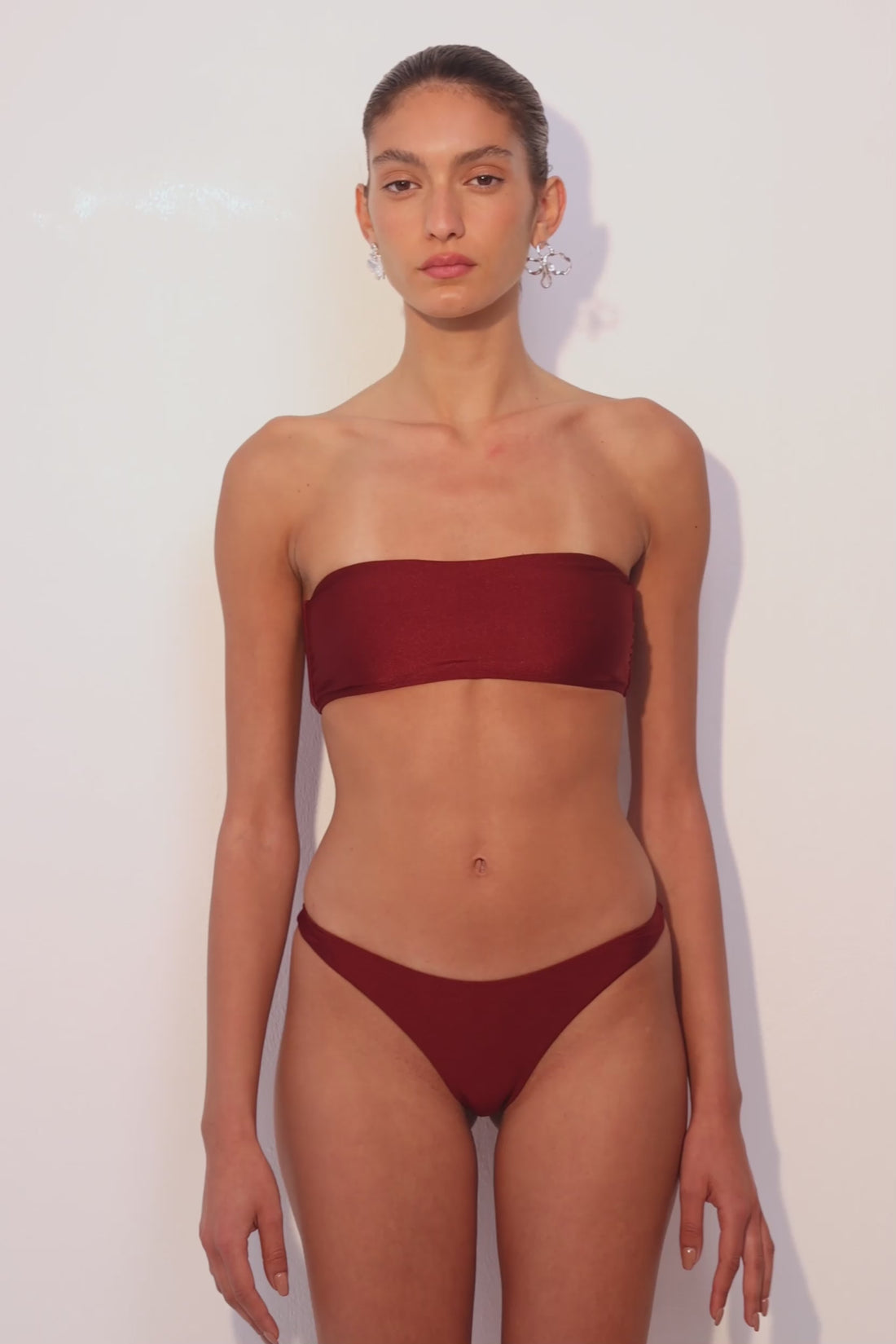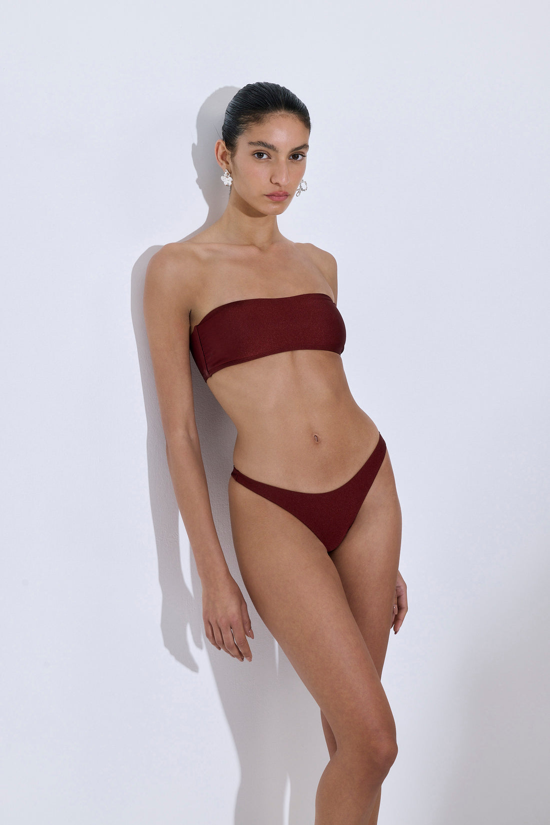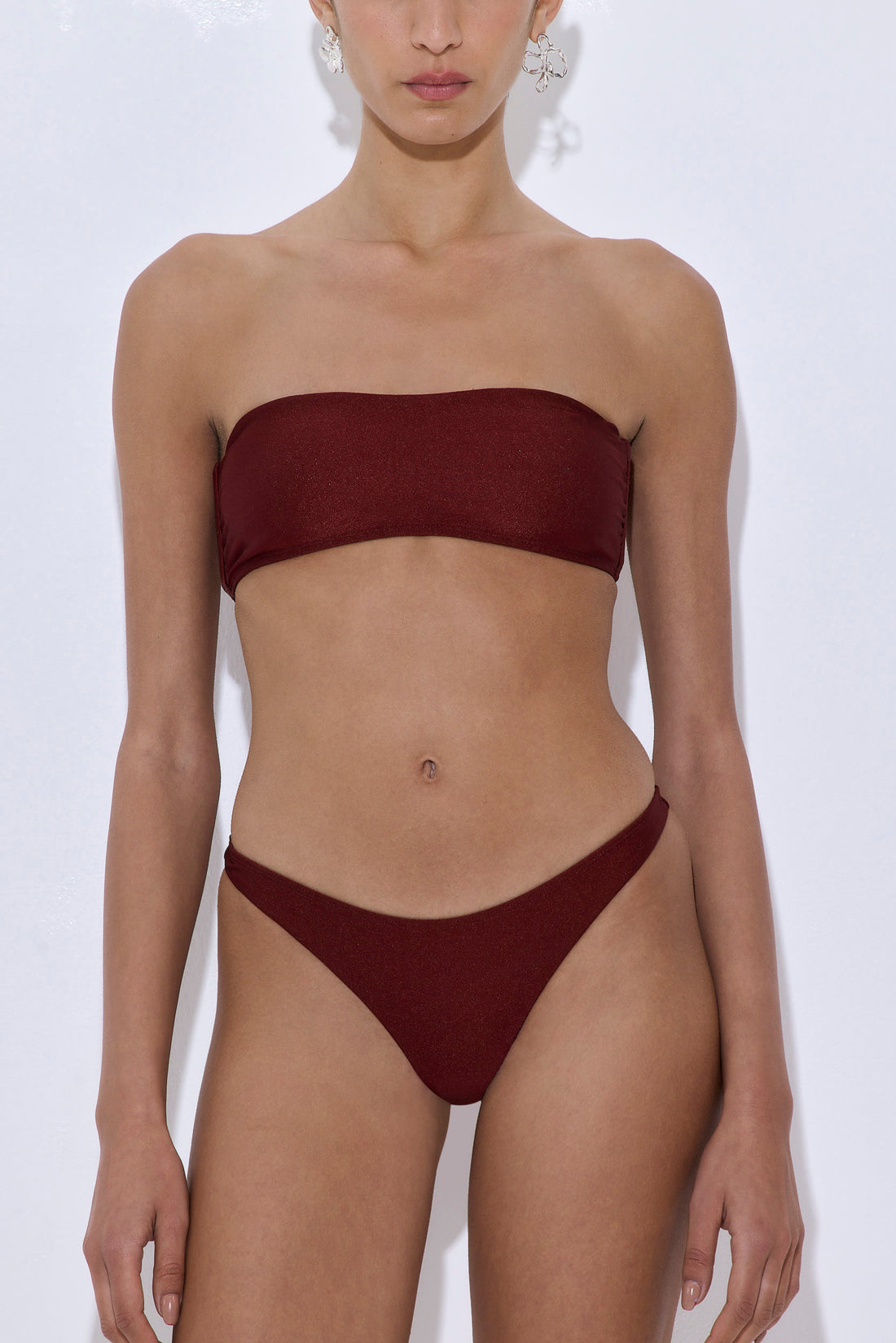 Calla, inspired by the elegant Calla lily, embodies refined simplicity and effortless beauty. Made from luxurious shiny Italian fabric that fit perfectly to your body, offering a sleek and supportive fit. Strapless bandeau design for a clean, modern silhouette. An internal silicone band along the top for a secure fit. Wiring at the sides for extra support. Gathering detailing along the side seams. Features a silver metallic logo detailing on the back. Lined. Style it with our beautiful Maia bottom, our new poplin maxi dress and your favorite scrunchie for a chic and effortless poolside look.