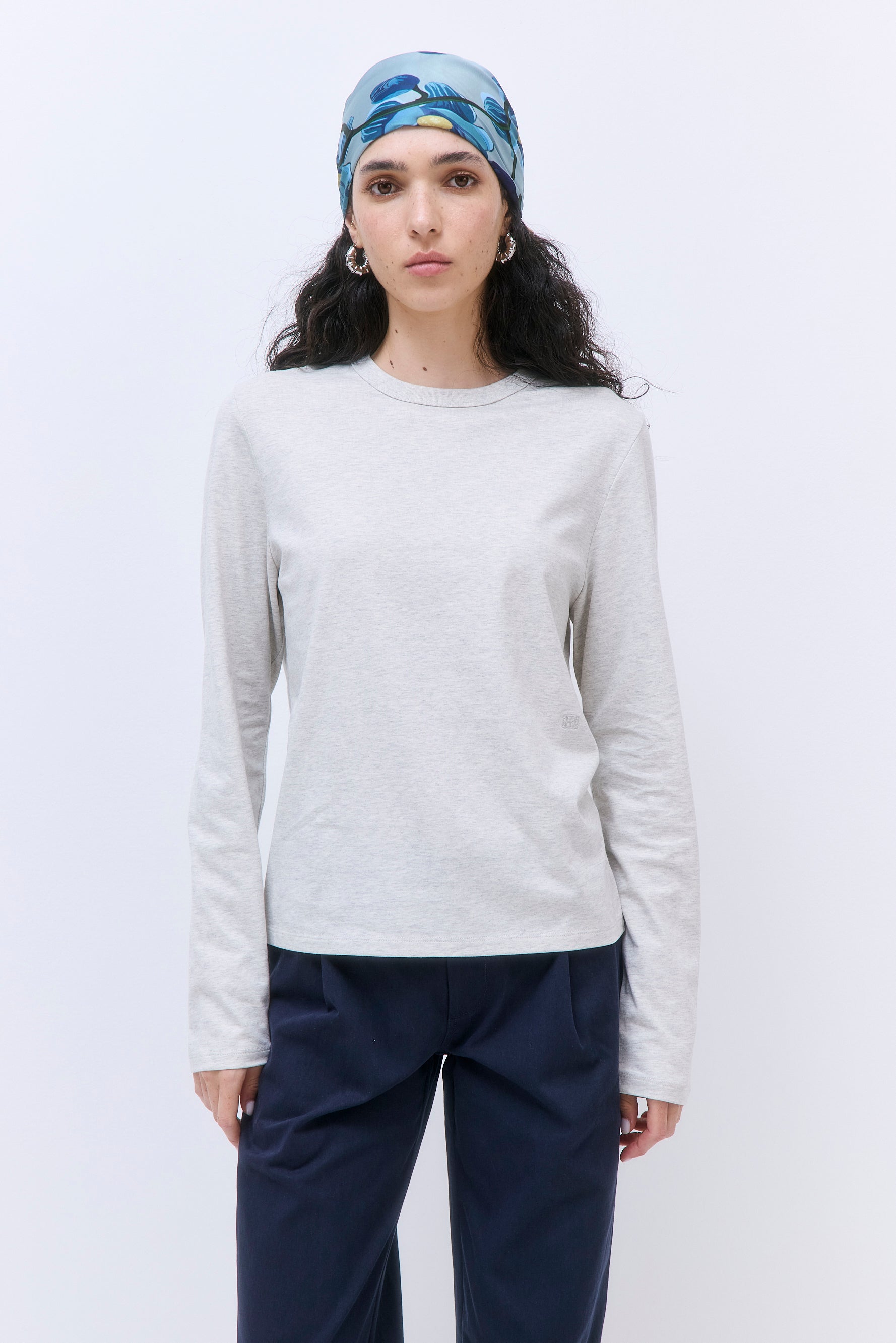 Our Classic Long Sleeve T Shirt is an iconic addition to our basics family. Crafted from crispy cotton. Loose fit. Long sleeves. Crew neckline. Tonal embroidered logo in the front, mid waist. Style it with our capsule Wide Leg Cotton Pants and chic Oval Sunglasses for a refined look.